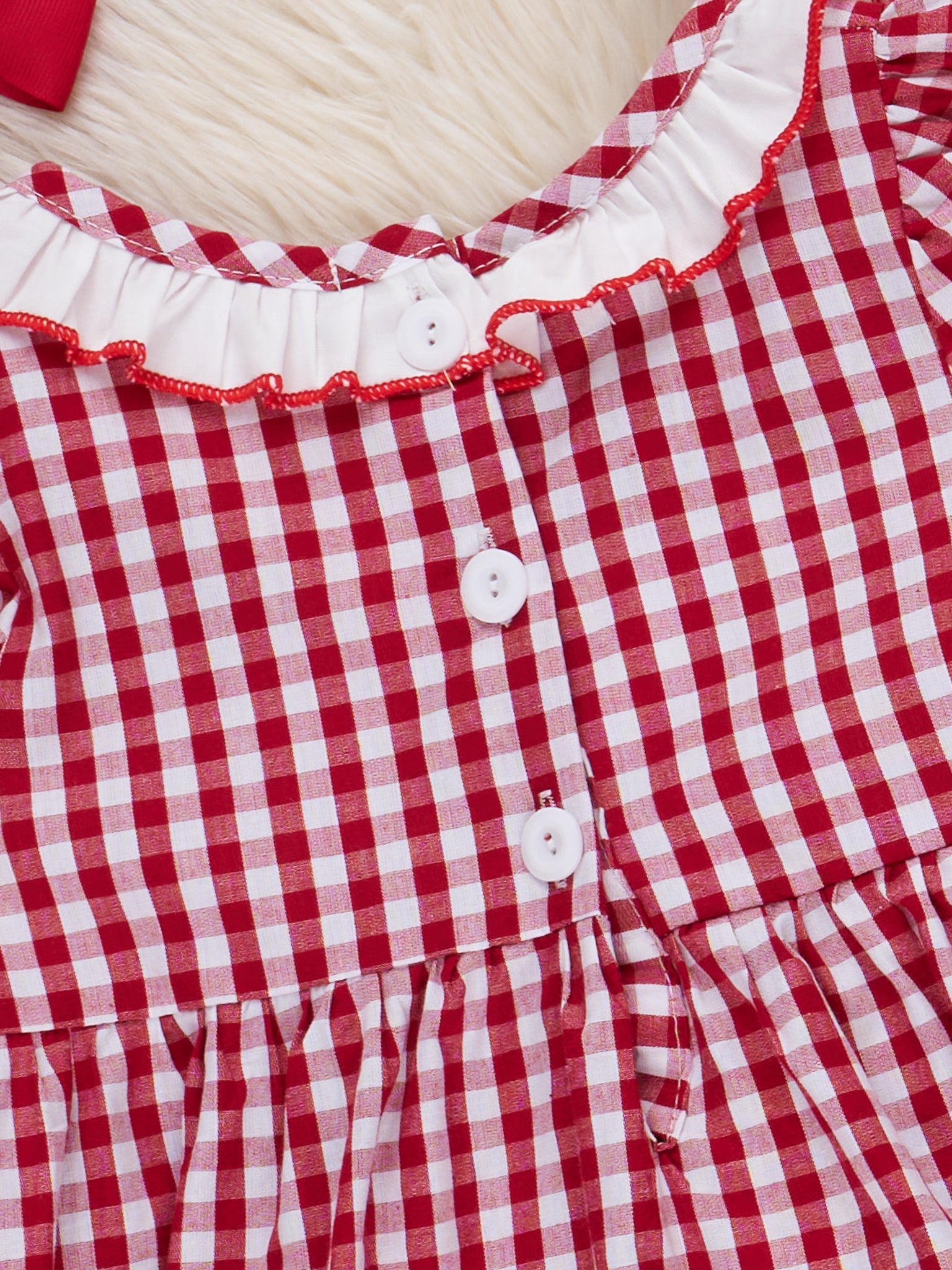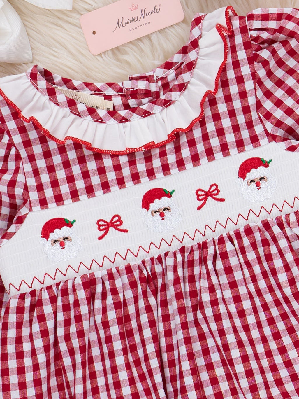 The Moments with Santa Smocked Cotton Dress by Marie Nicole Clothing features a festive plaid pattern with hand-smocked Santa accents on the bodice. Designed with long sleeves and classic ruffle details, this dress brings vintage-inspired charm and comfort to holiday celebrations.