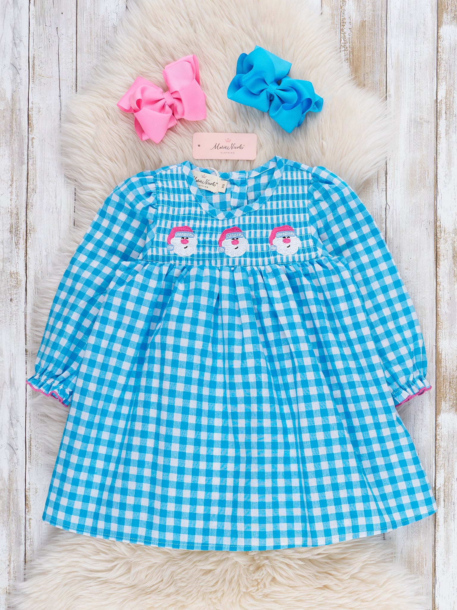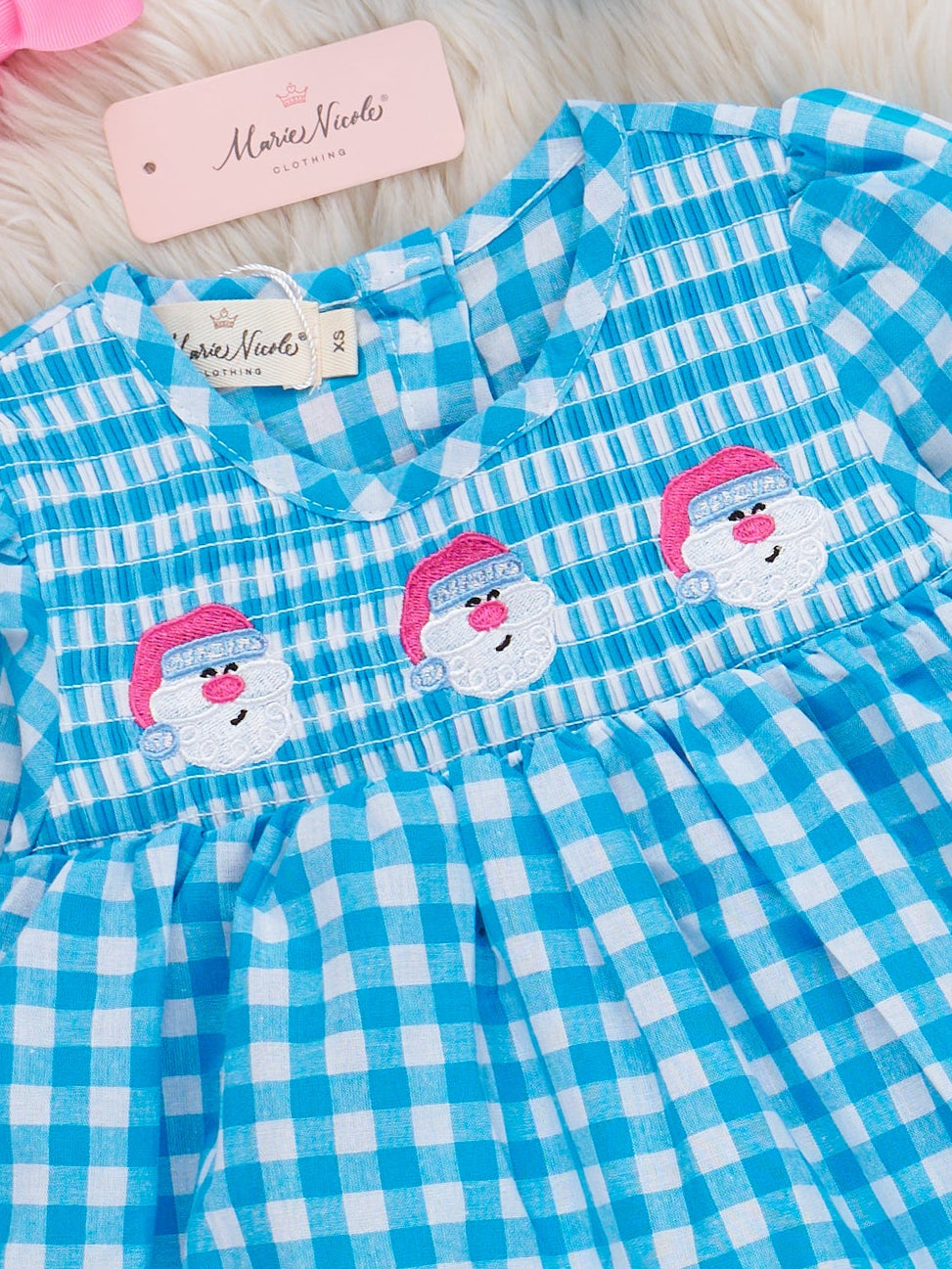 The Santa's Beard Smocked Dress by Marie Nicole features a classic checked pattern with a row of festive Santa face embroidery along the smocked bodice. Crafted for comfortable movement and cheerful gatherings, this dress brings joyful charm to seasonal occasions and timeless style for holiday celebrations.