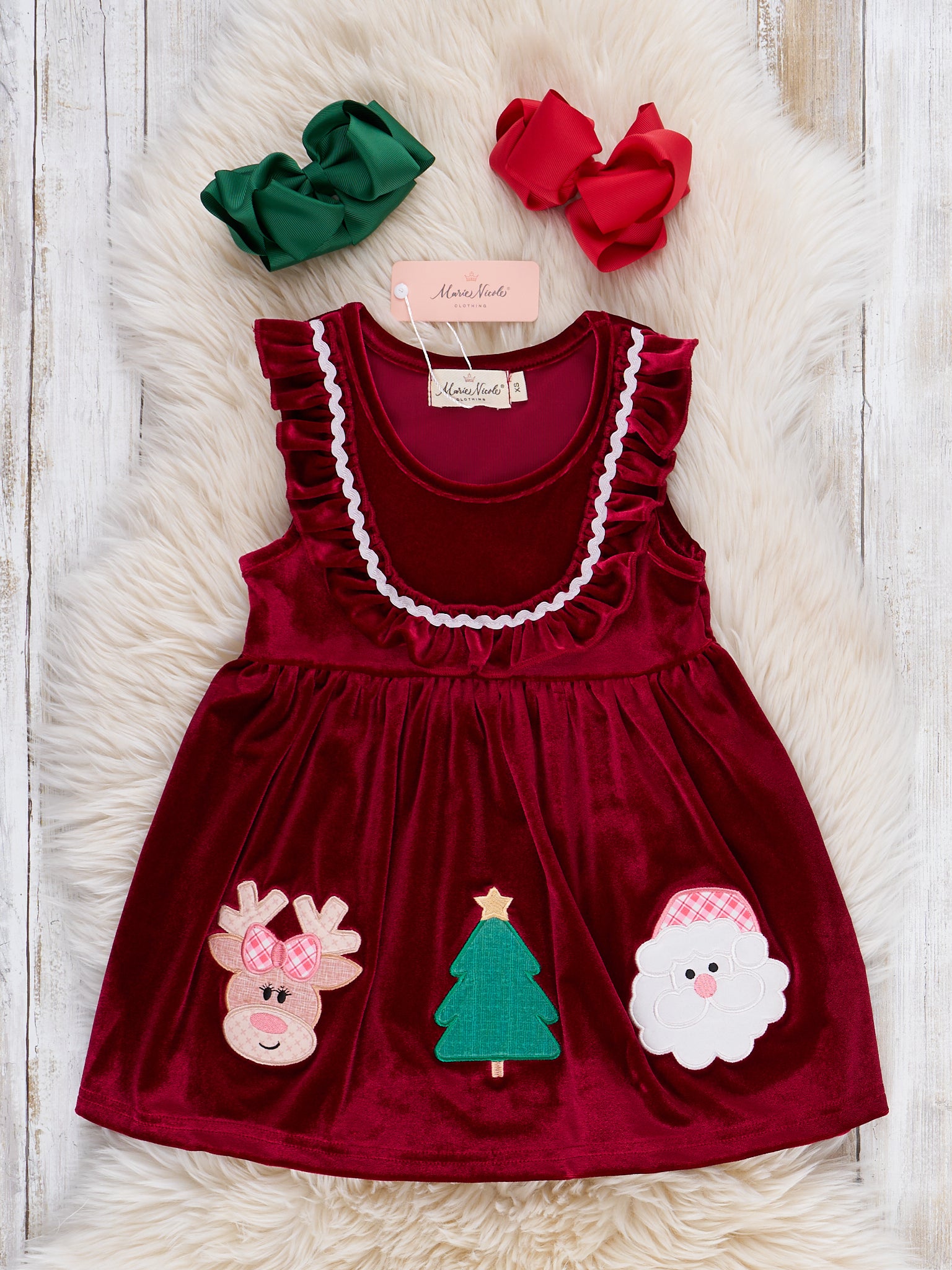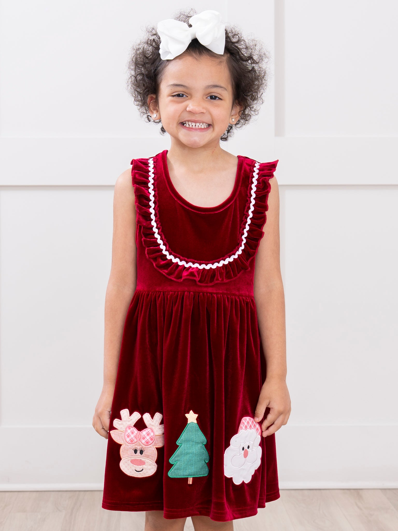 The Santa's Little Helper Embroidered Velvet Dress by Marie Nicole features charming appliques of a reindeer, Christmas tree, and Santa, with a ruffled sleeveless silhouette and delicate trim along the neckline. Its soft velvet fabric and gathered skirt make this dress festive, comfortable, and ideal for holiday celebrations.