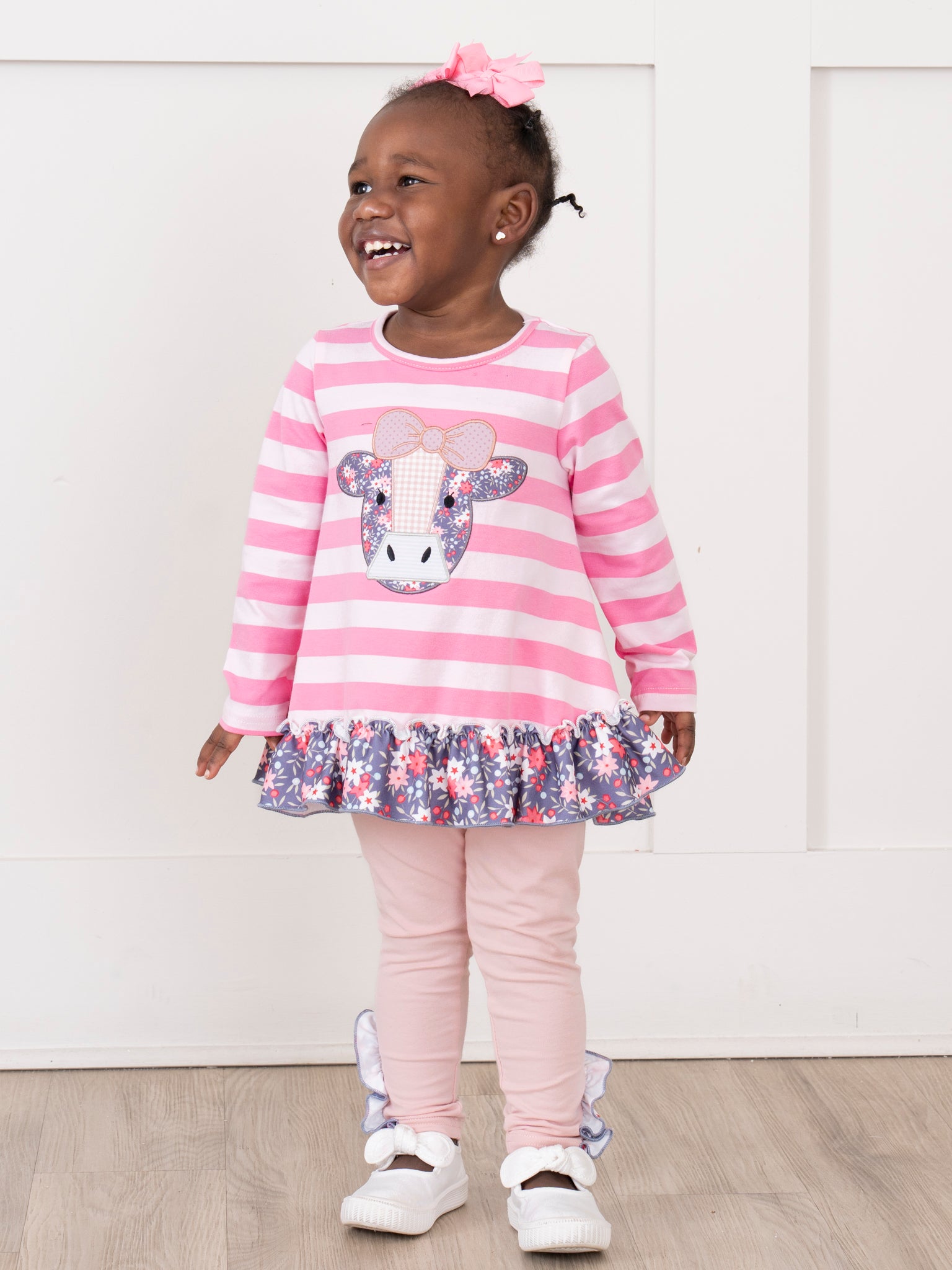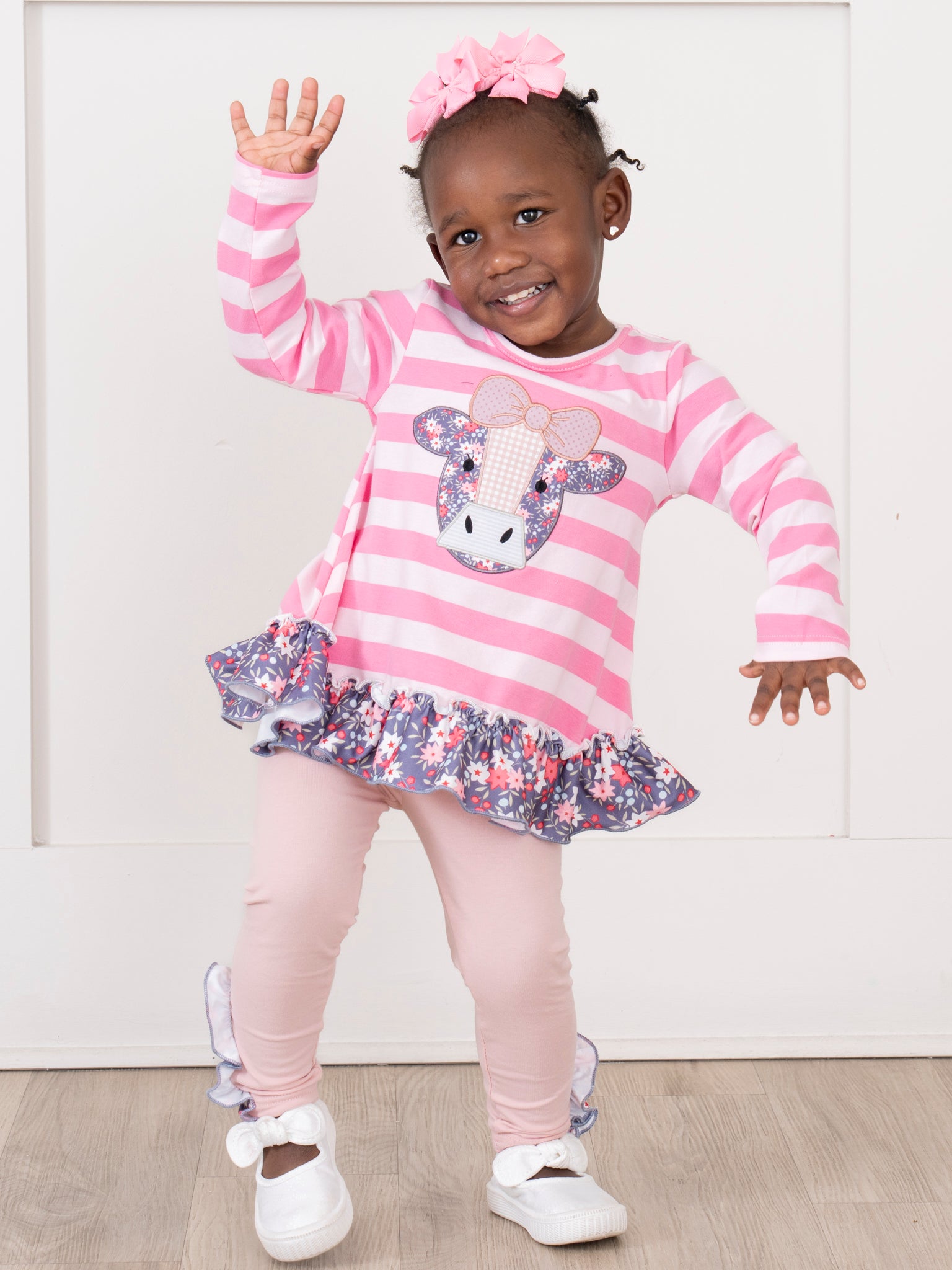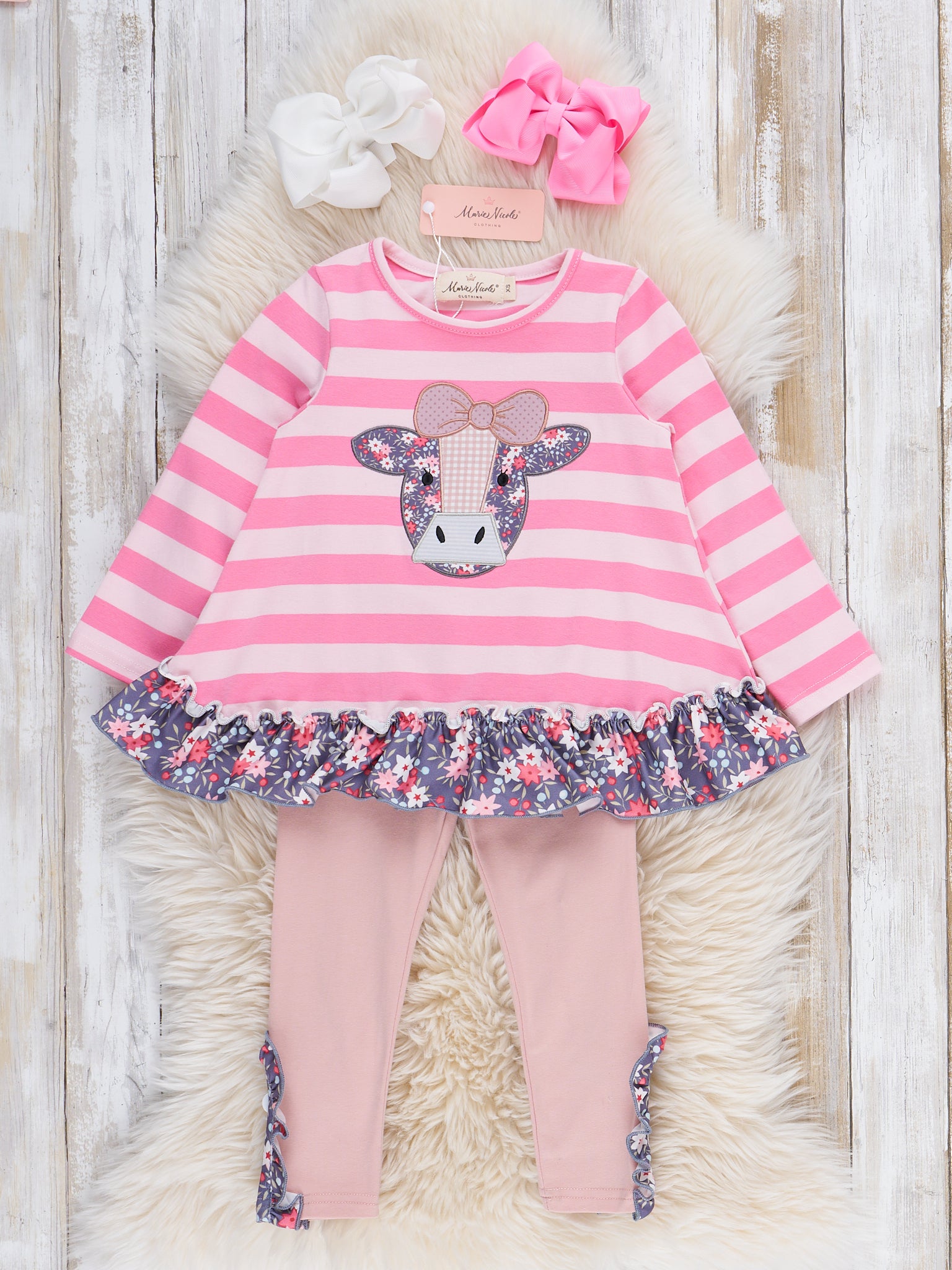 The Sweet Cowgirl Embroidered Striped Outfit by Marie Nicole Clothing features a playful cow applique on a ruffle-trimmed striped top, paired with matching soft leggings that have floral ruffle details at the ankles. This set combines comfort and country-inspired charm, making it ideal for fun days, photos, or outings on the ranch.