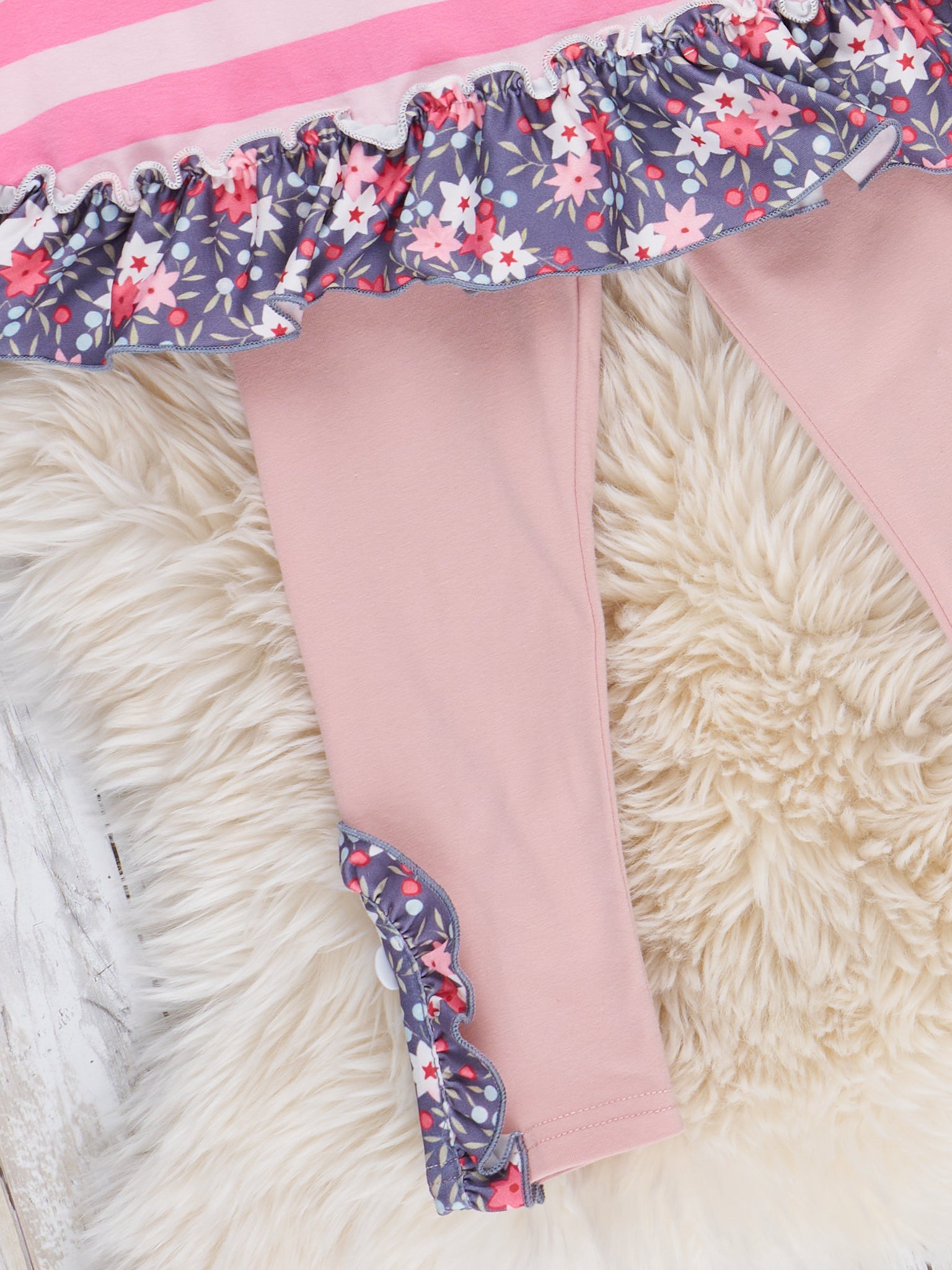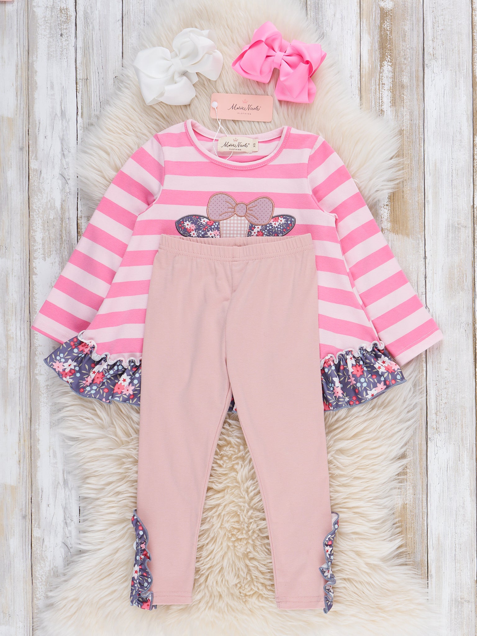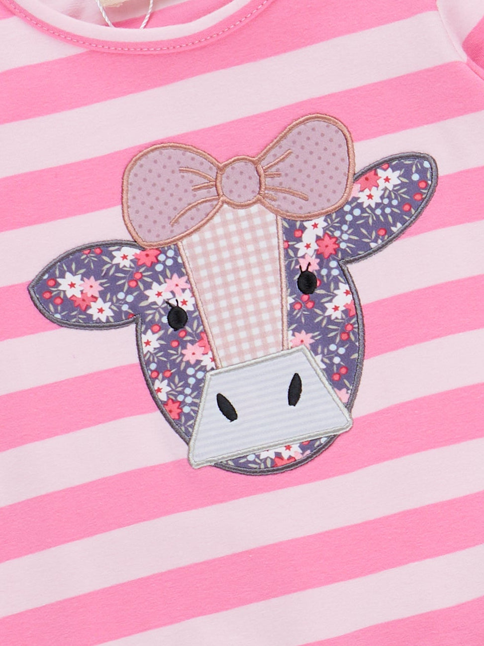 The Sweet Cowgirl Embroidered Striped Outfit by Marie Nicole Clothing features a playful cow applique on a ruffle-trimmed striped top, paired with matching soft leggings that have floral ruffle details at the ankles. This set combines comfort and country-inspired charm, making it ideal for fun days, photos, or outings on the ranch.