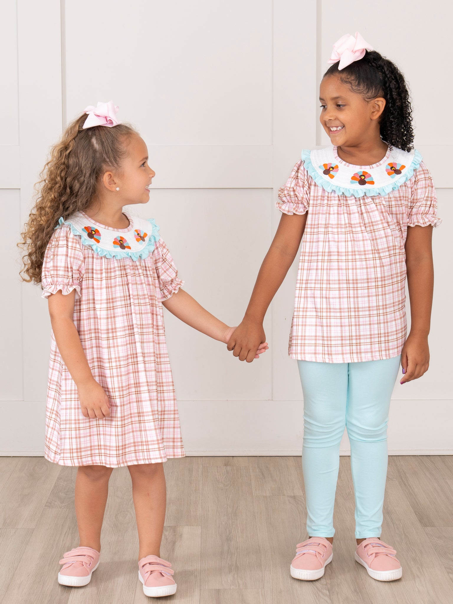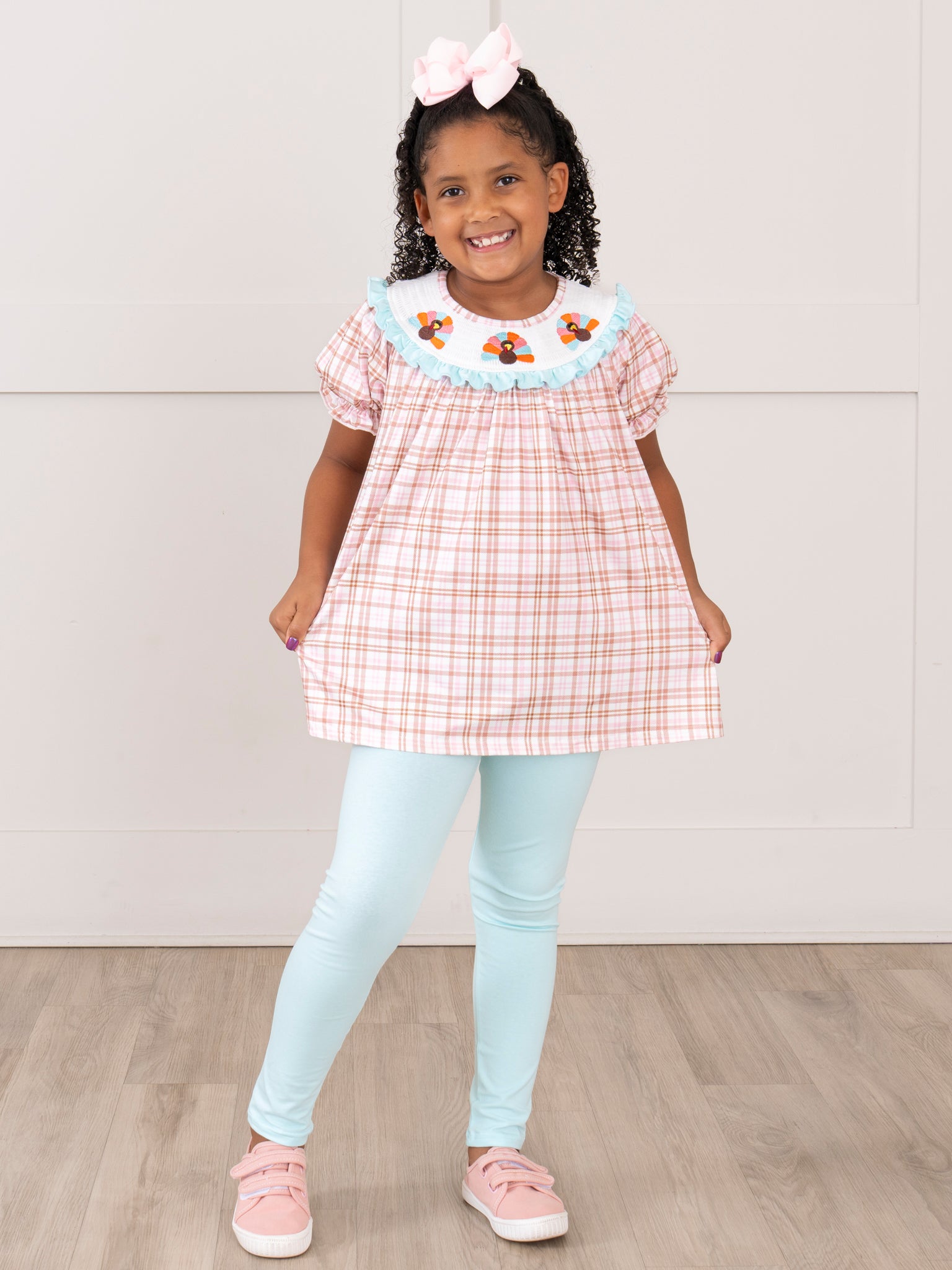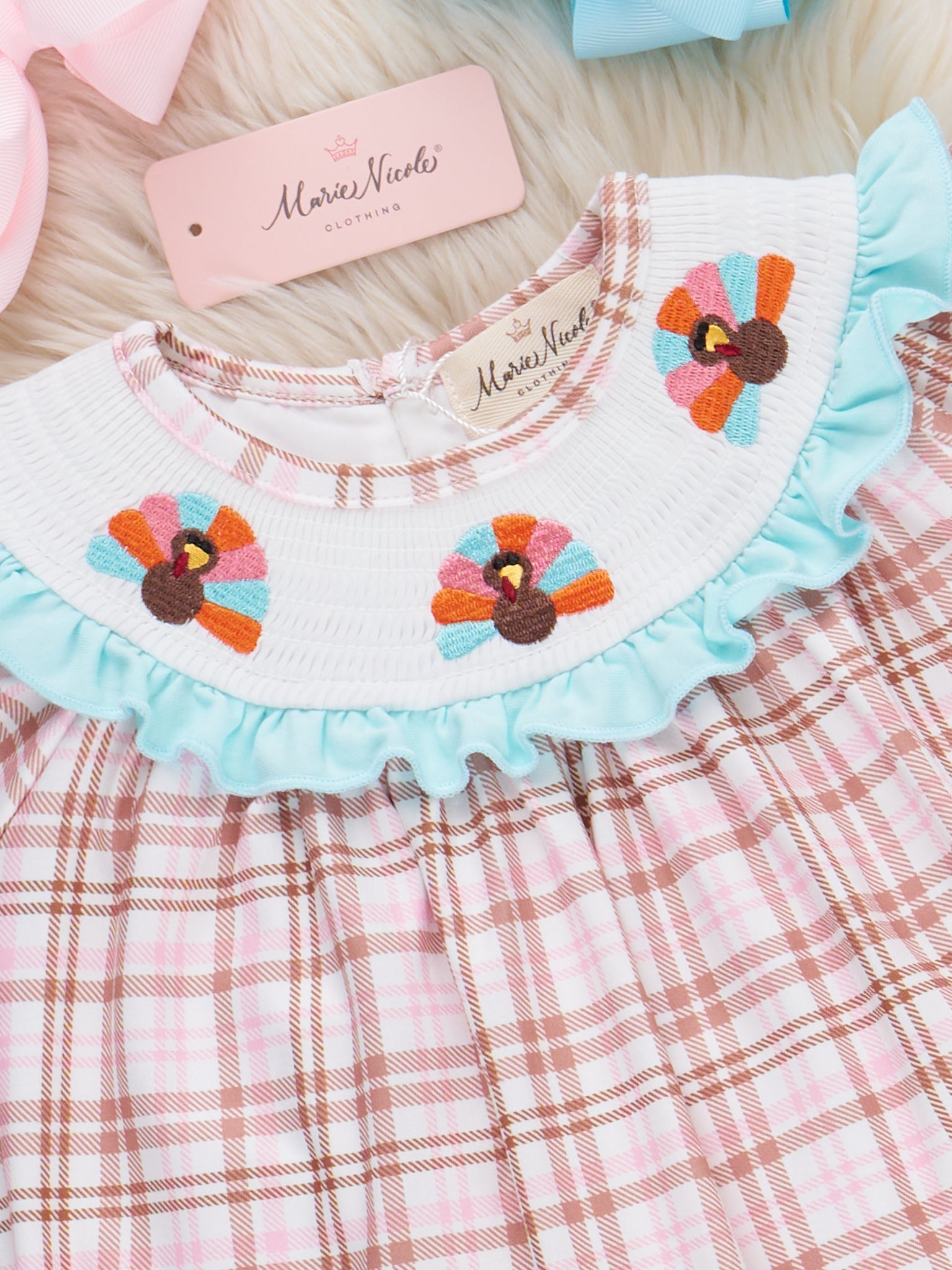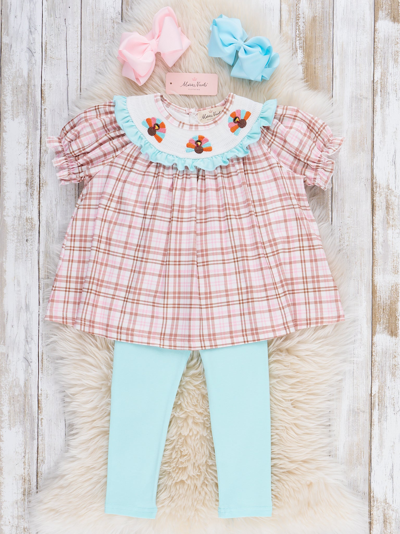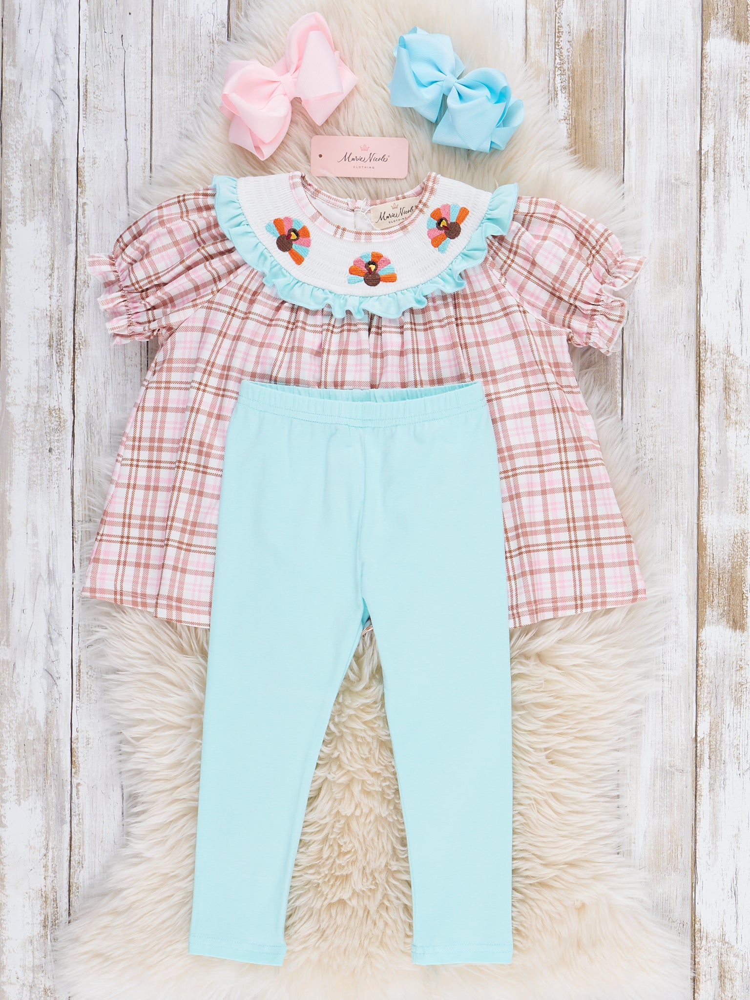 The Turkey Trot Smocked Outfit by Marie Nicole Clothing features a pastel plaid top with smocked turkey embroidery and a blue ruffle-trimmed neckline, paired with coordinating light blue leggings. This set is ideal for Thanksgiving celebrations, family gatherings, and comfortable, festive seasonal style.
