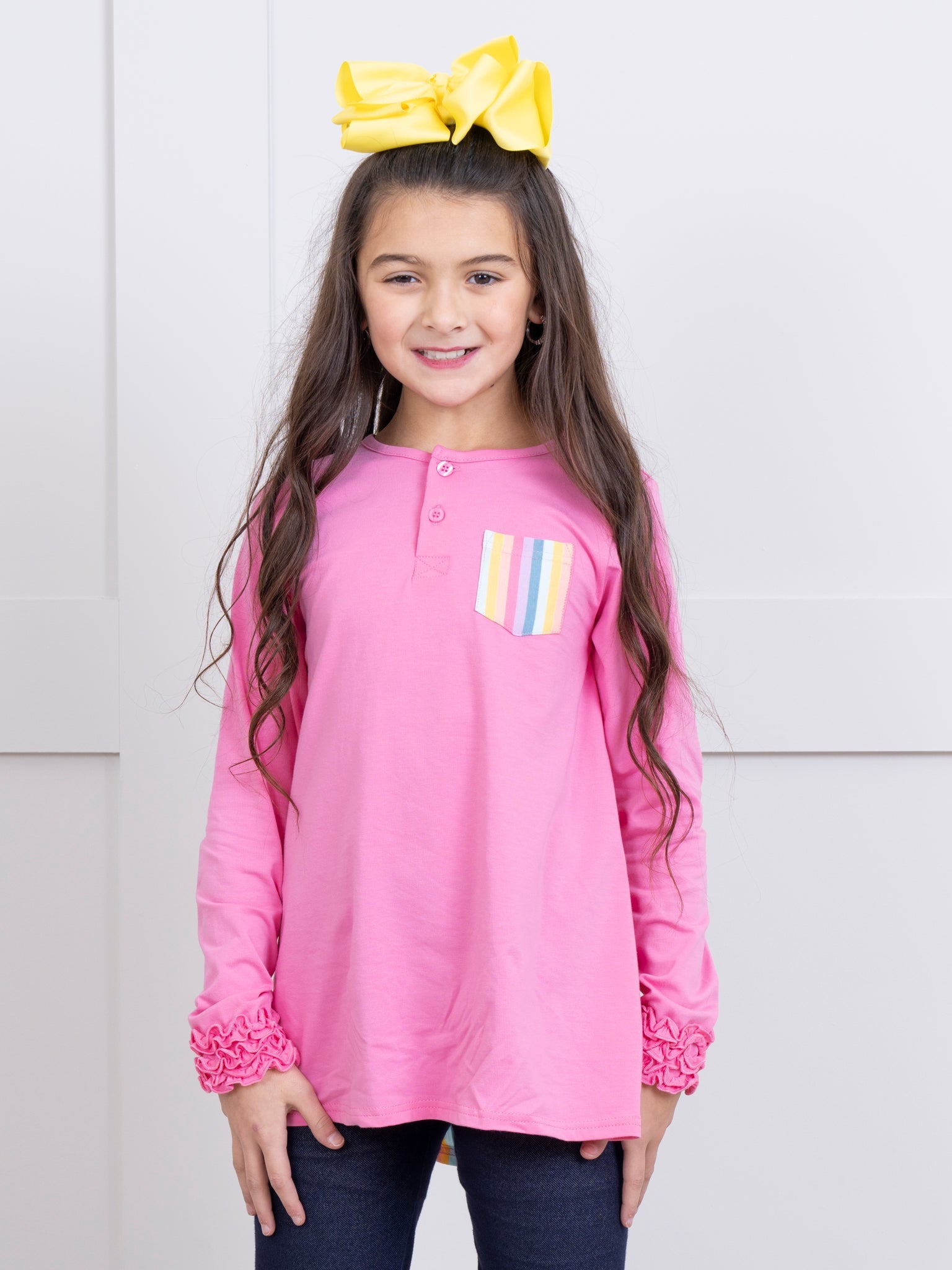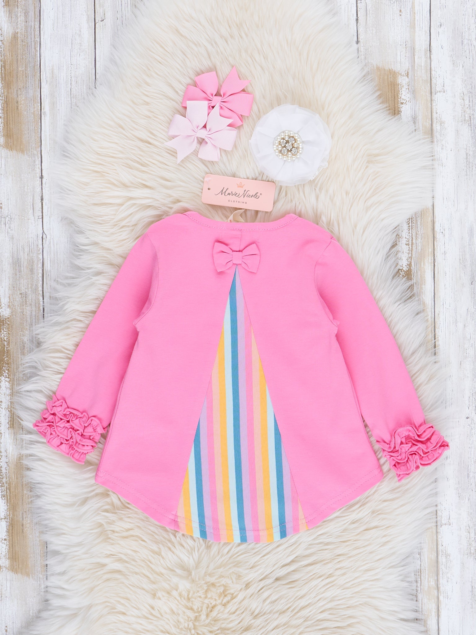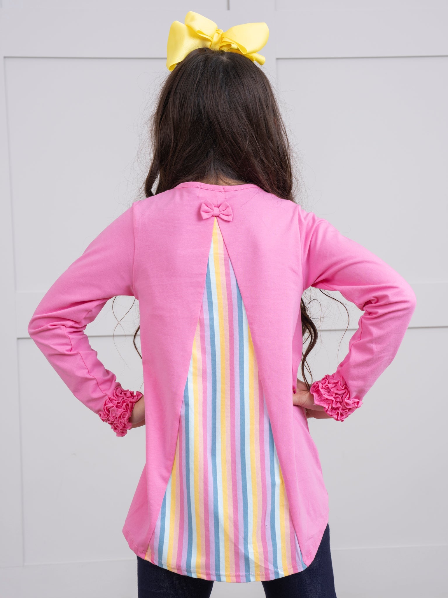 Get your little one to dance through with confidence & joy in the Striped Peek-a-boo Swing Shirt. The front showcases a classic and comfortable silhouette, while the striped peek-a-boo back detail adds an element of surprise and chic flair.