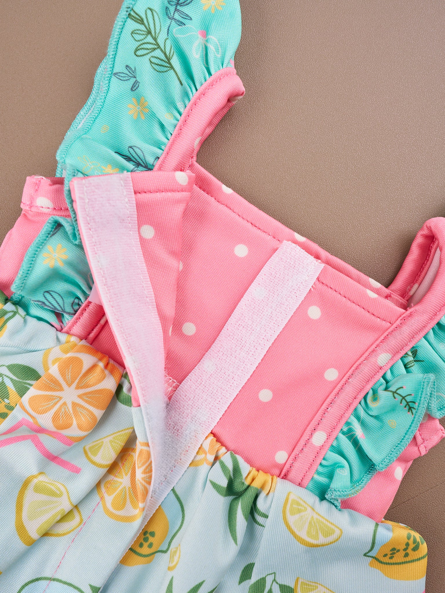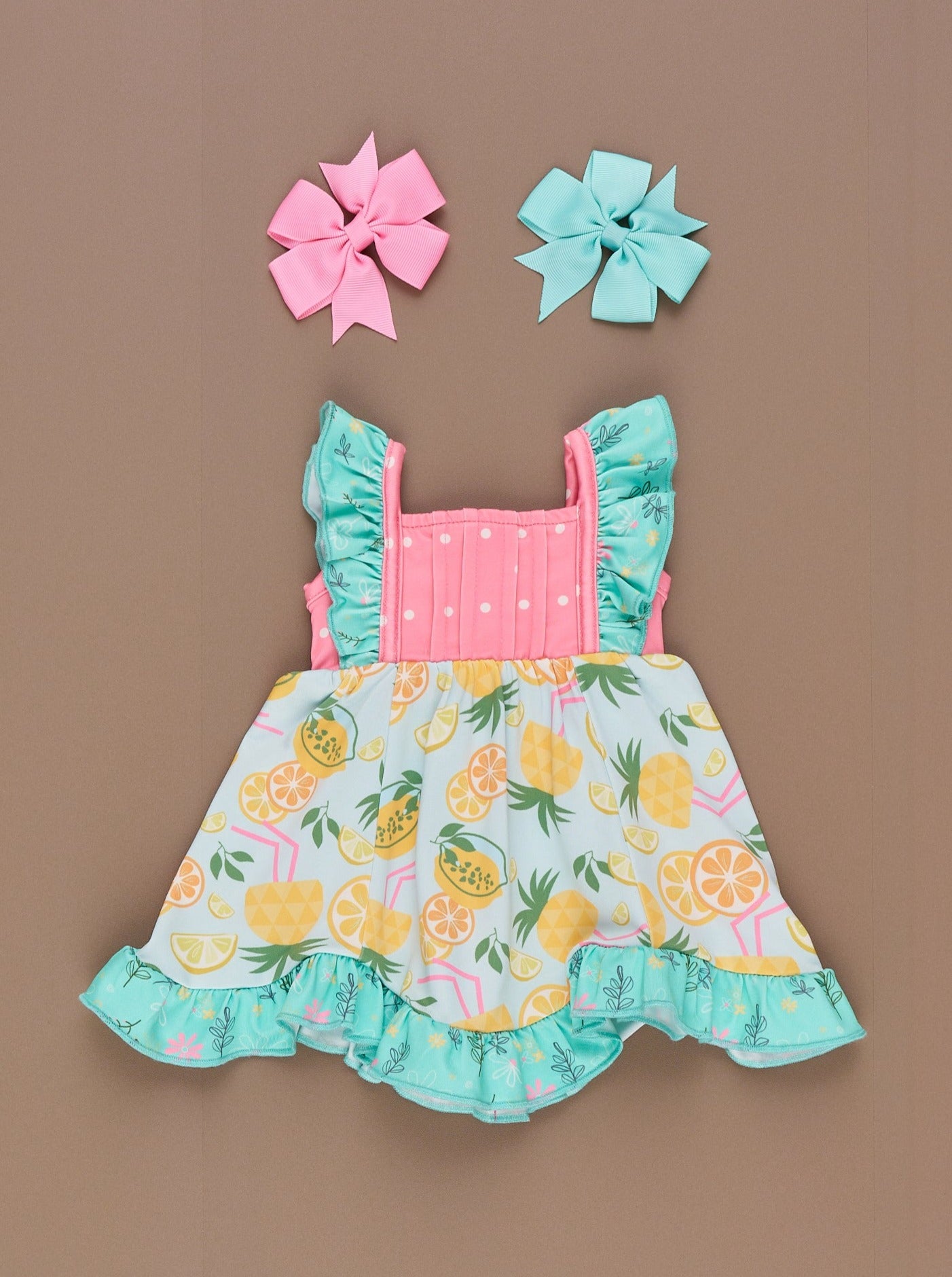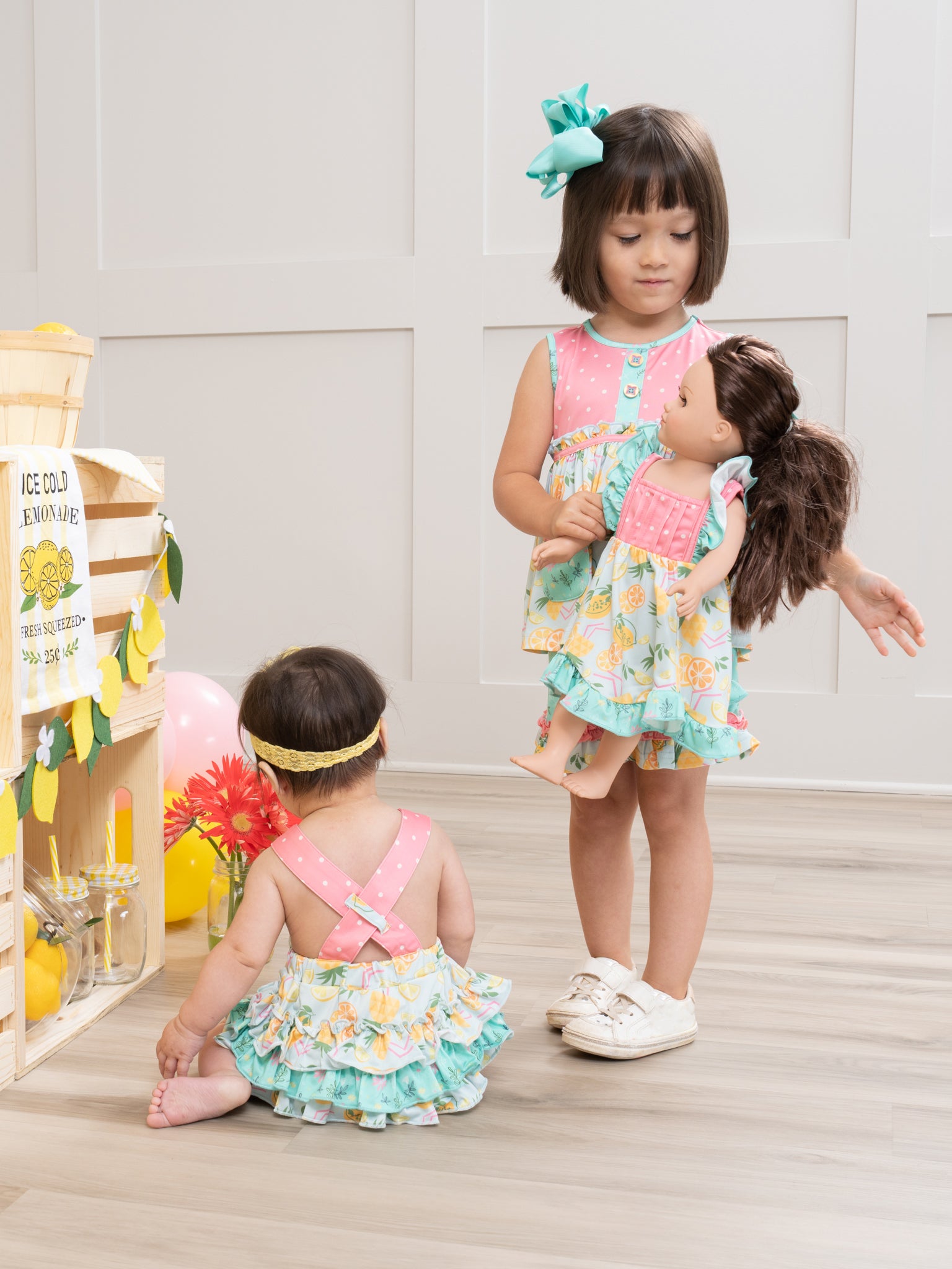 Say hello to our Tropical Twist Collection. Each garment is made of a high-quality material that ensures comfort, durability, and longevity. This doll dress features our Tropical Twist print, polka dots, ruffle trim, daisies, a scalloped hemline, & velcro backs for easy changing.
