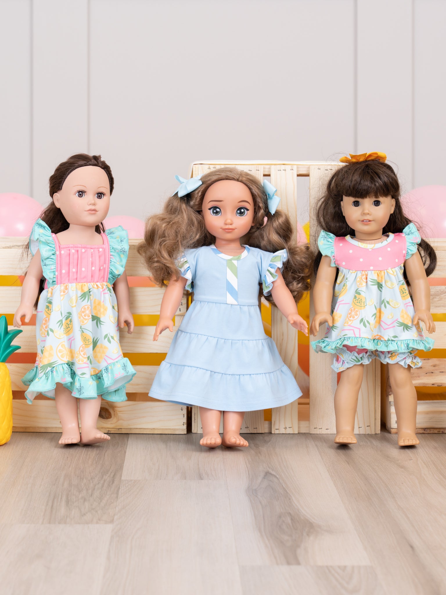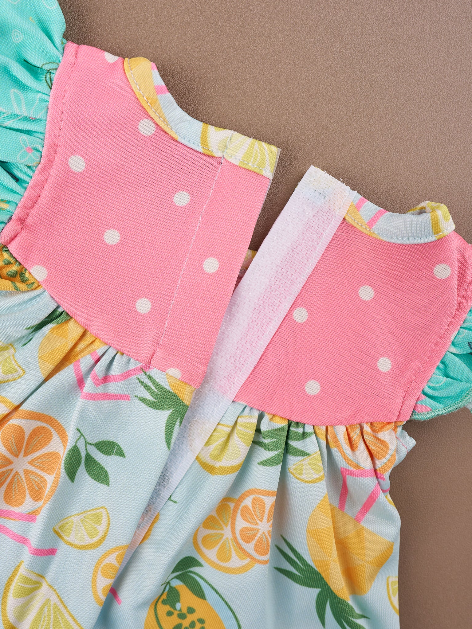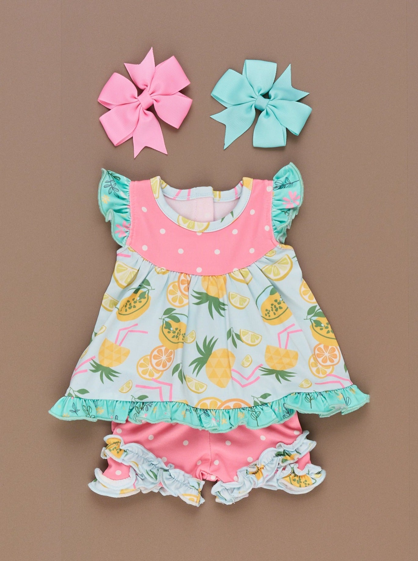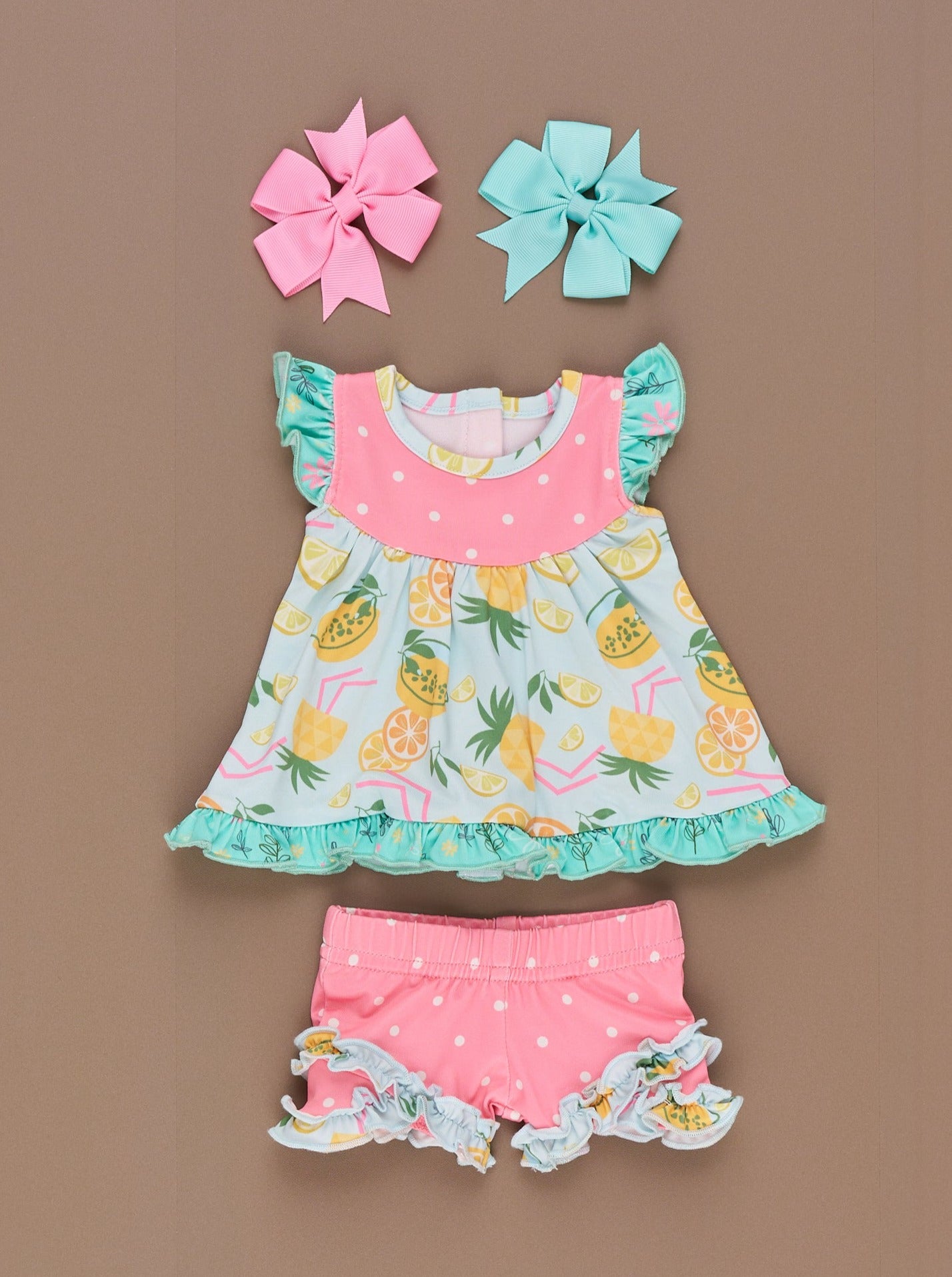 Say hello to our Tropical Twist Collection. Each garment is made of a high-quality material that ensures comfort, durability, and longevity. This doll outfit features a top with our Tropical Twist print, polka dots, ruffle trim, daisies, & velcro backs for easy changing. The matching shorts feature ruffles & an elastic waistband.