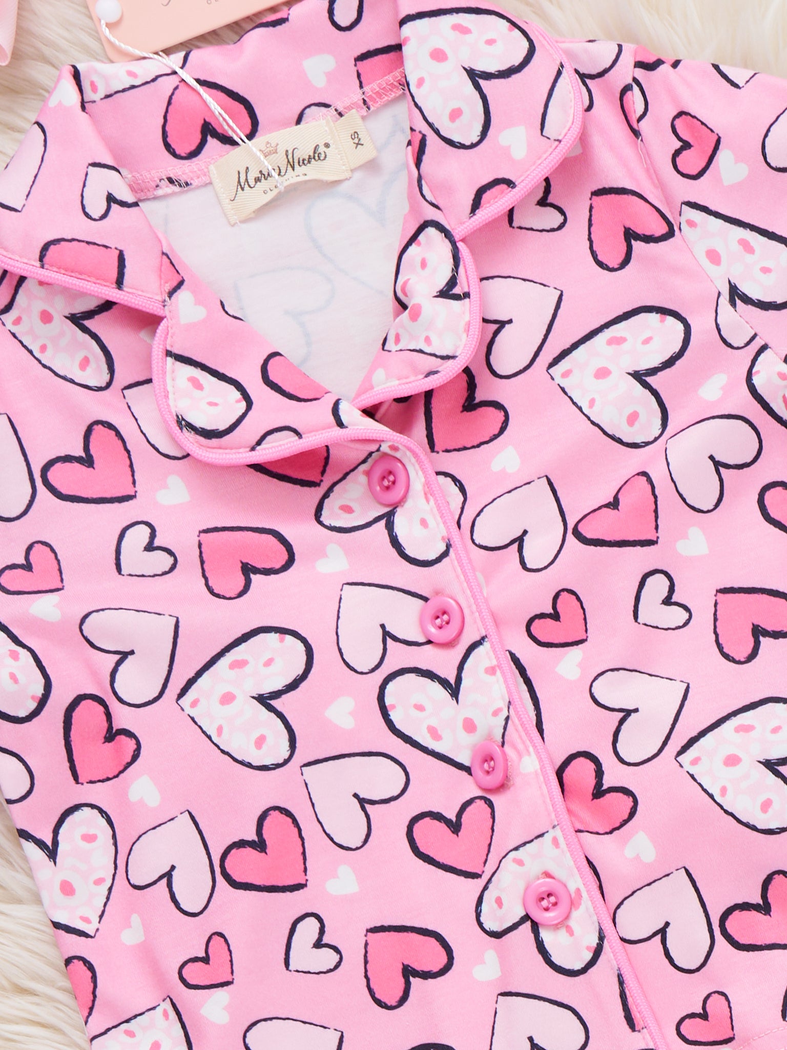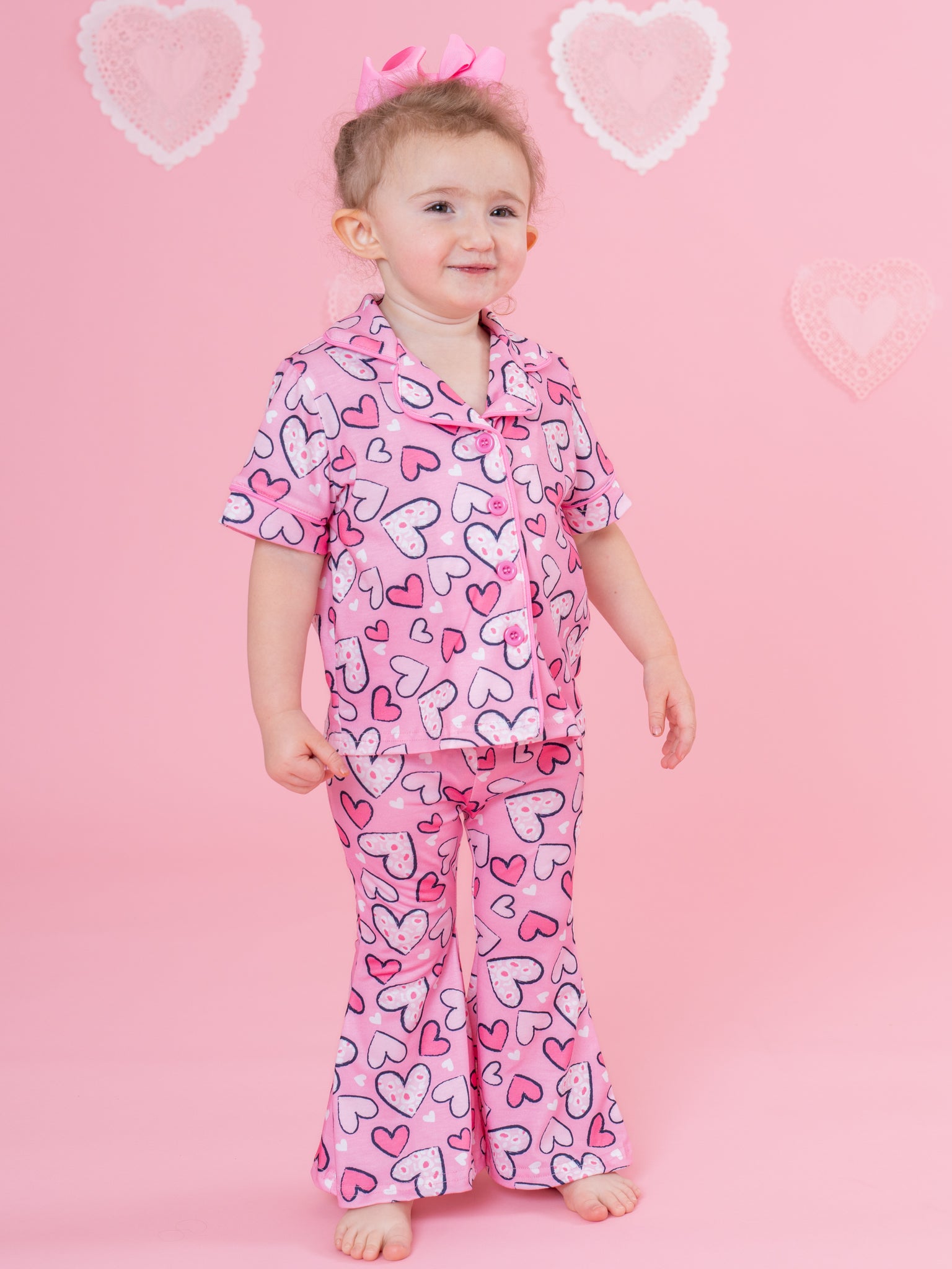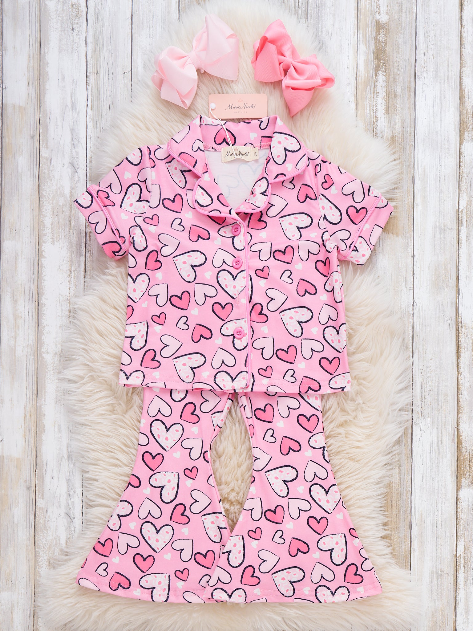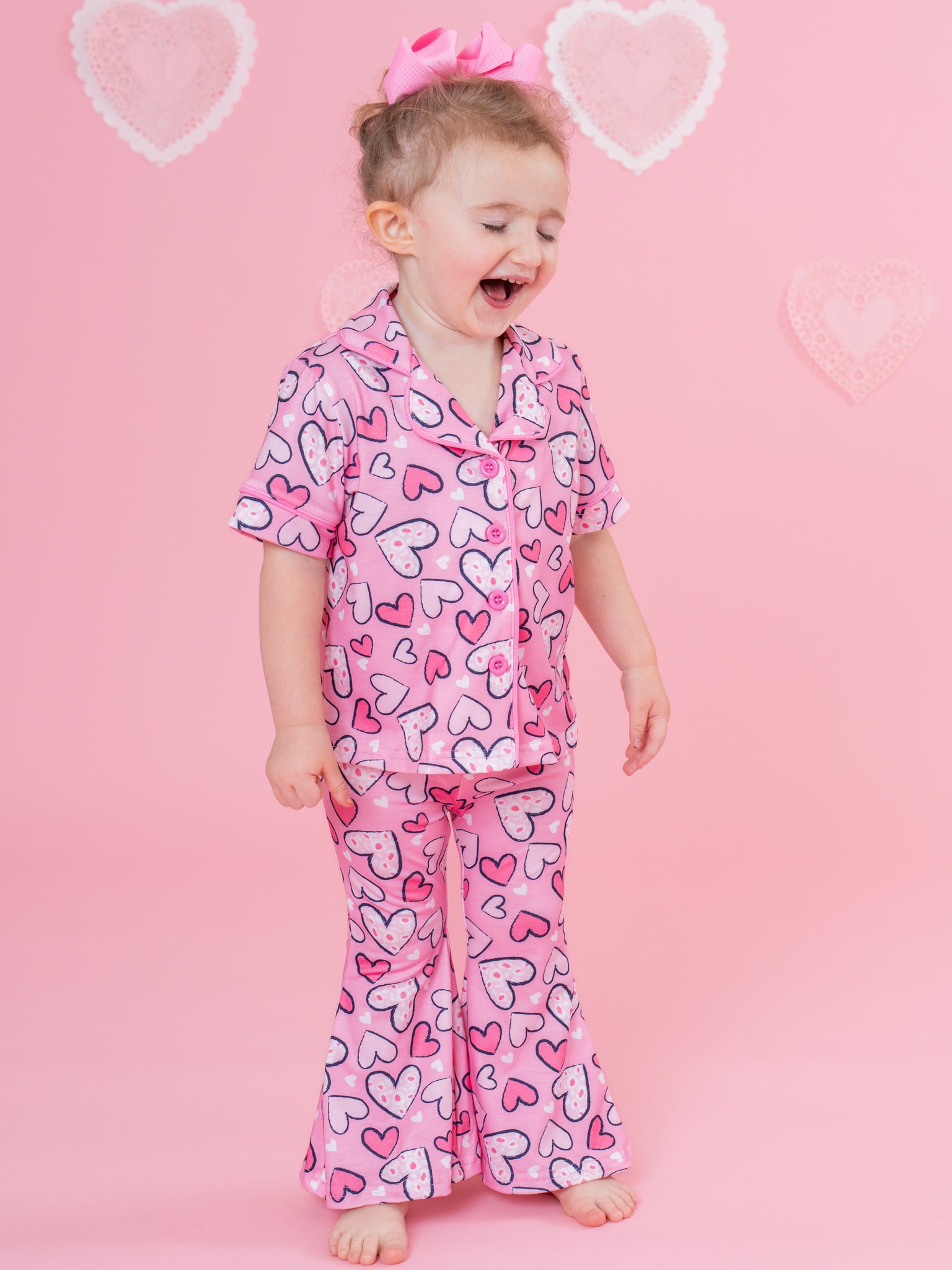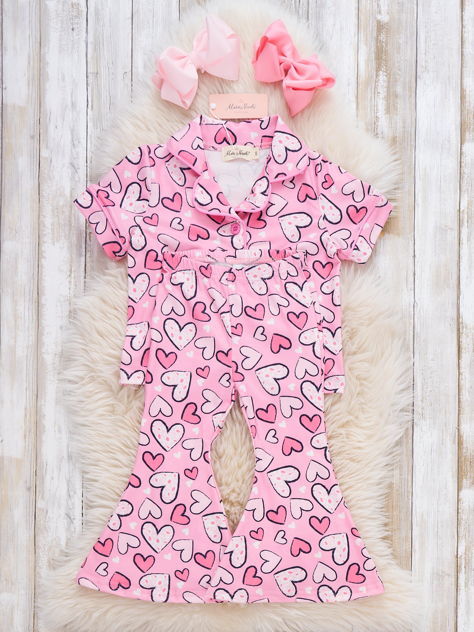 The Heartfelt Hugs Bell Bottom Pajamas by Marie Nicole Clothing feature a fun heart pattern on a collared top and playful bell-bottom pants, perfect for cozy nights and cheerful mornings. Designed for comfort and whimsical style, this soft, stretchy set brings a loving touch to bedtime routines.