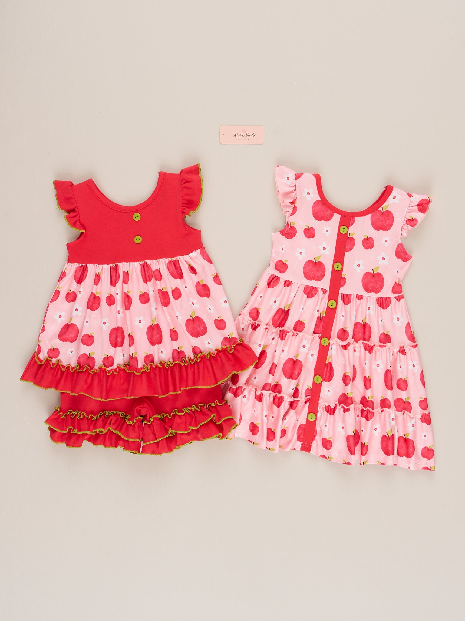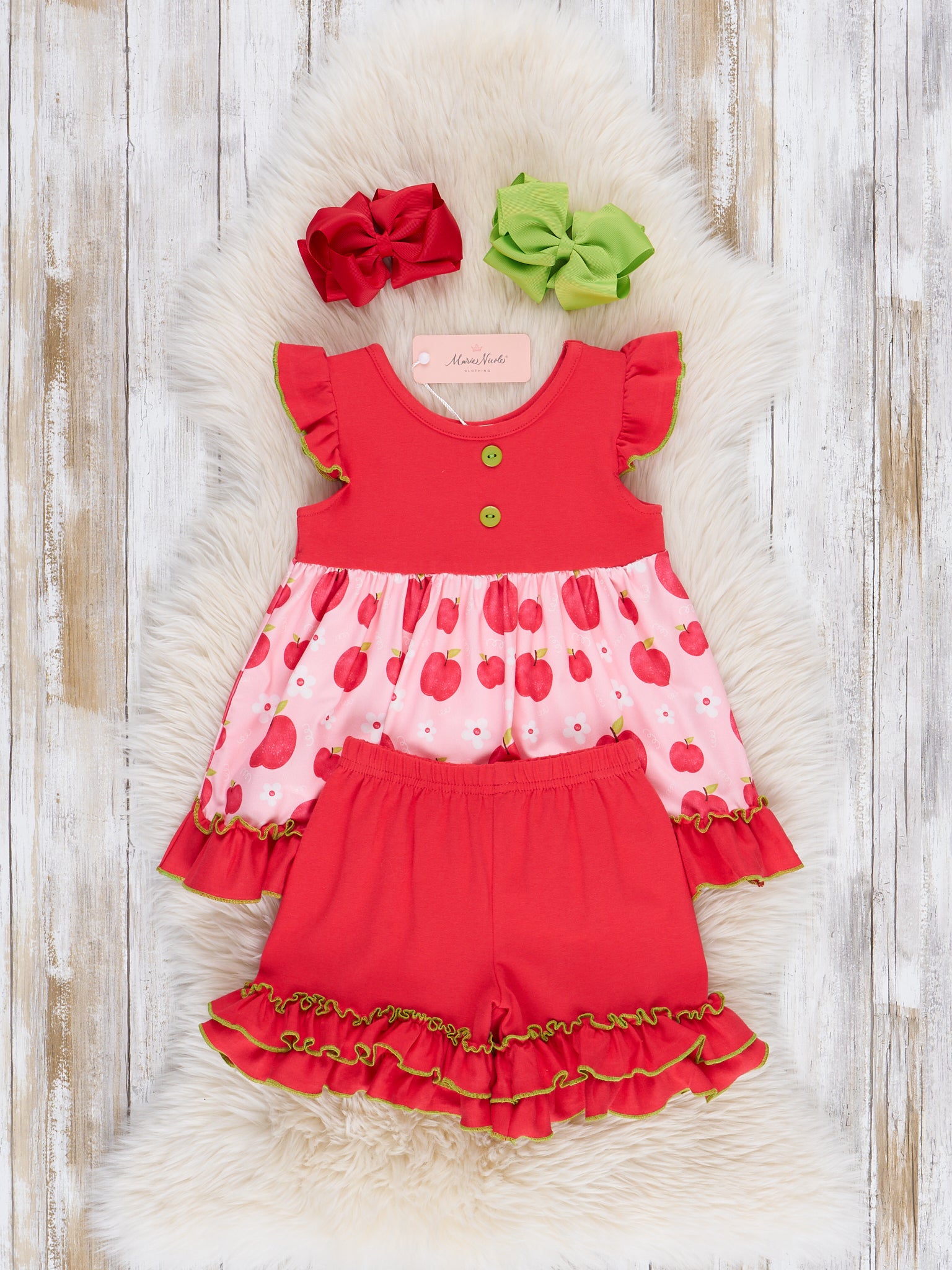 The Apple Time Ruffle Outfit is a charming and playful outfit perfect for school days and sunny afternoons. Featuring a delightful apple print and finished with soft ruffle details, this outfit from Marie Nicole Clothing blends classic sweetness with everyday comfort. Lightweight and breathable, it’s ideal for playdates, family outings, or any time she wants to look adorable and feel great.