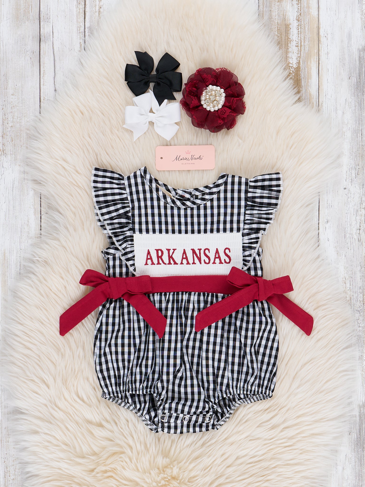 The Arkansas Smocked Gingham Bubble is the perfect blend of playful charm and team spirit for your tiniest fan. This adorable one-piece features a classic black and white gingham print, flutter sleeves, and a smocked panel embroidered with “Arkansas.” Soft, lightweight, and designed with snaps for easy changes, this bubble from Marie Nicole Clothing is a game day must-have. Finished with sweet red side bows, it’s a spirited look made for cheering in comfort and style.