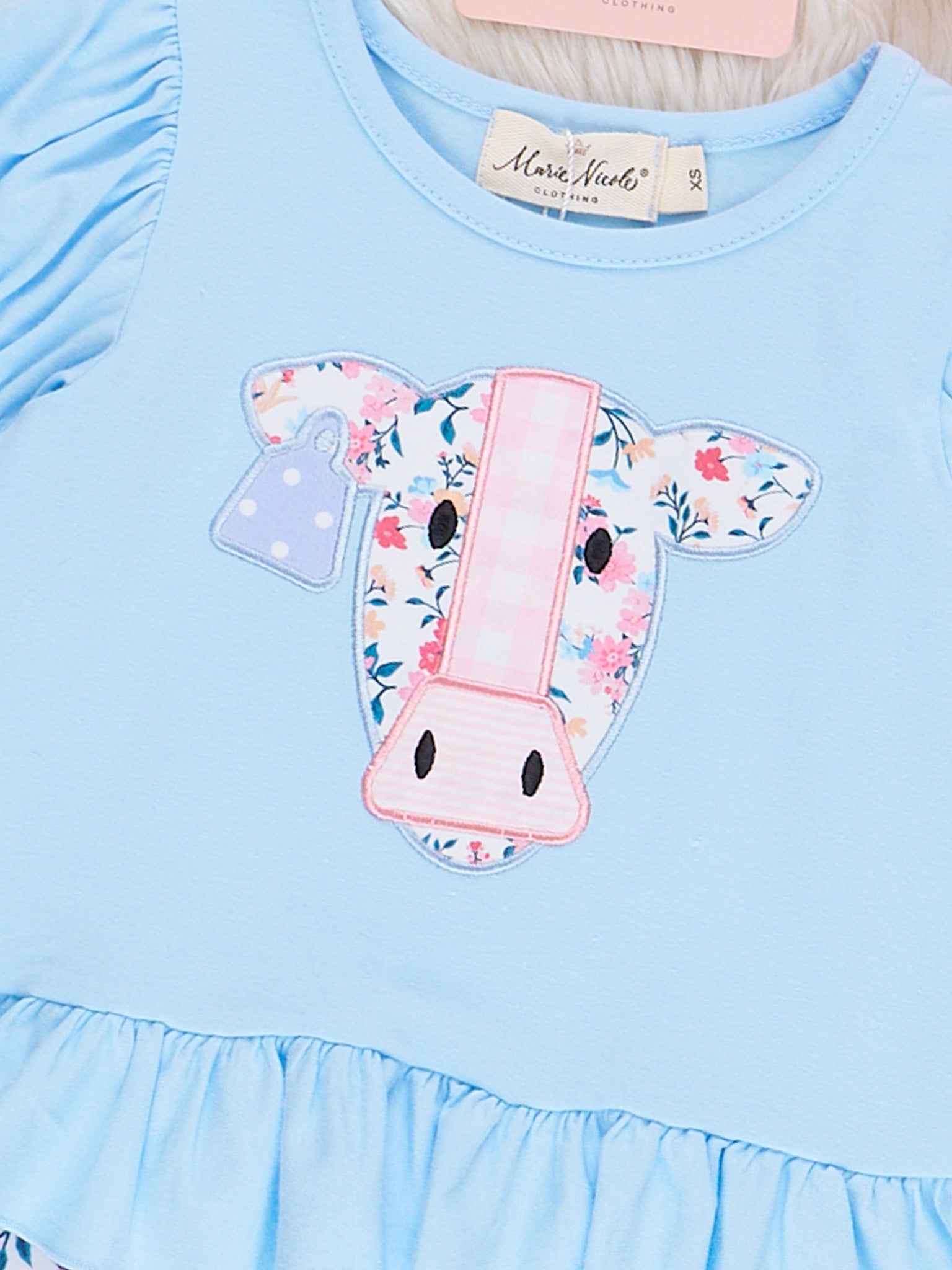 This aMOOsing outfit is perfect for the transition into spring! The Baby Cow Floral Bell Bottom Outfit by Marie Nicole Clothing features a top with ruffle trim, a floral cow appliqué, & matching floral bell bottoms. With soft comfy fabric, it is the perfect choice for the season.