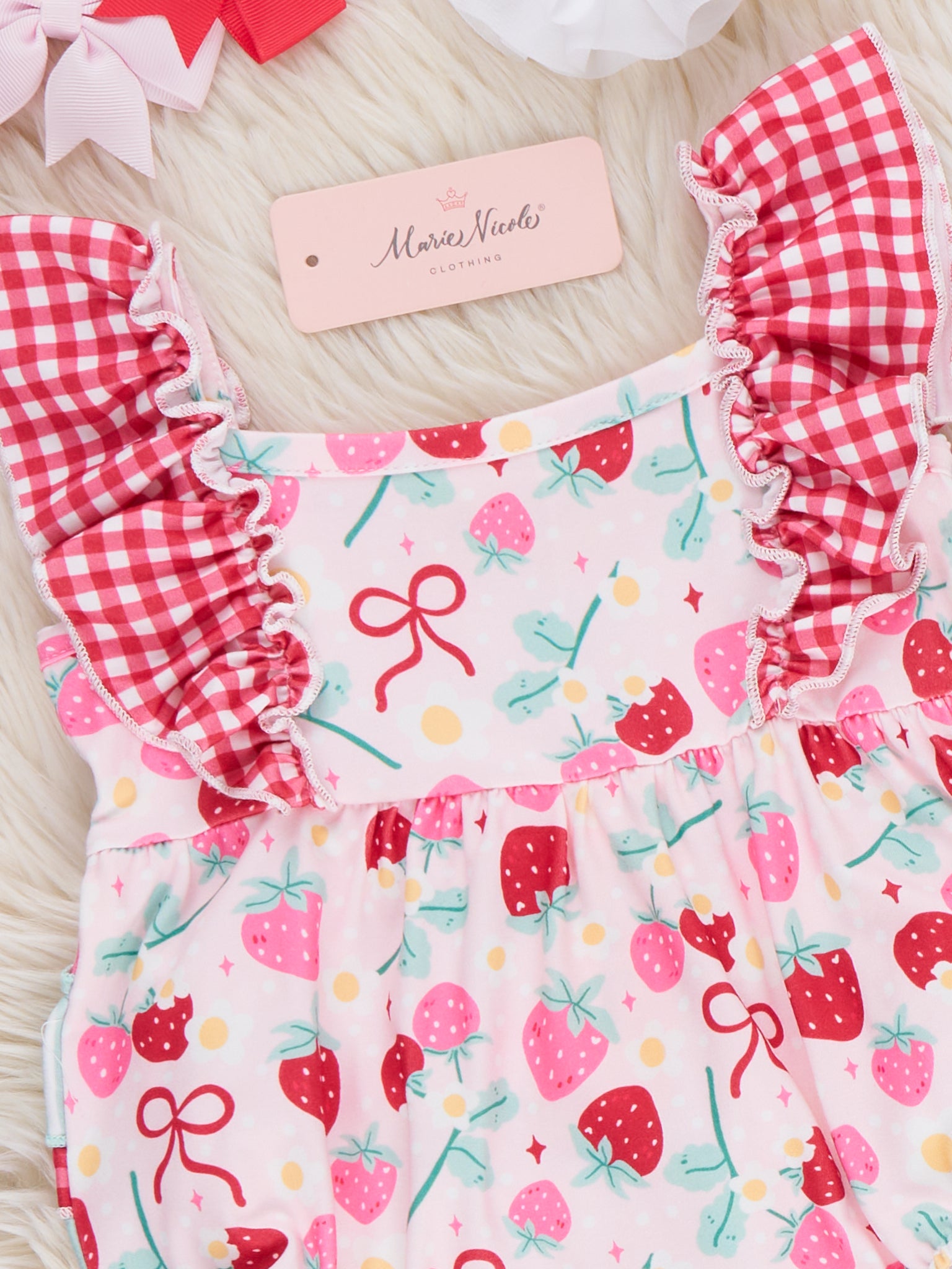 The Berry Sweet Treats Plaid Bubble by Marie Nicole Clothing mixes playful checks with a sweet strawberry-and-bow print for a charming one-piece look. Flutter straps, side ruffles, and soft, stretchy fabric keep baby comfy and picture-ready, while elastic legs and easy snaps make changes simple for busy days and special outings.