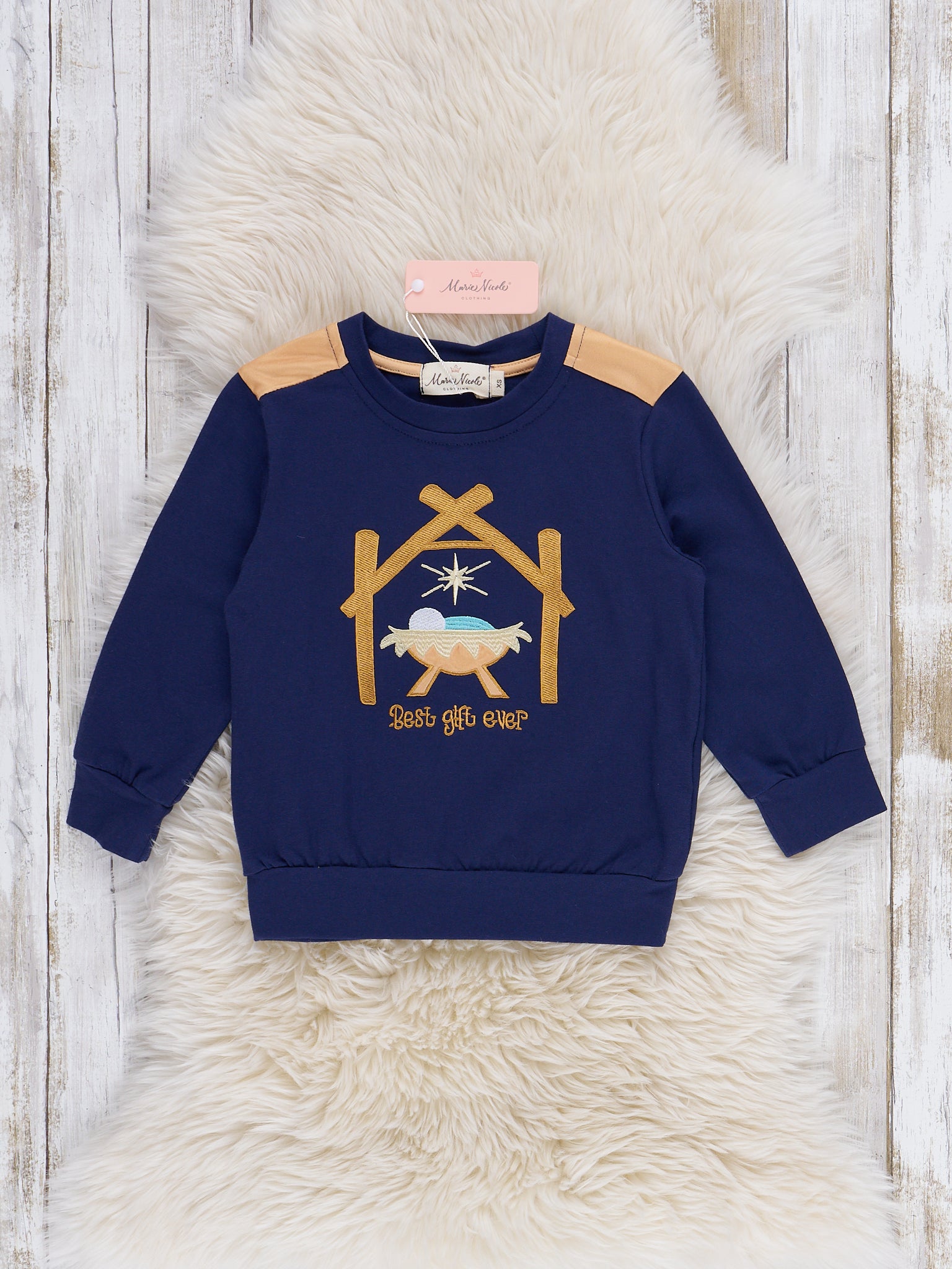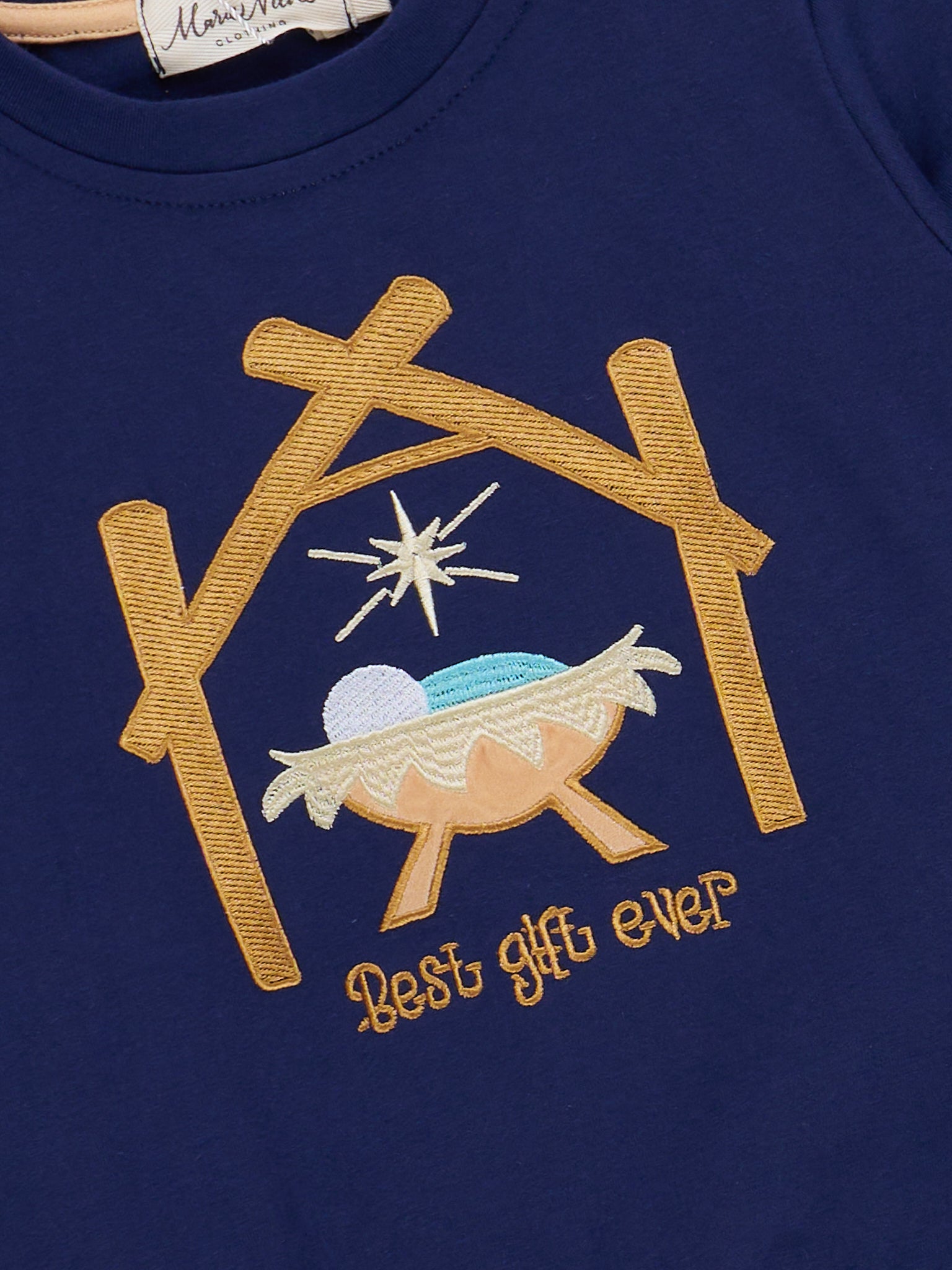 Celebrate Christmas in style with our "Best Gift Ever" Nativity Shirt. This adorable boys top features an embroidered Nativity designed bodice with gold patch shoulders. Perfect for celebrating the "best gift ever" of the holiday season. Shop the full sibling set!