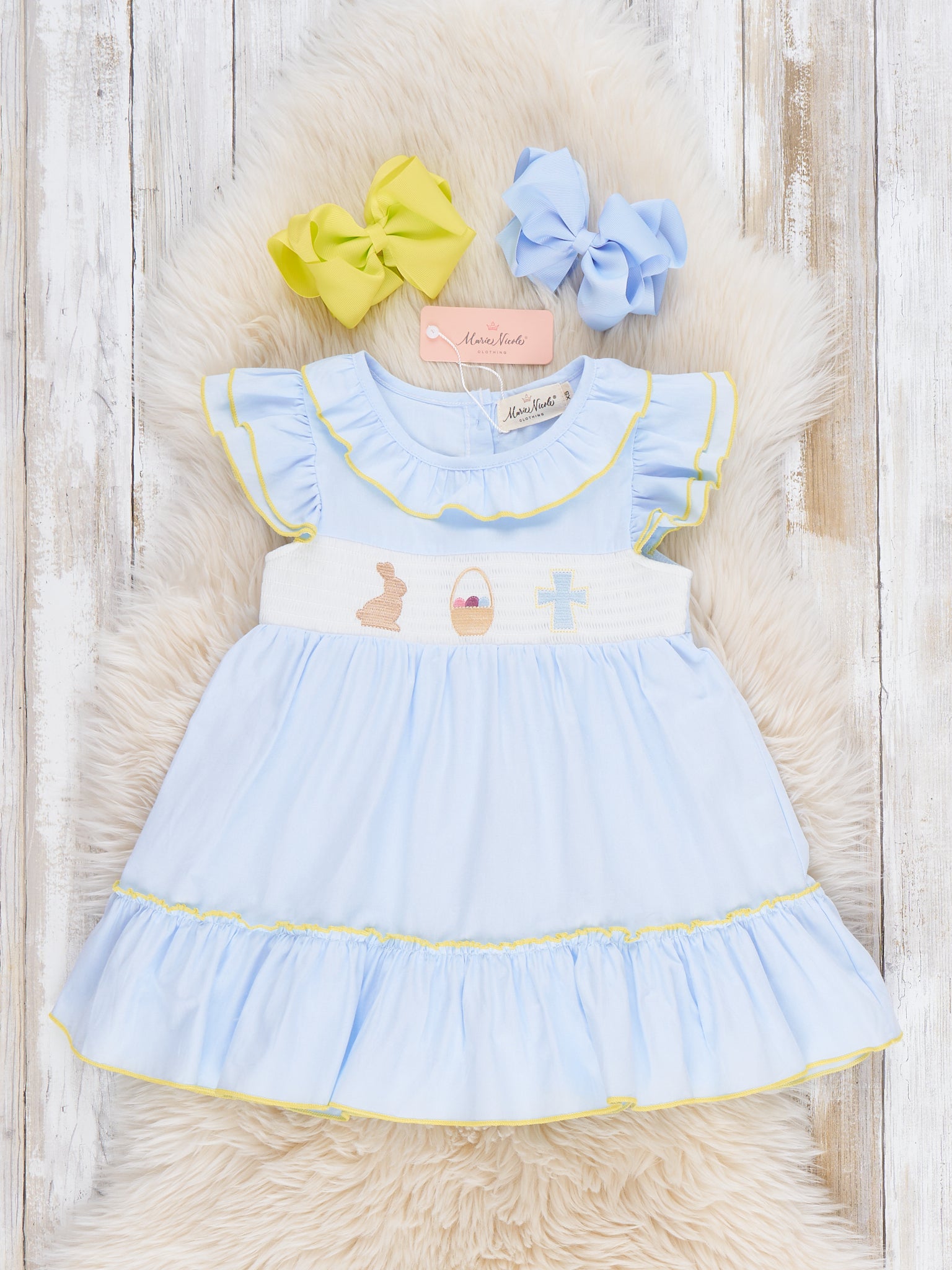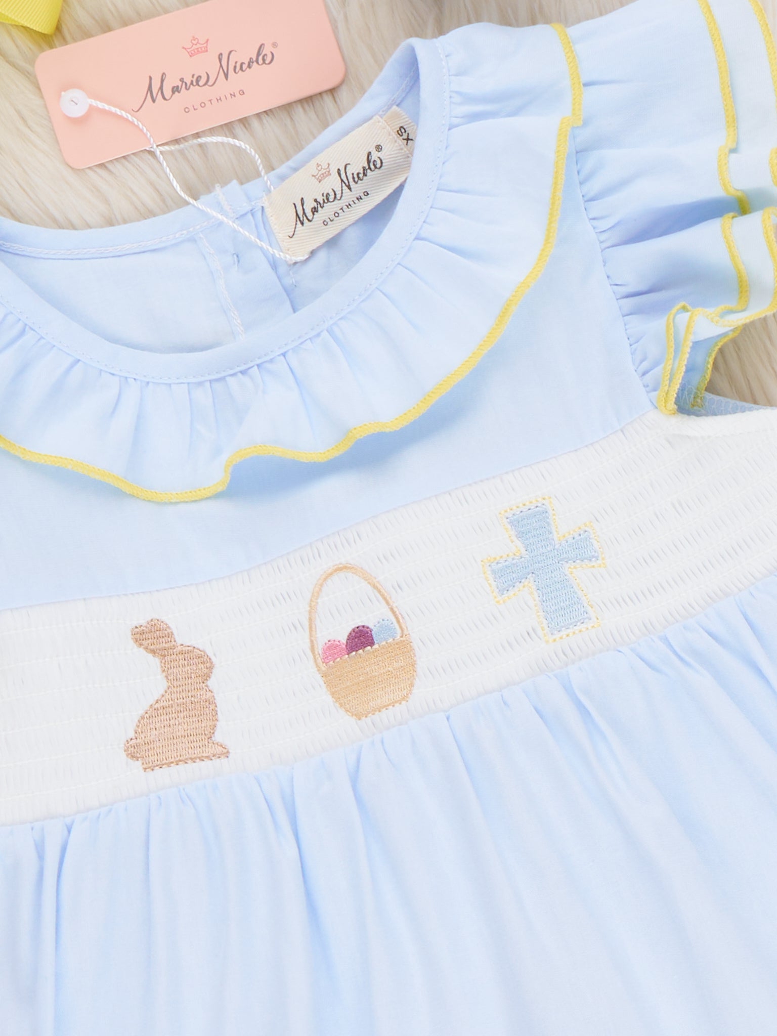 Blessed Bunny Smocked Cotton Ruffle Dress by Marie Nicole Clothing showcases a smocked panel with bunny, egg, and cross embroidery, flutter sleeves, and a gently gathered skirt with ruffle trim. This dress combines classic motifs and a twirl-friendly silhouette, making it a sweet choice for spring celebrations, holidays, and special family moments. The comfortable fabric and thoughtful details bring charm and ease to every occasion.