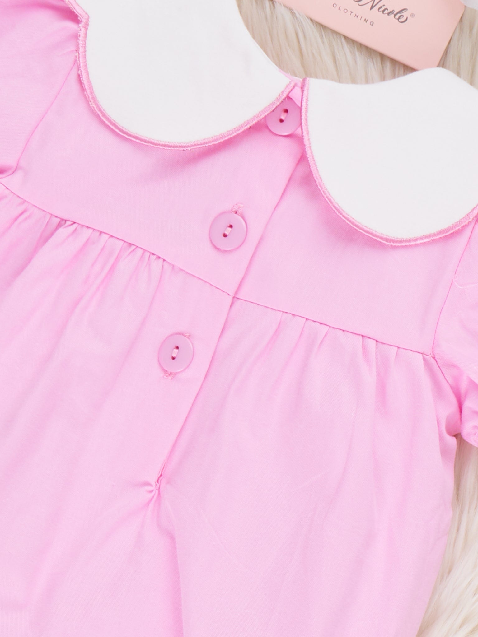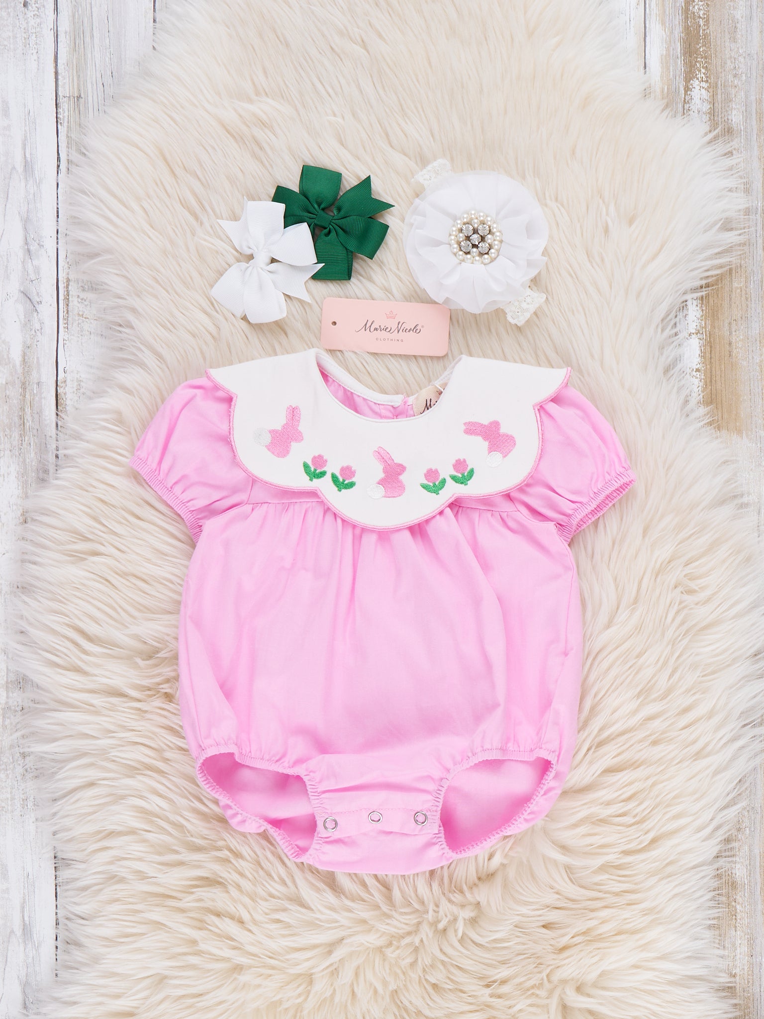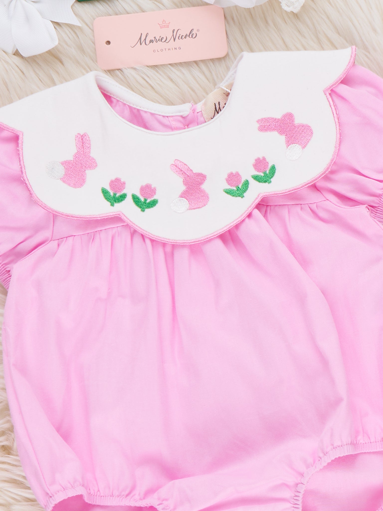 Blooming Bunny Embroidered 100% Cotton Bubble by Marie Nicole Clothing blossoms with Easter sweetness, featuring a scalloped collar embroidered with tiny bunnies and blooms above a softly gathered bubble body. From Marie Nicole Clothing, puff sleeves, gentle elastic, and easy snaps keep baby comfy for egg hunts, brunch dates, and picture-perfect springtime memories.
