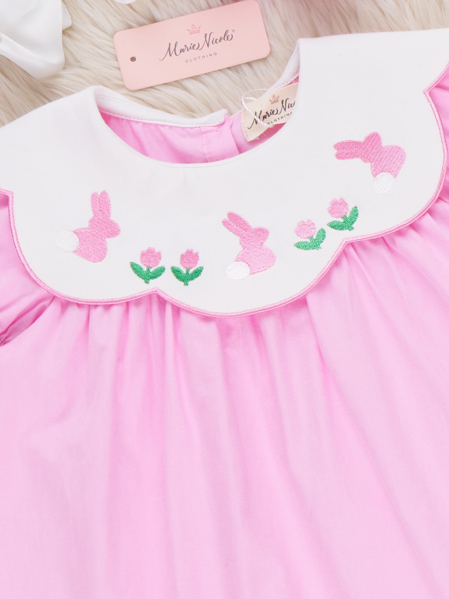 Blooming Bunny Embroidered 100% Cotton Dress by Marie Nicole Clothing brings storybook Easter charm with its scalloped, bunny-trimmed collar, puff sleeves, and softly flared skirt that swishes with every step. From Marie Nicole, this sweet embroidered dress keeps little ones comfy for church, egg hunts, and spring photos filled with twirls, giggles, and cherished memories.