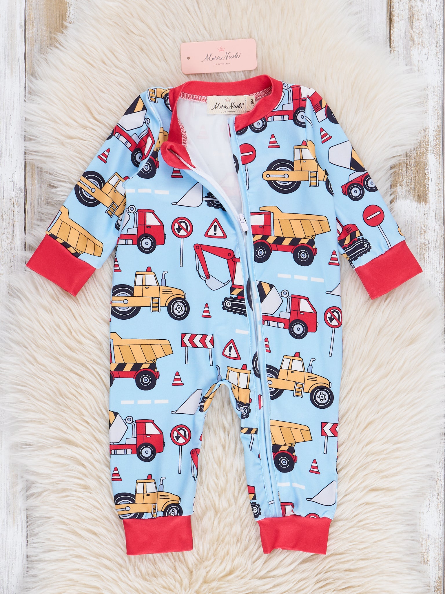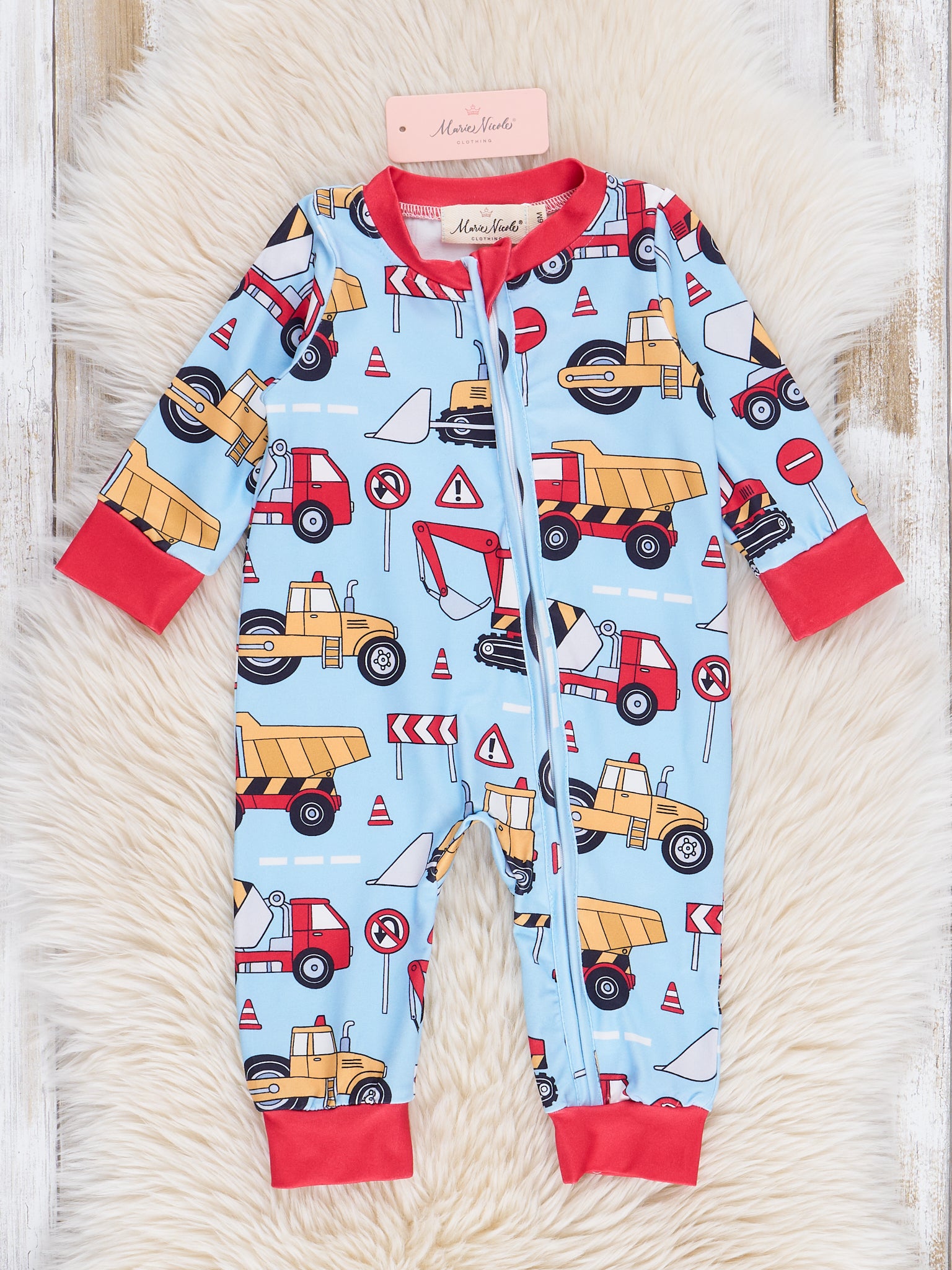 Get your little builder ready for bed with this Blue Construction Work Sleeper Pajamas. The asymmetrical zipper closure ensures a secure fit, while the soft fabric adds an extra layer of comfort. Plus, the playful construction print will have them dreaming of building and creating with this sleep set by Marie Nicole Clothing! Sweet dreams, little one!