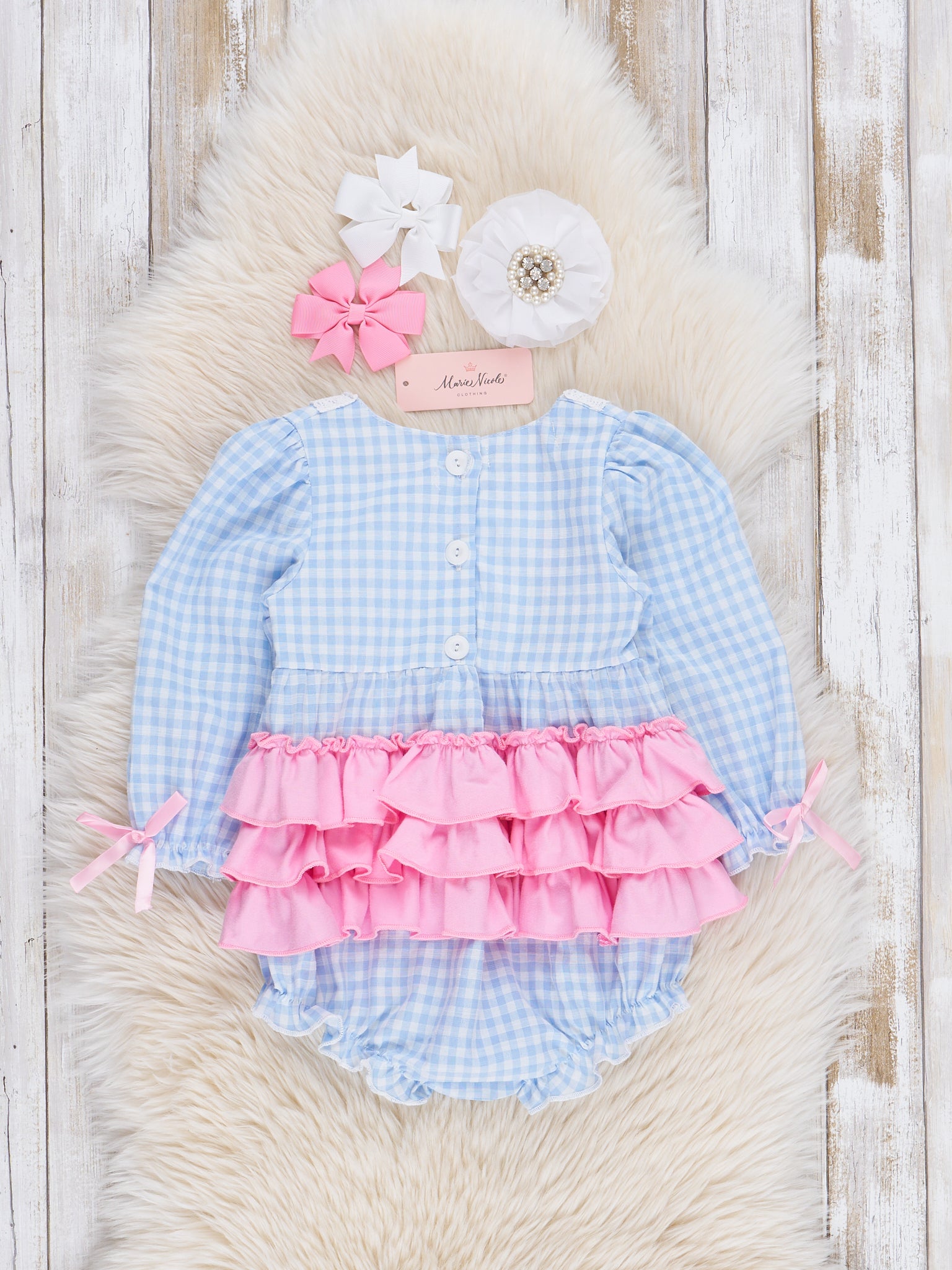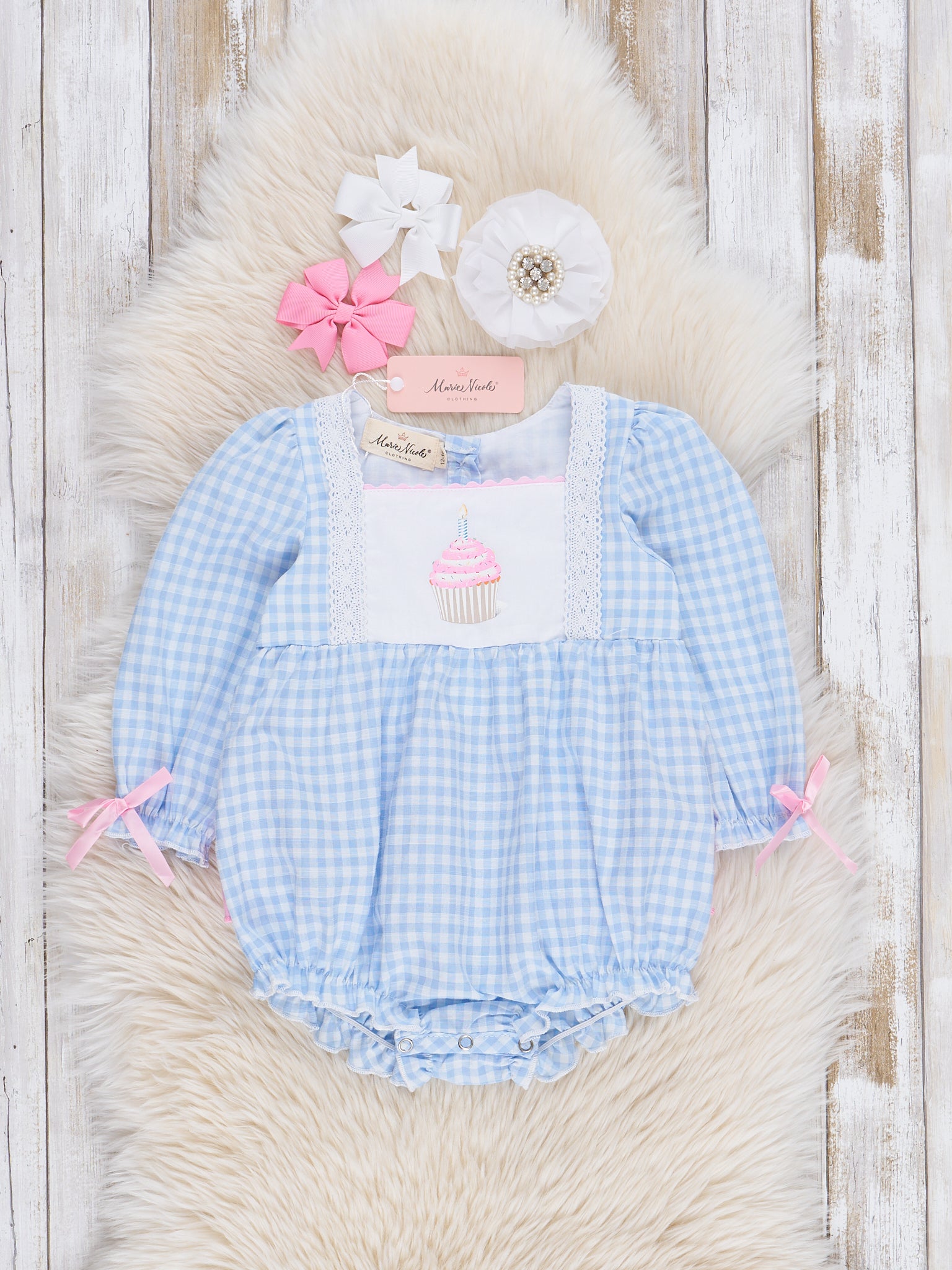 Celebrate her birthday with this adorable Blue Gingham Birthday Cupcake Ruffle Bubble! The perfect birthday look, this girls bubble features a cute vinyl printed cupcake and an even cuter pink ruffle butt. A sweet and stylish option for any birthday party! Shop the matching outfit!