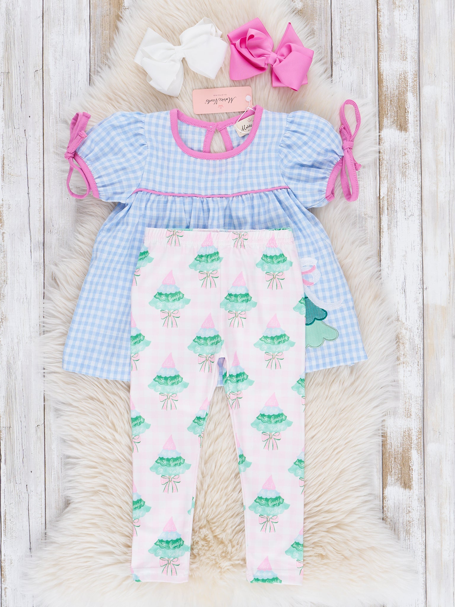 Get your little girl in the holiday spirit with this playful Blue Gingham Christmas Tree Bubble! The blue gingham top with pink accents add a touch of quirky charm, while the embroidered Christmas paired with Christmas tree print leggings makes it extra festive. Don't forget to check out the matching sister set!