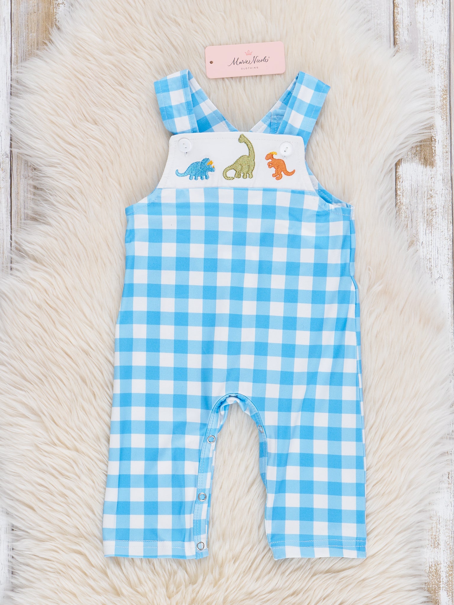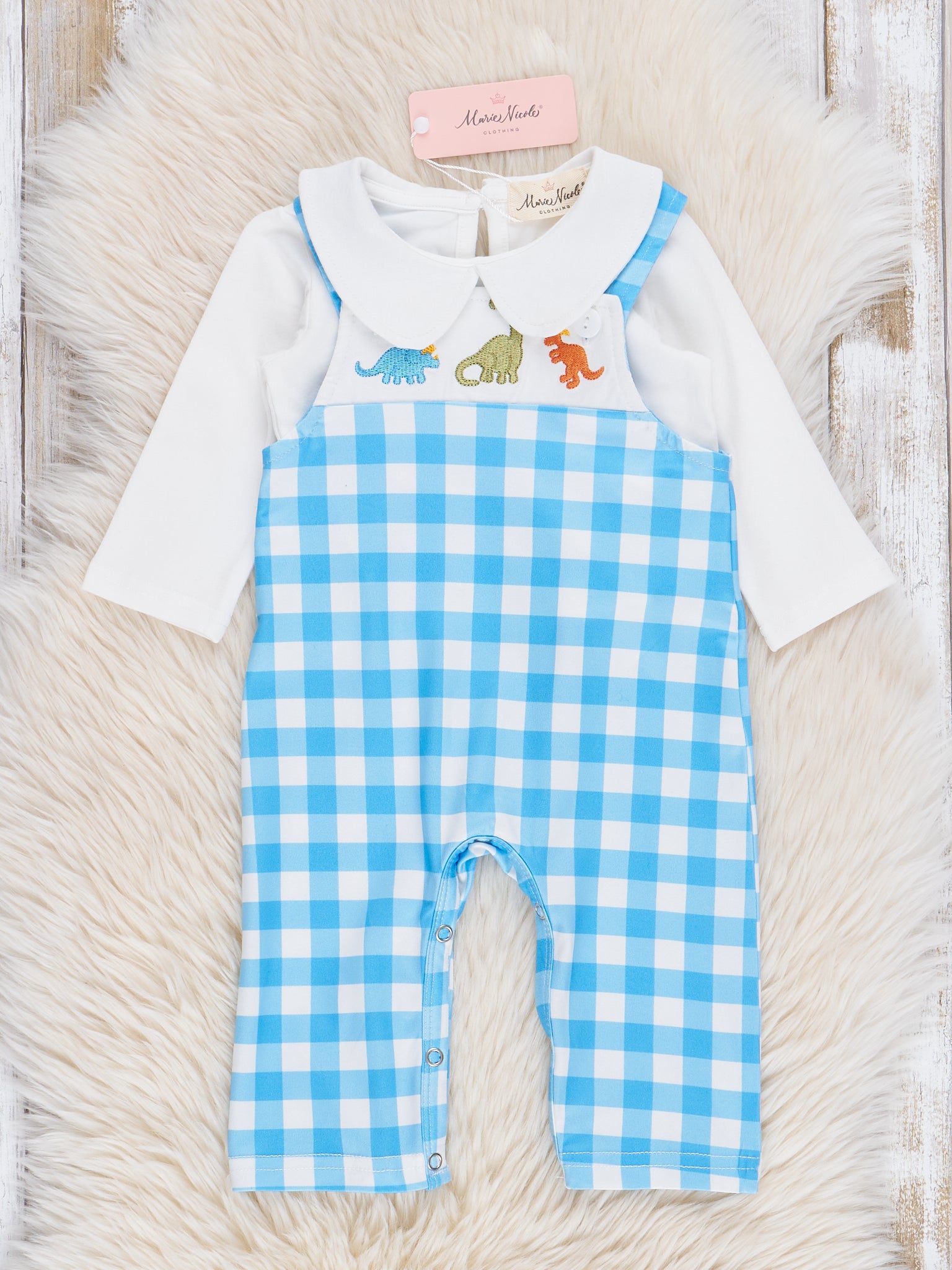 RAWR into style with this sibling set! The blue gingham johnny features 3 embroidered dinos & button details, while the peter pan collar top completes the perfect dino look. Perfect for adventures, this unique outfit will have your little ones looking dino-mite!