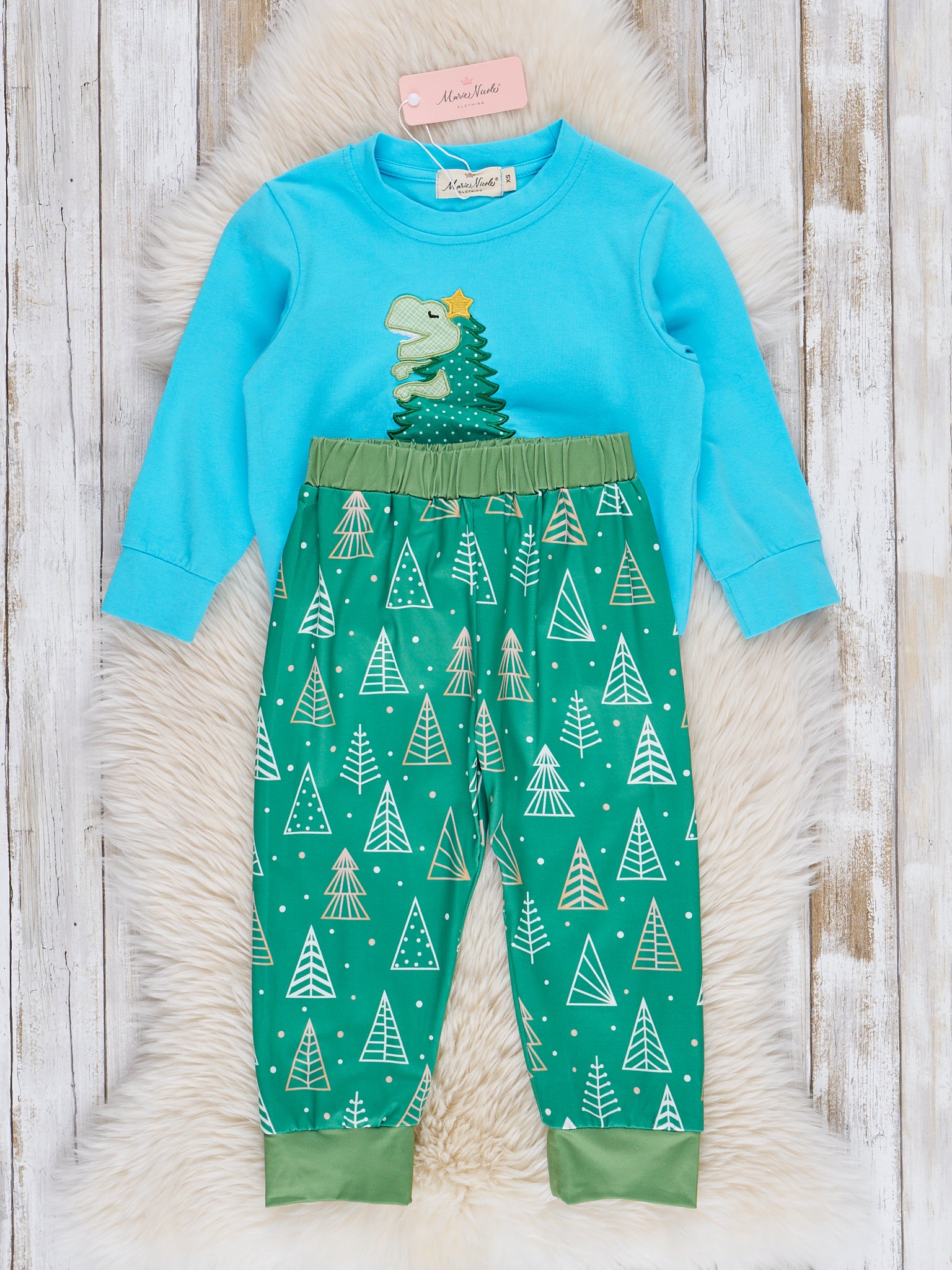 Get your little dinosaur ready for the holidays with our Blue & Green Christmas Tree-Saurus Outfit! This boys set features a playful t-rex in a festive Christmas tree costume, embroidered on a blue top. The coordinating pull on pants in green Christmas tree print add a fun touch to this top. Don't miss out on this unique and quirky brother set!