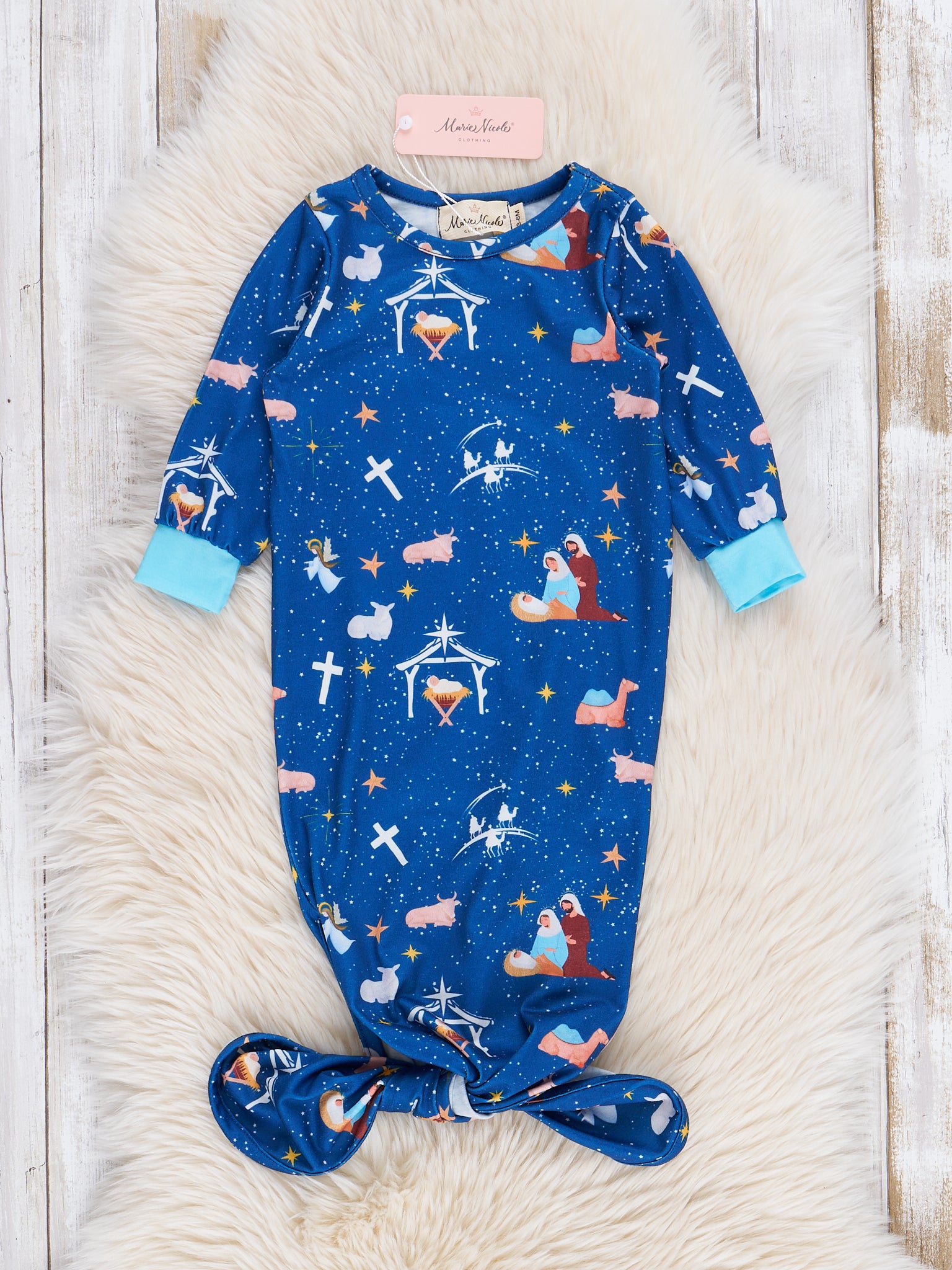 Celebrate the true meaning of Christmas with our Blue Nativity Knot Gown! This sibling pajama set features a cute infant gown with a festive blue Nativity print. Perfect for Christmas morning snuggles!