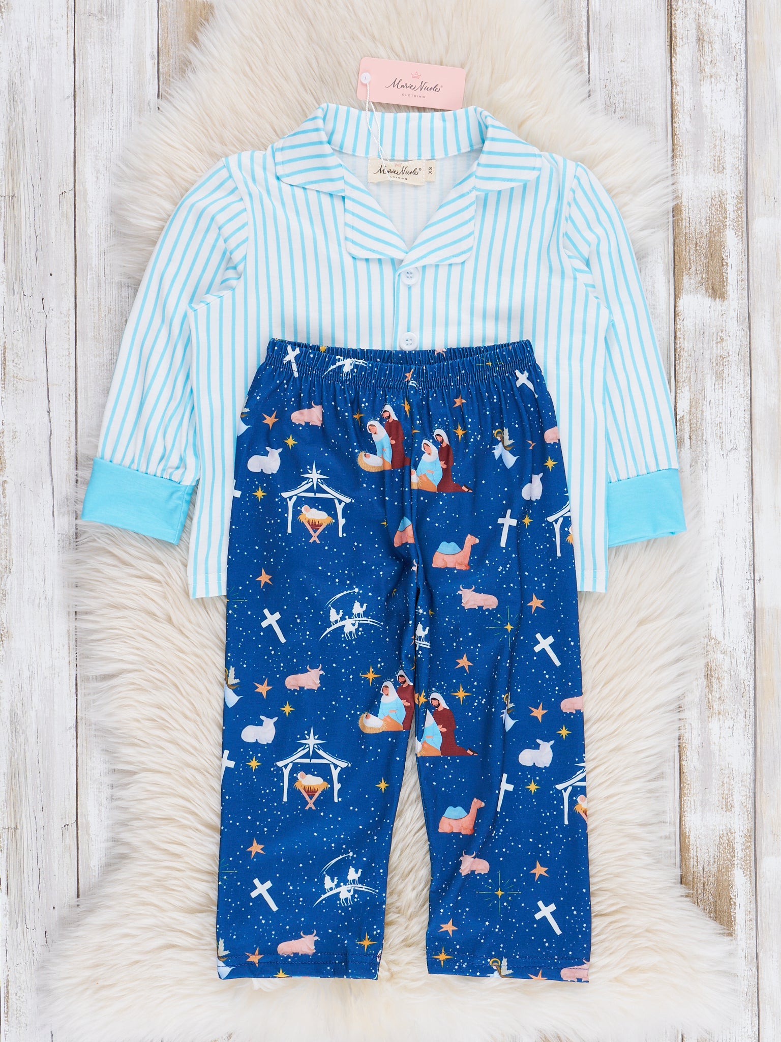 Celebrate the true meaning of Christmas with our Blue Nativity Pajamas! This sibling pajama set features boys pajamas with cute striped button up top paired with festive blue Nativity print pants. Perfect for Christmas morning snuggles!