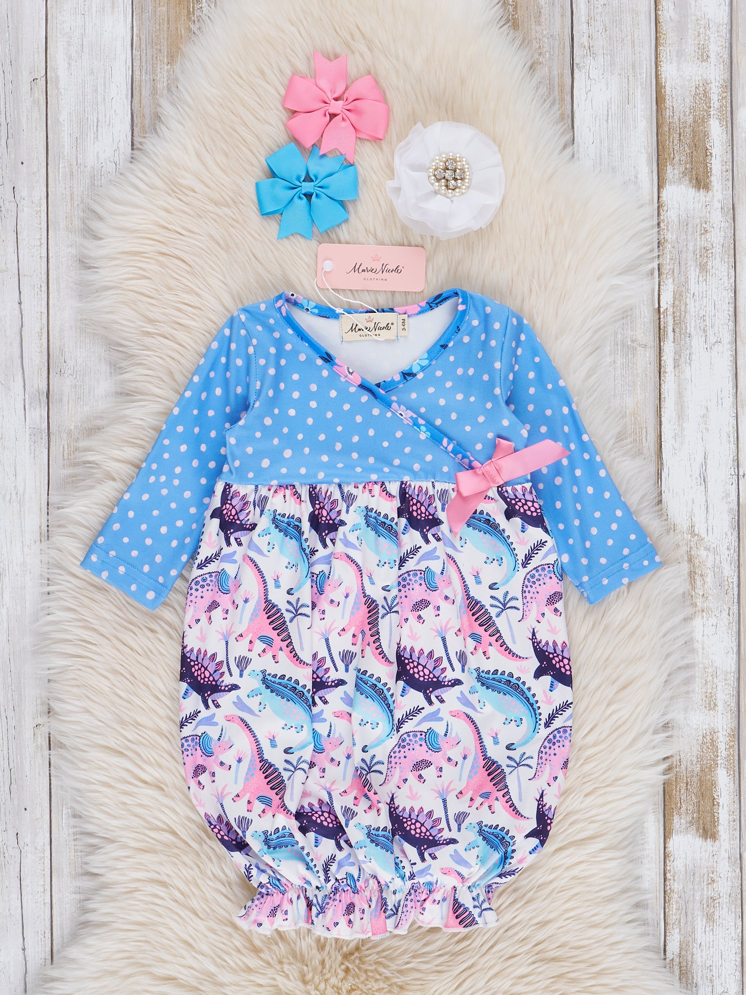 Get ready for some dino-mite fun with sister set! This gown is perfect for your little one, featuring a playful dinosaur print with pink bow detail and a mix of blue floral and polka dot print on the bodice. Careful, this gown may cause some ruffle!