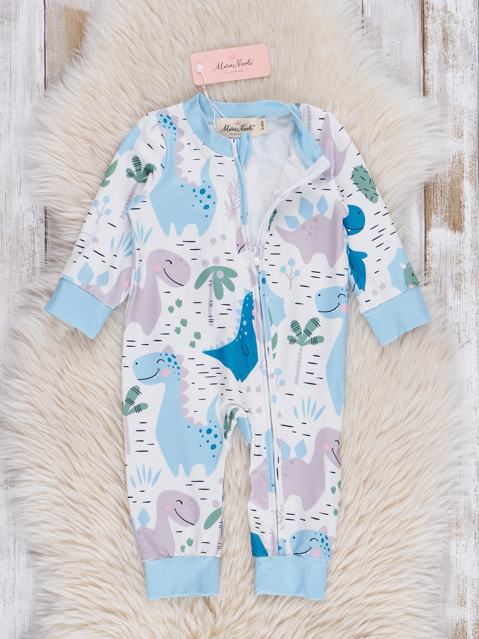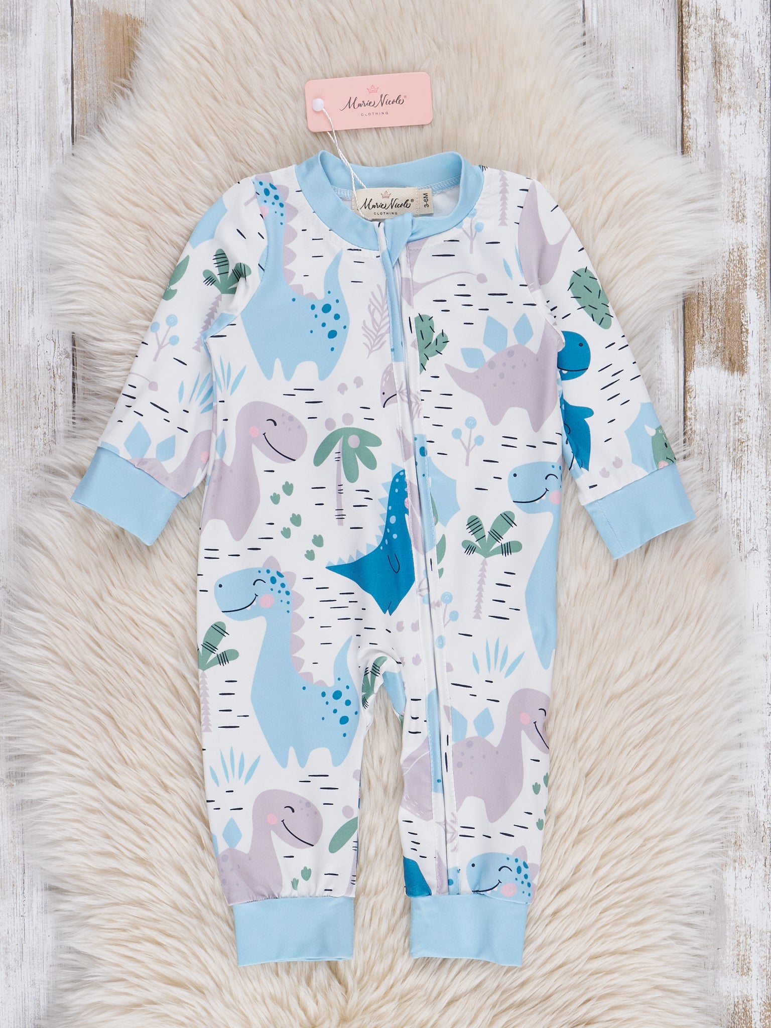 Introducing the Blue Sweet Dinos Sleeper Pajamas - the perfect jammies for your little rascal. With its asymmetrical zipper closure, these boys pajamas provides a snug yet comfortable fit for a sound sleep. Let our playful dino print add a splash of fun to their bedtime routine with this sleep set by Marie Nicole Clothing.