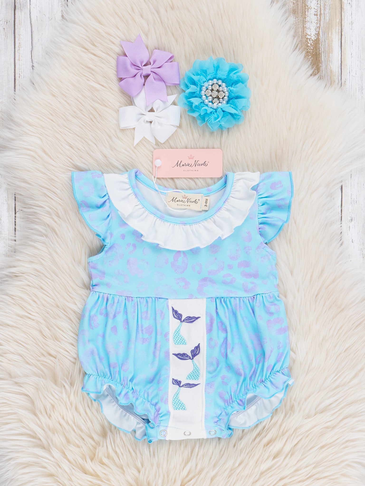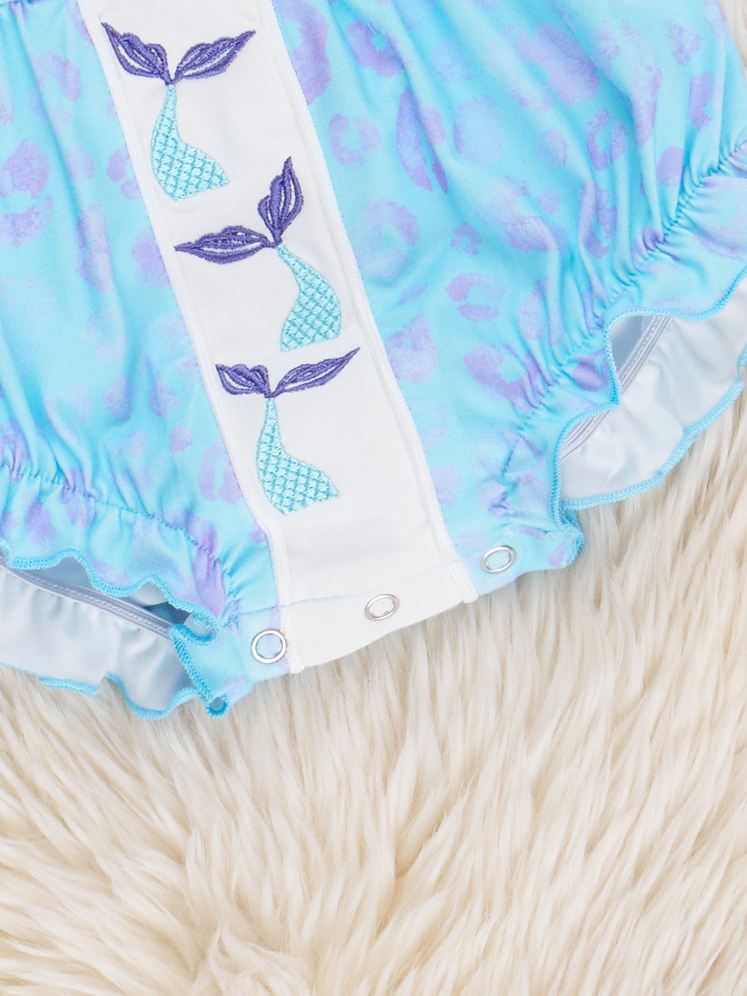 Unleash your wild side with the Leopard Mermaid Ruffle Bubble. Perfect for summer adventures at the beach, this bubble features a soft blue leopard print and embroidered mermaid tails for a playful touch. From Marie Nicole Clothing, this bubble is also available as a sister set for double the fun!