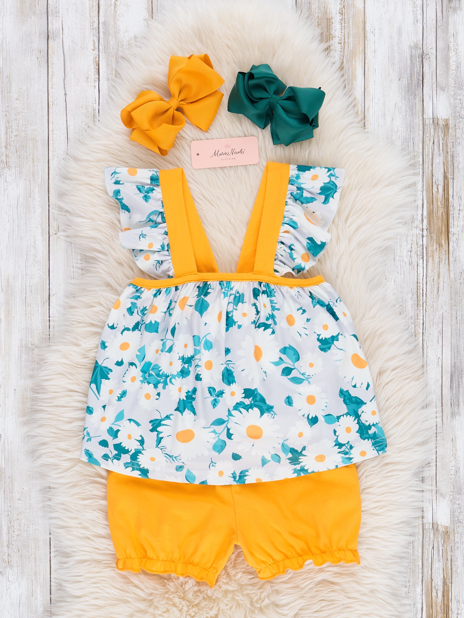 Get your little flower girl ready for spring with our Blue & Yellow Garden Ruffle Outfit! This adorable girls shorts set features a daisy print top with flutter sleeves paired with playful yellow ruffle shorts. The perfect sister set brought to you by Marie Nicole Clothing.