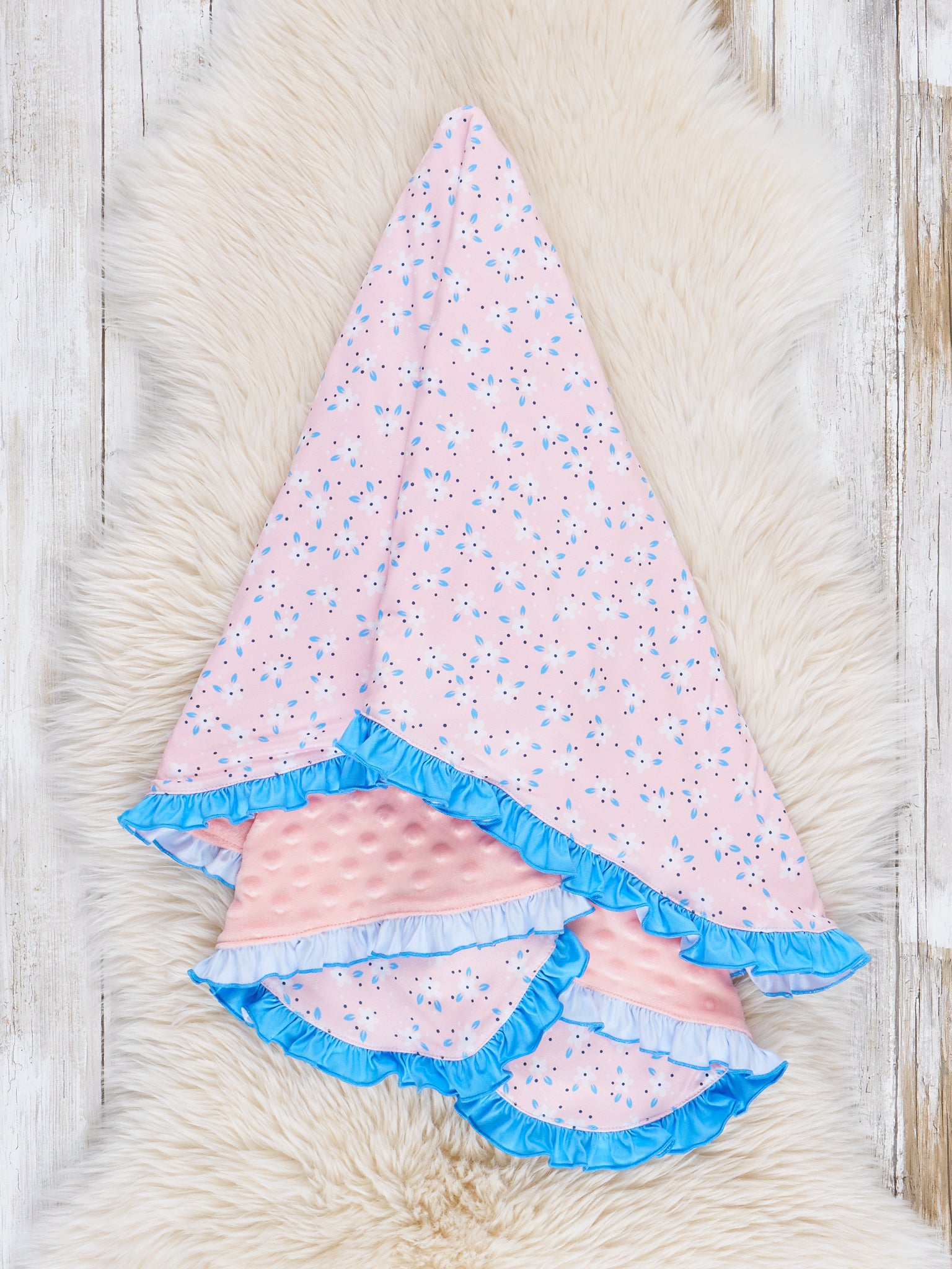 Featuring a sweet, classic floral print with blue ruffle accents, this cozy Blushing Stripes Ruffle Minky Blanket by Marie Nicole Clothing will have them snoozing in style.