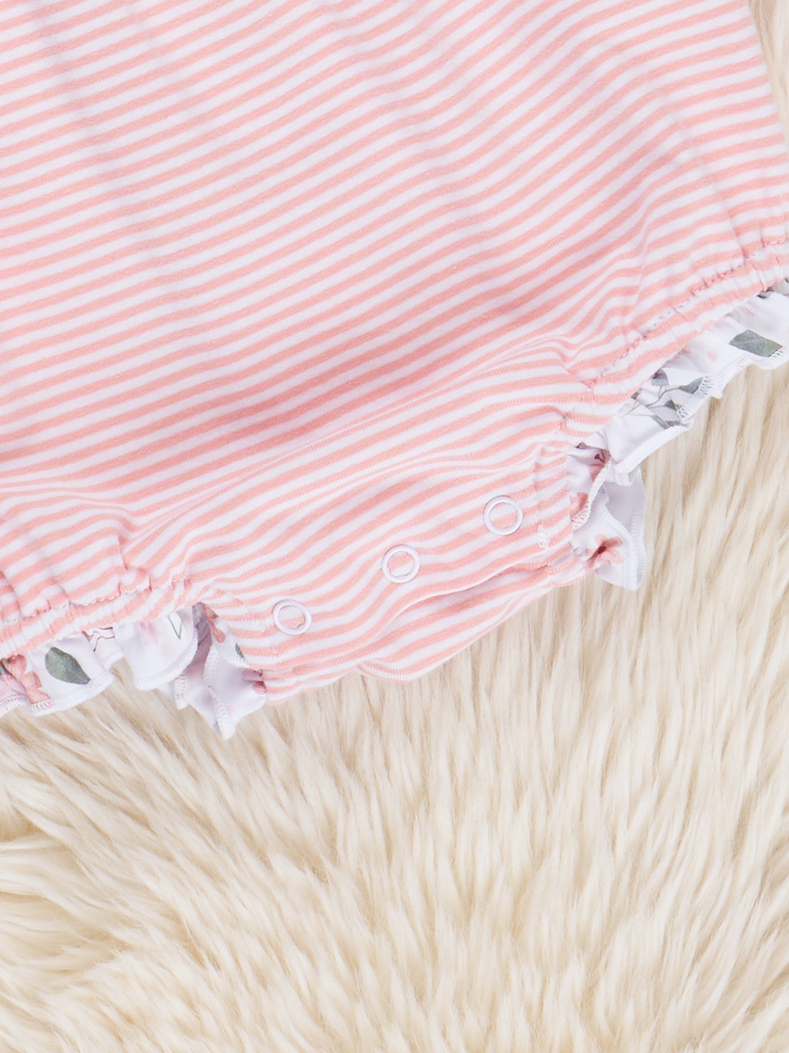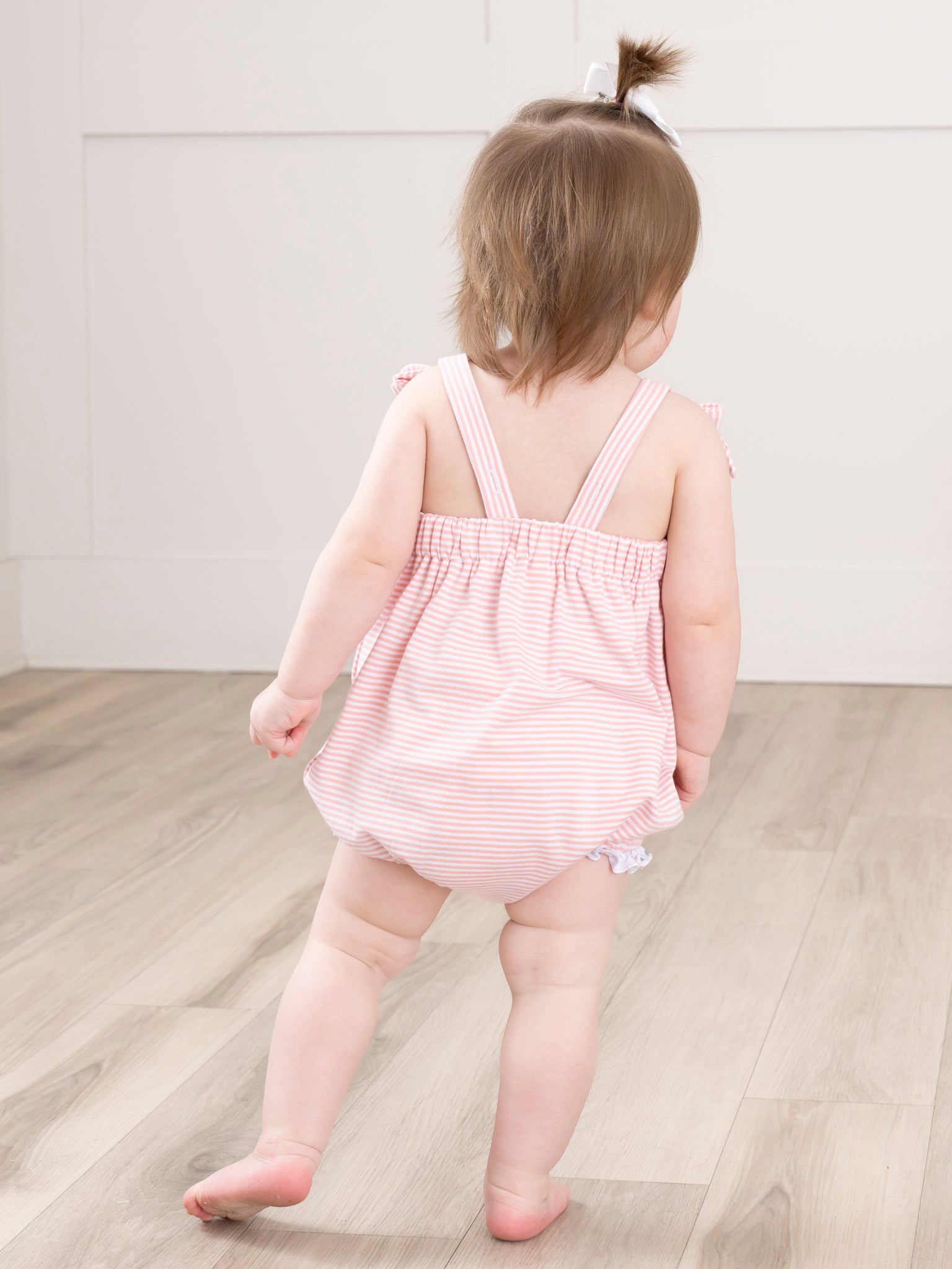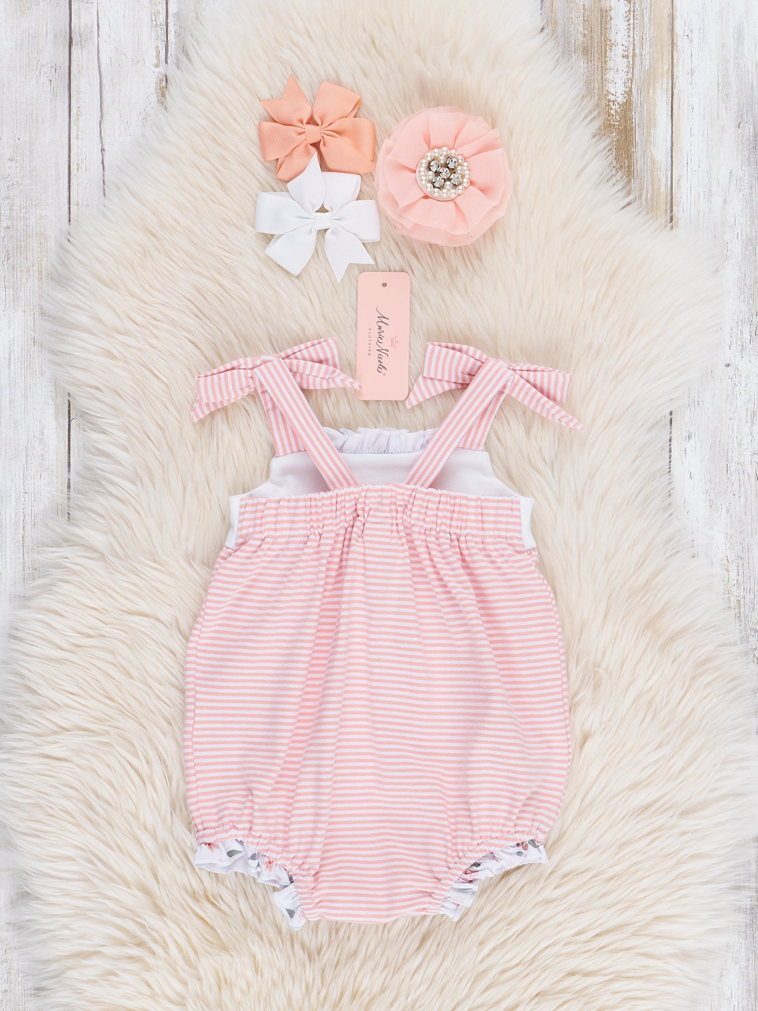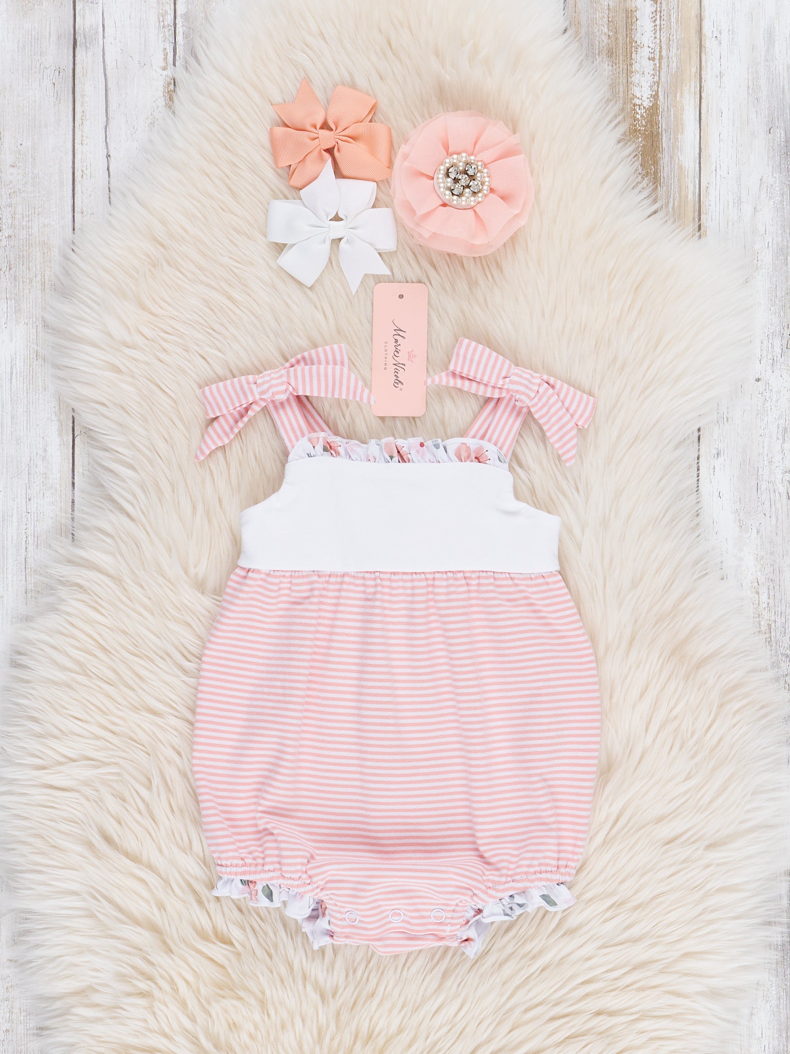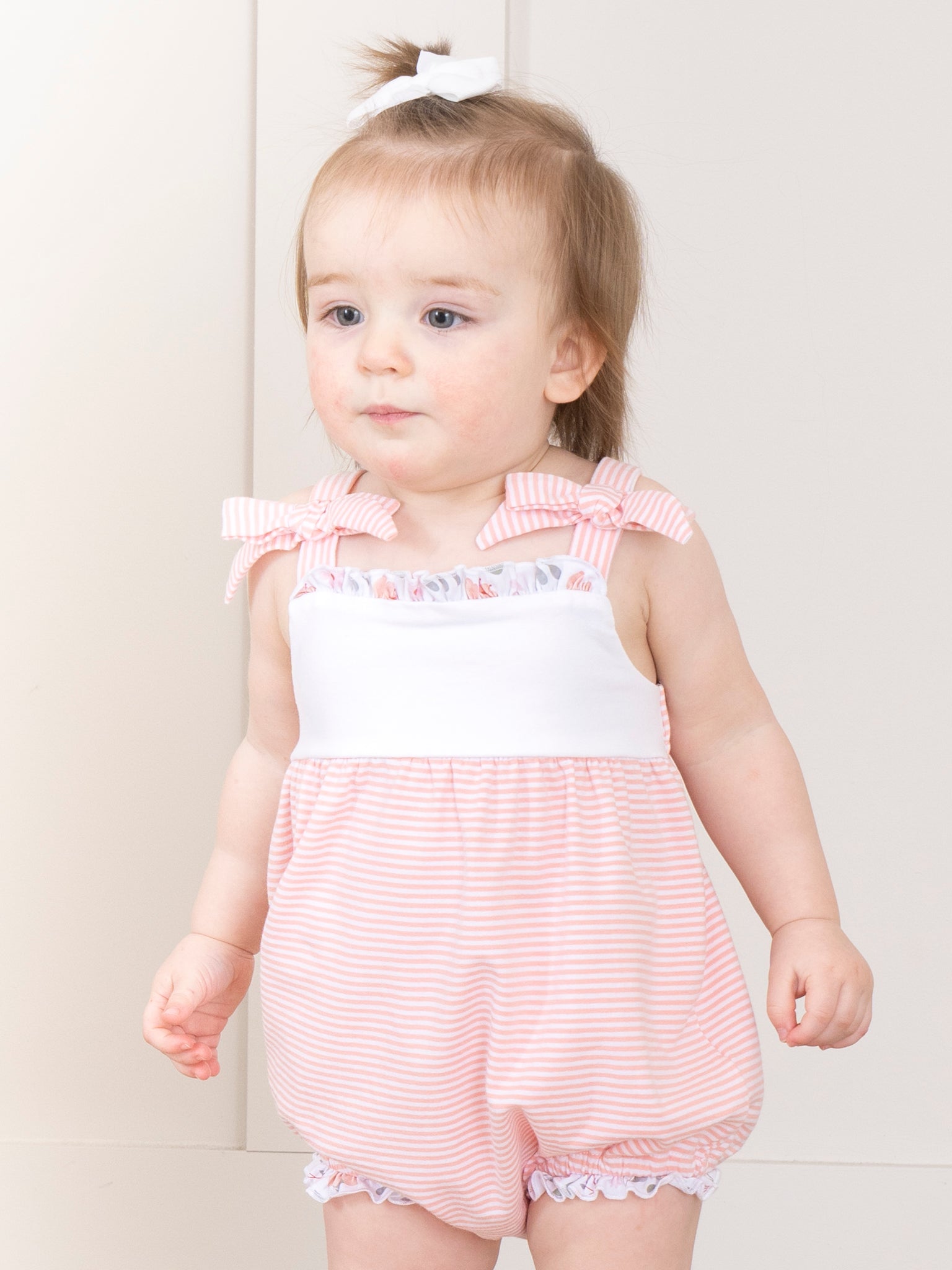 Get ready to bloom with our Blushing Bouquets Tie Ruffle Bubble! With peach stripes and a vintage floral ruffle hem, this summer bubble is perfect for your little fashionista. The tie straps add a cute touch while the white space make it perfect for personalization for your little one. A must-have for trendy girls! Whether twirling through a garden or enjoying a cozy afternoon, Blushing Bouquets brings a sense of sweetness and sophistication to your little one’s wardrobe.