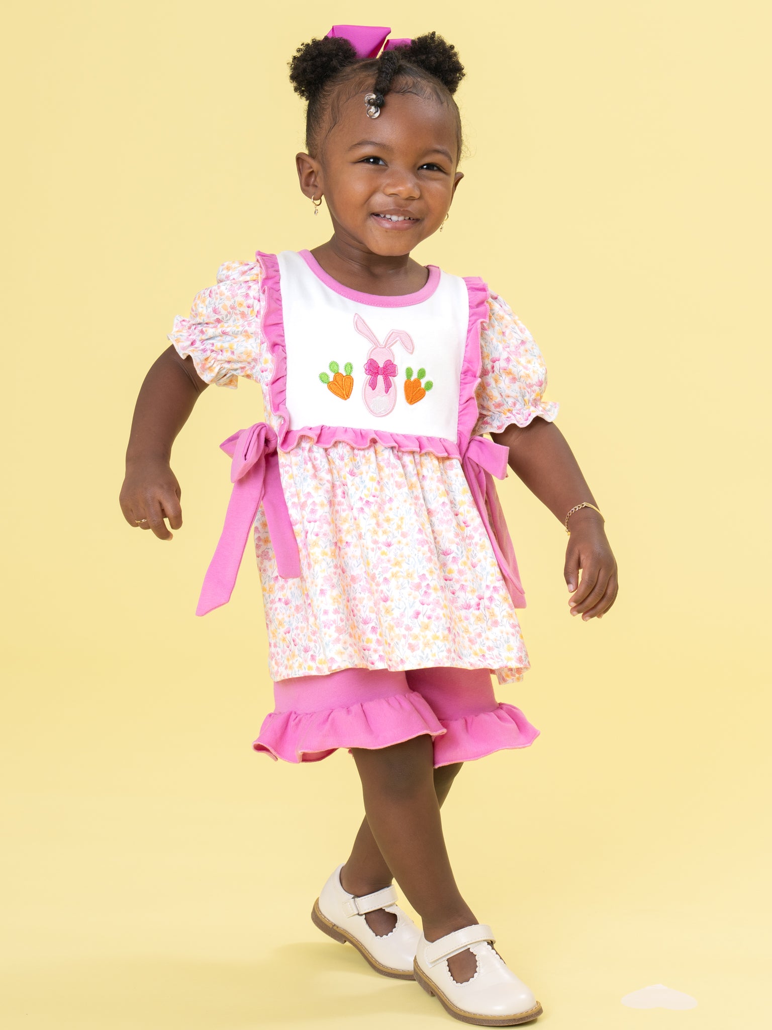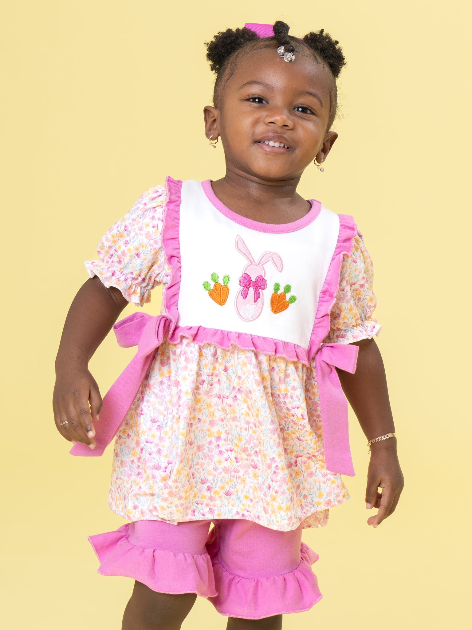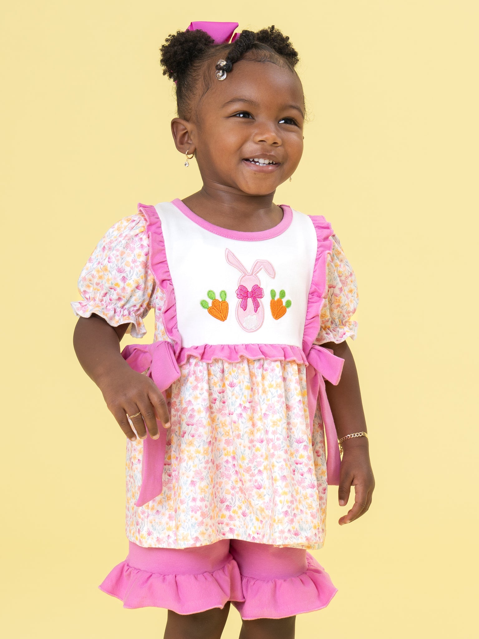 Bow Bunny Blossom Embroidered Ruffle Outfit by Marie Nicole Clothing features a floral puff-sleeve top with bunny-and-blossom embroidery, side sash bows, and a flowy silhouette, paired with ruffle-trim shorts. This outfit highlights classic smocking, playful prints, and cheerful bows for girly charm ideal for Easter, outings, or family gatherings.