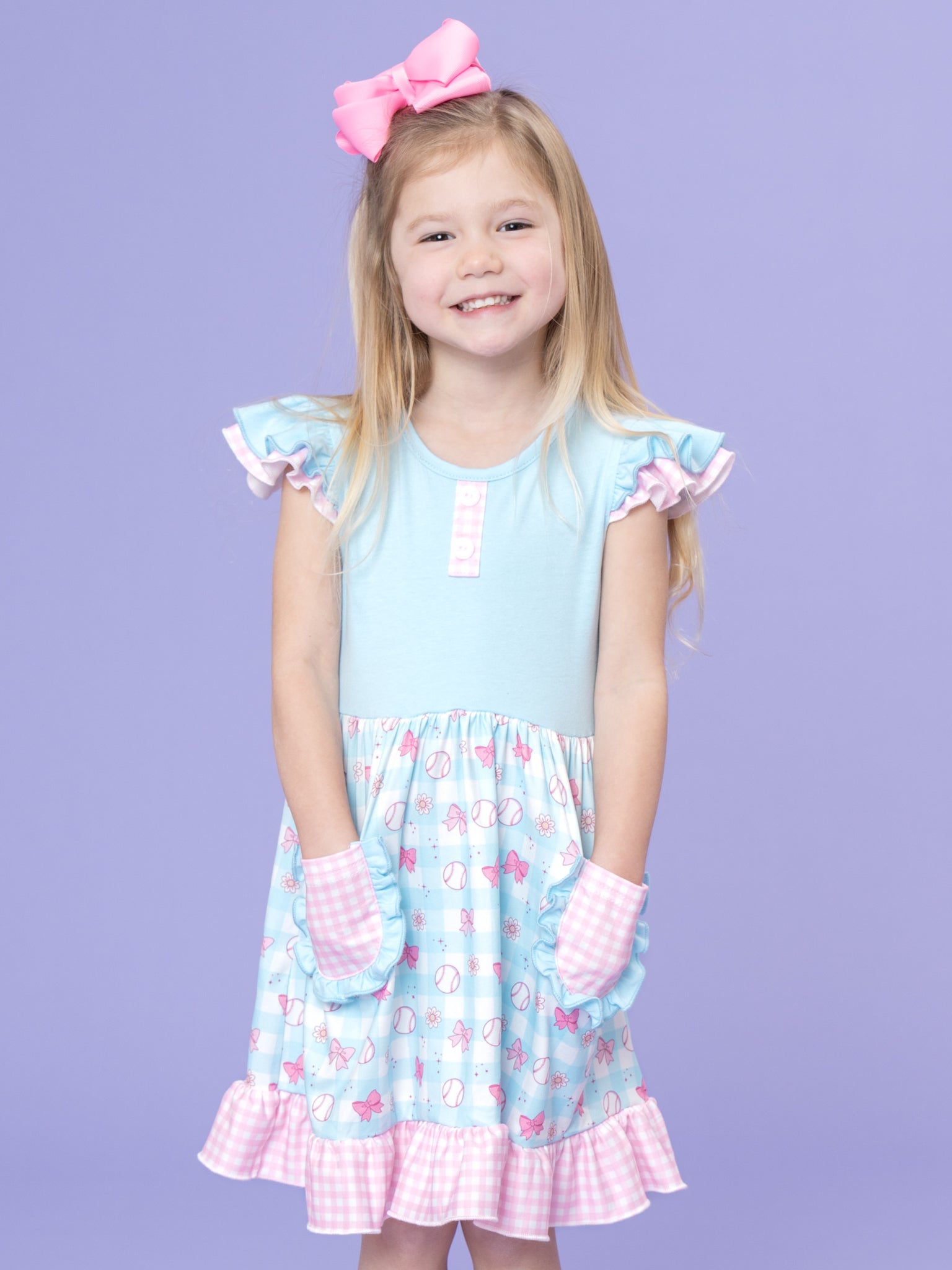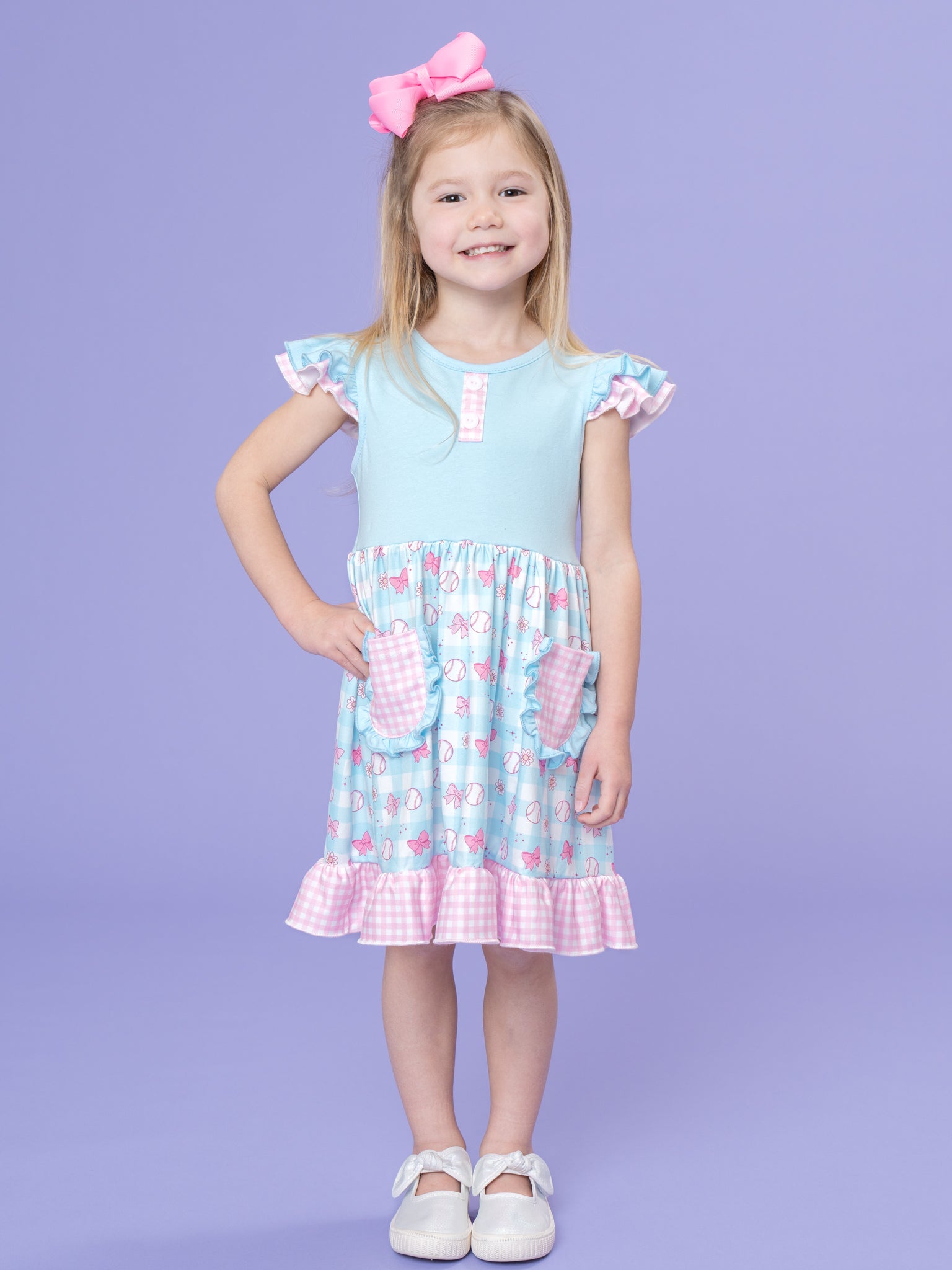 Bowtie Ballpark Ruffle Dress by Marie Nicole Clothing serves up sweet vintage game-day charm with flutter sleeves, a soft knit bodice, and a twirly skirt sprinkled in playful ballpark motifs. From Marie Nicole, front pockets and a frilly hem invite twirls, giggles, and all-day adventures, perfect for cheering, celebrating, and capturing keepsake photos.