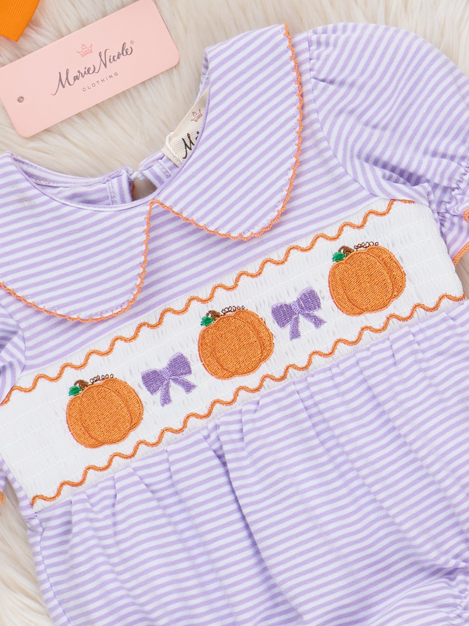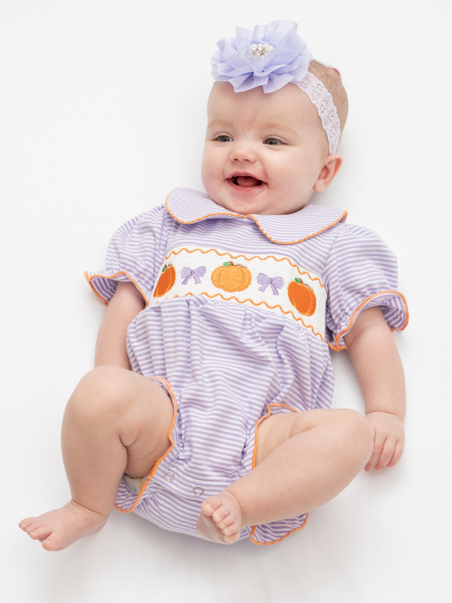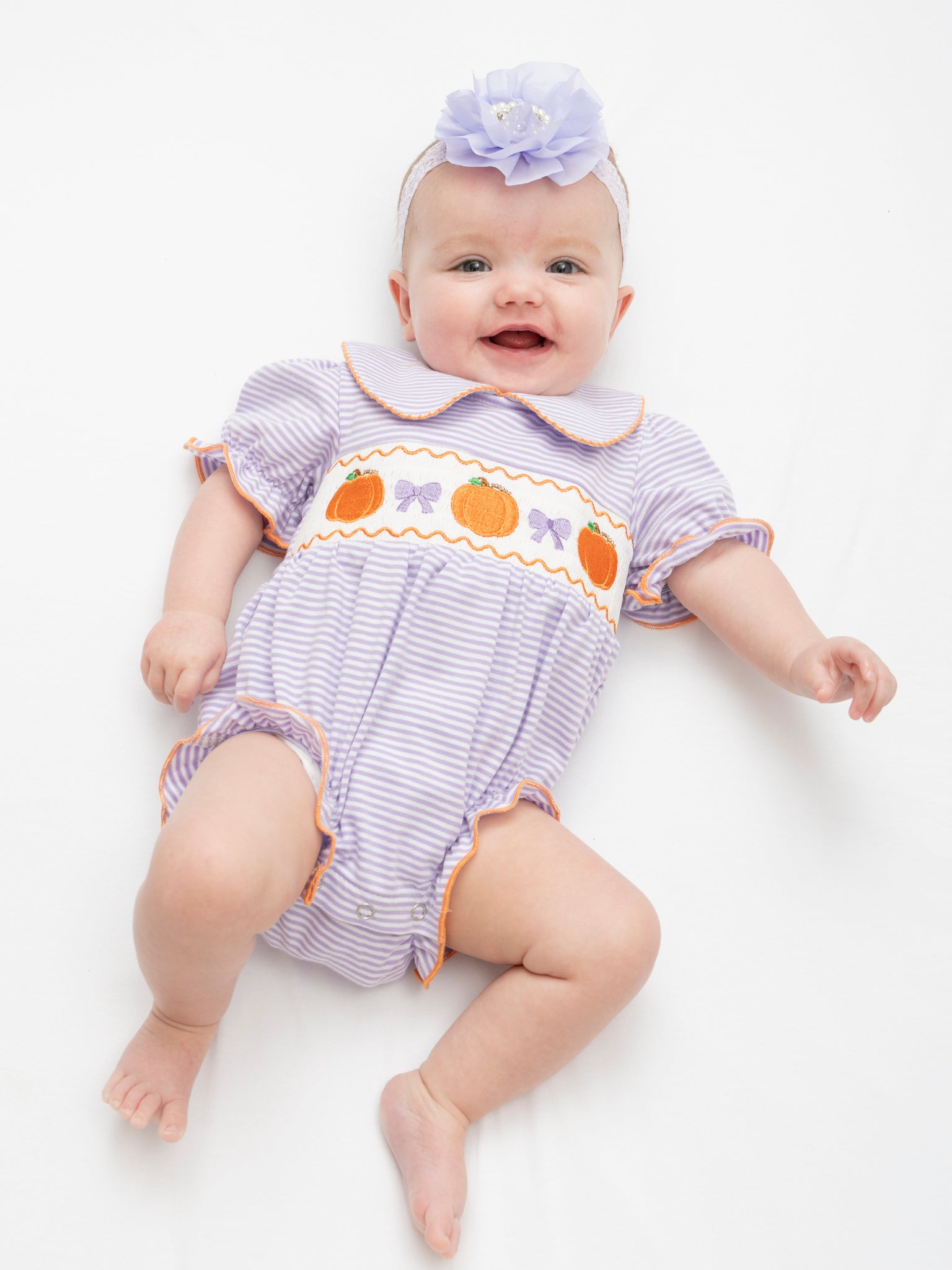The Bow-tiful in the Patch Embroidered Bubble is an enchanting and adorable one-piece that captures both fall and Halloween cheer. With a smocked bodice, decorated with festive embroidered pumpkins and bows, this soft and comfy romper from Marie Nicole Clothing brings fun to any event, whether picking pumpkins or carving them!