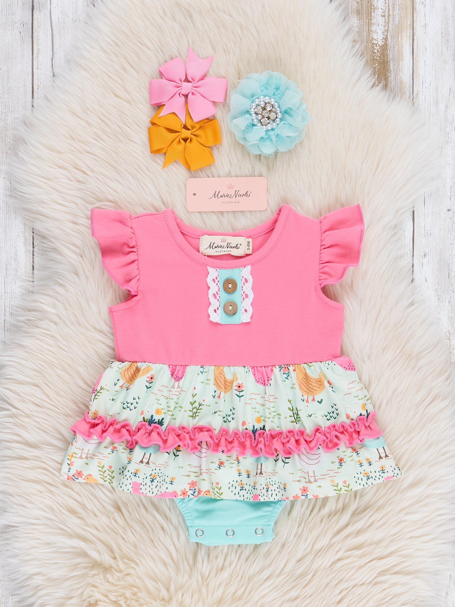 A "Bright Roaming Chickens Ruffle Bubble" perfect for summer festivities! This girls bubble features a playful pink bodice and a pretty roaming chickens print peplum ruffle overlay that will surely make you stand out. The flutter sleeves add a charming touch, and it comes in a matching sister set. Get ready to strut your stuff in this Marie Nicole Clothing design!