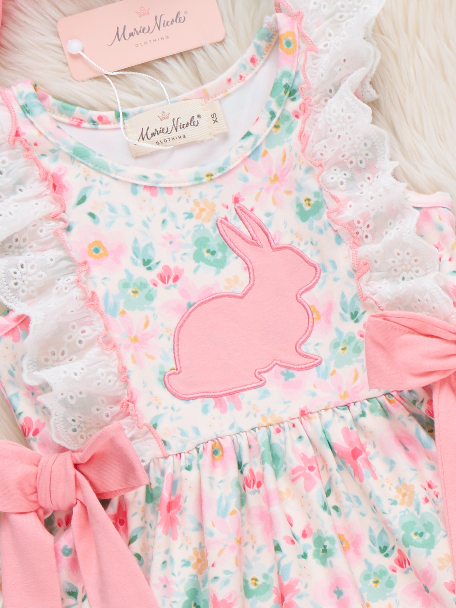 Bunny Bloom Embroidered Ruffle Dress by Marie Nicole Clothing features a sweet bunny appliqué, floral pattern, and soft ruffle trim. The dress is finished with playful side bow sashes and a delicate lace hem, creating a picture-perfect look for spring celebrations, Easter festivities, or any cheerful day of twirling and play.