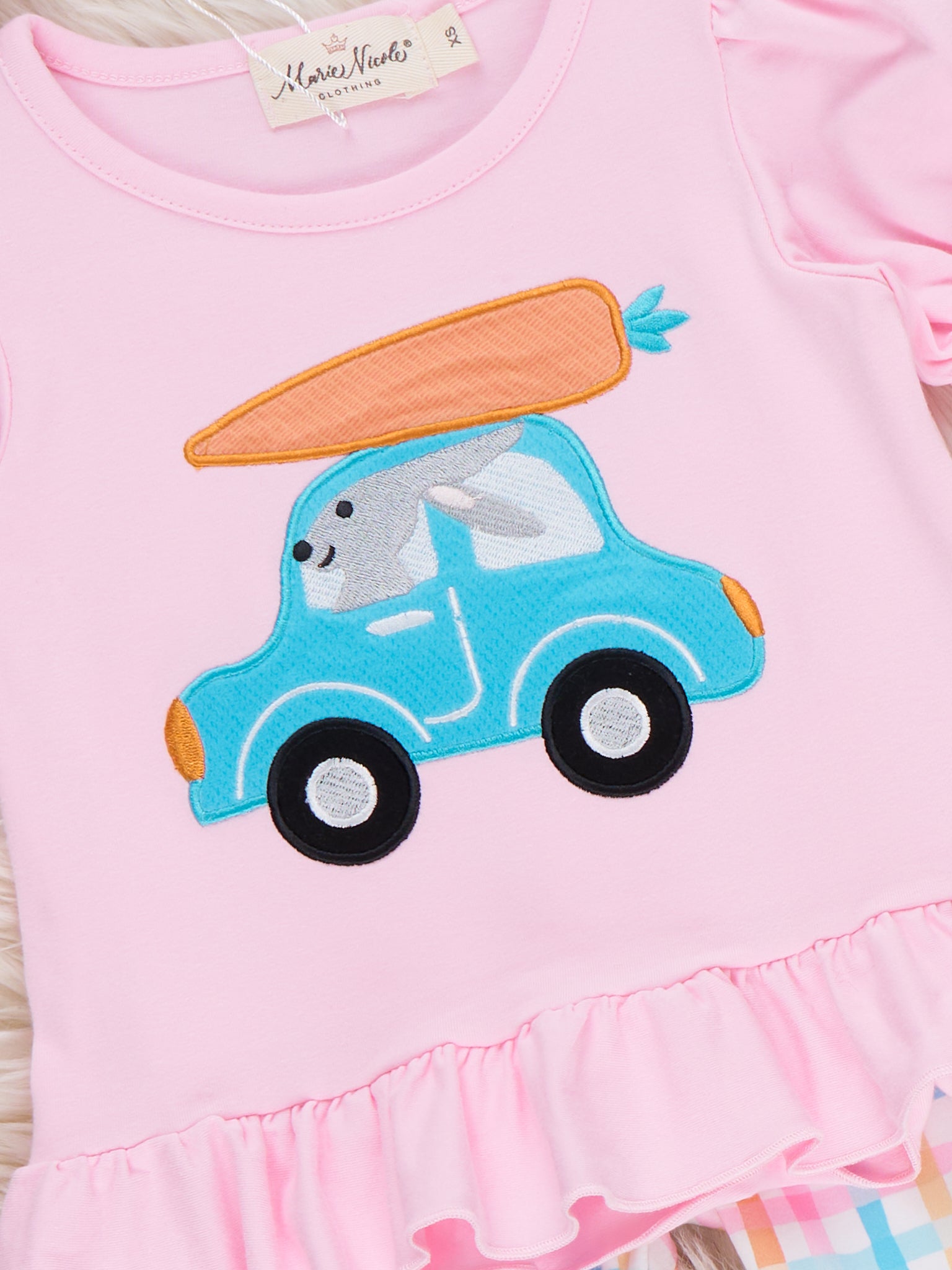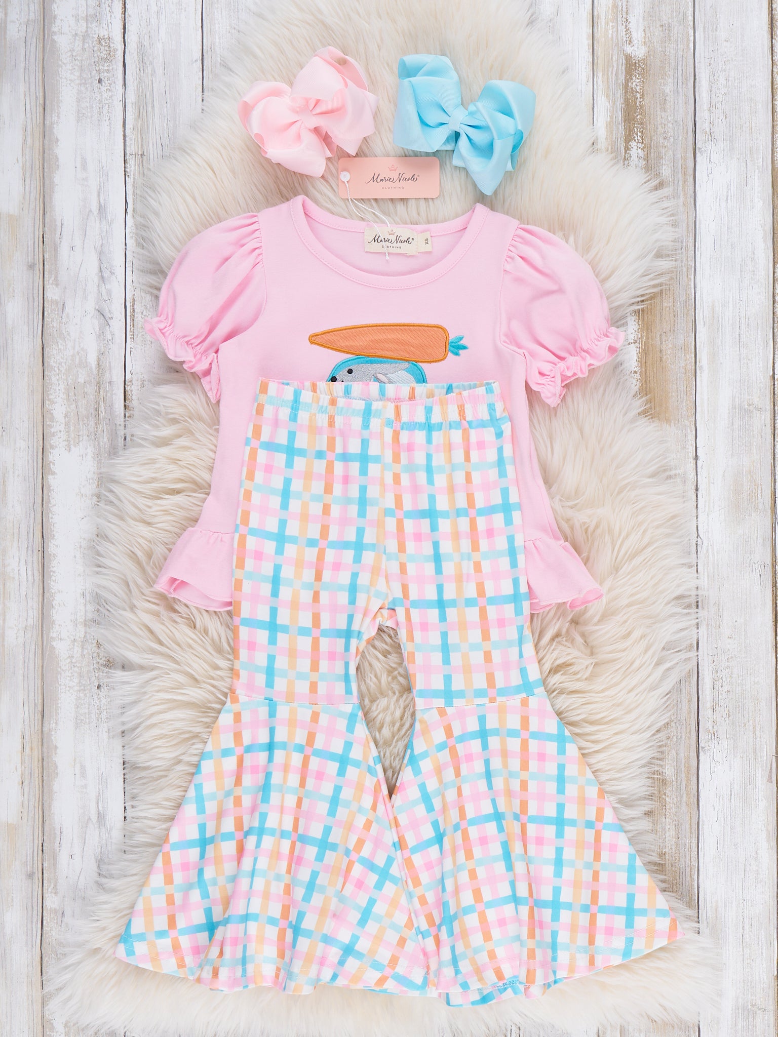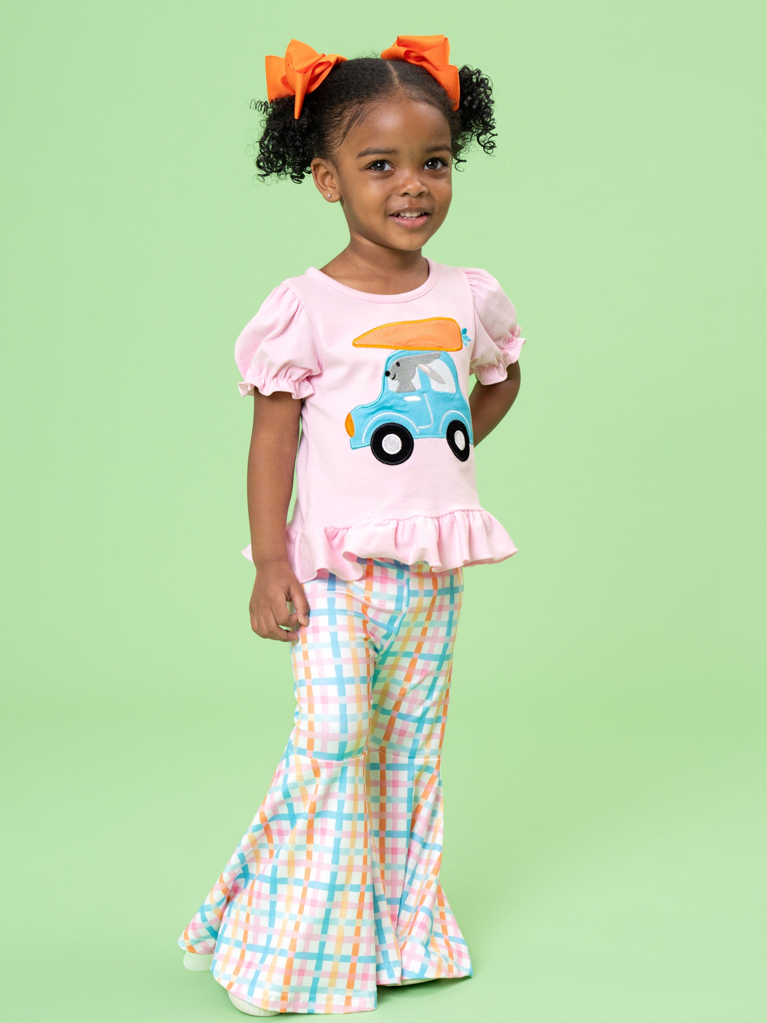 Bunny Carrot Joyride Embroidered Bell Bottom Outfit by Marie Nicole Clothing is a fun two-piece set with a cotton puff-sleeve peplum top featuring an embroidered bunny cruising in a car with a carrot on the roof. Coordinating pastel plaid bell-bottom pants add extra flair, making this playful outfit perfect for Easter parades, spring parties, and joyful everyday adventures.