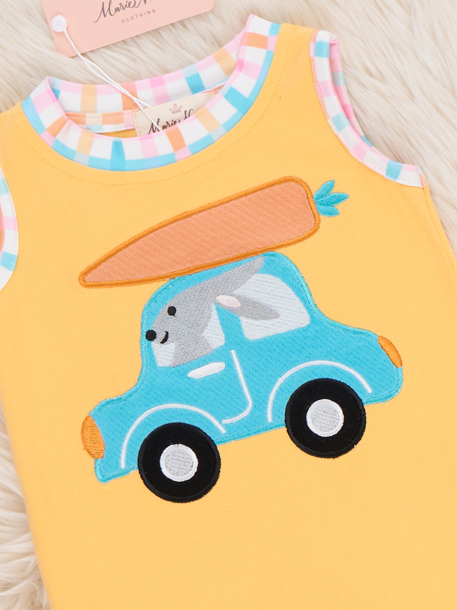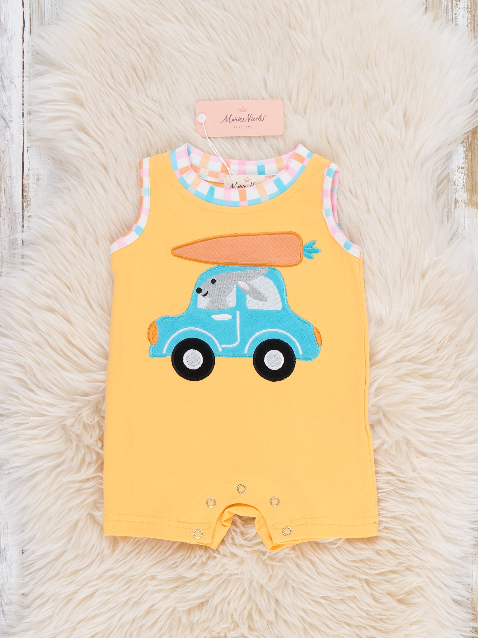 Bunny Carrot Joyride Embroidered Johnny by Marie Nicole Clothing features a sleeveless jonjon with an applique of a bunny driving a truck delivering a carrot. With its soft knit fabric, lively spring-themed embroidery, and easy snap closures, this romper is a cheerful and practical choice for spring outings and Easter celebrations.