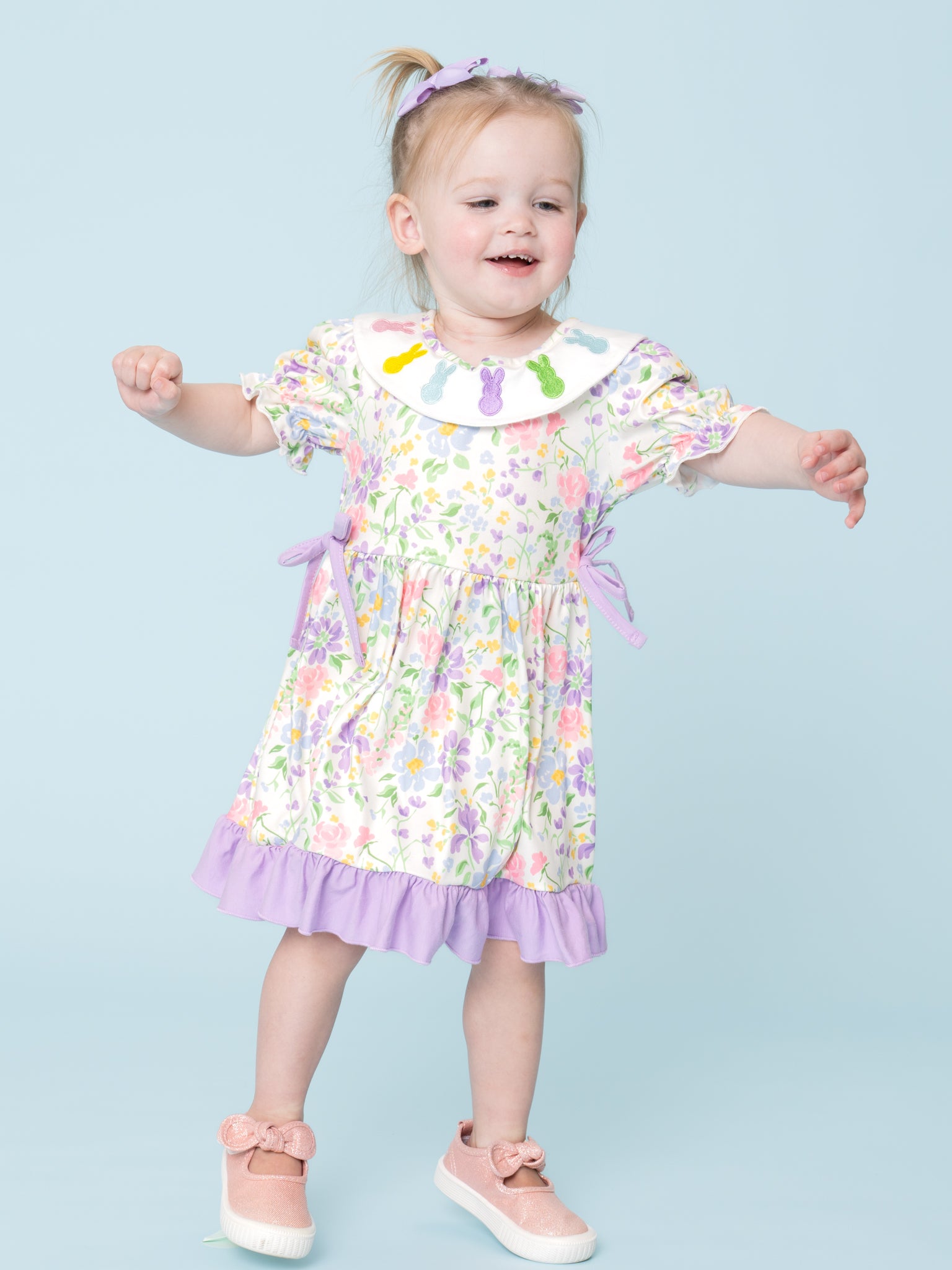 Hop into spring with our Bunny Floral Embroidered Ruffle Dress! This adorable girls dress features a whimsical watercolor garden print, with delicate bow and ruffle details. Embroidered bunnies on the collar add a sweet touch, making it the perfect Easter outfit.