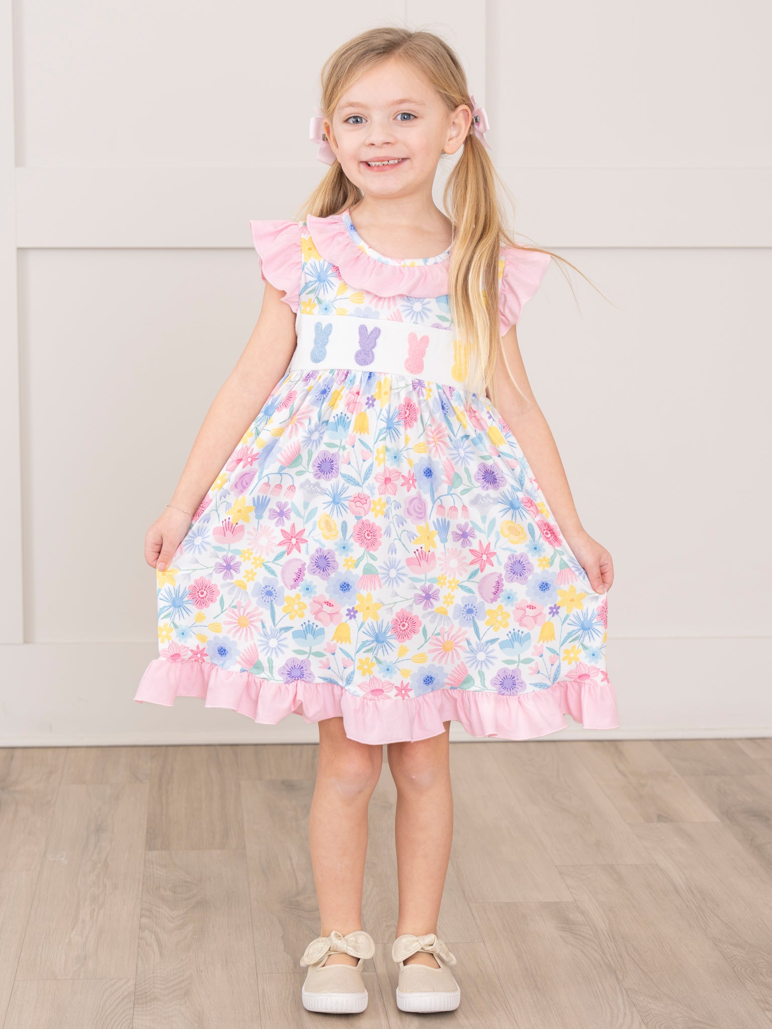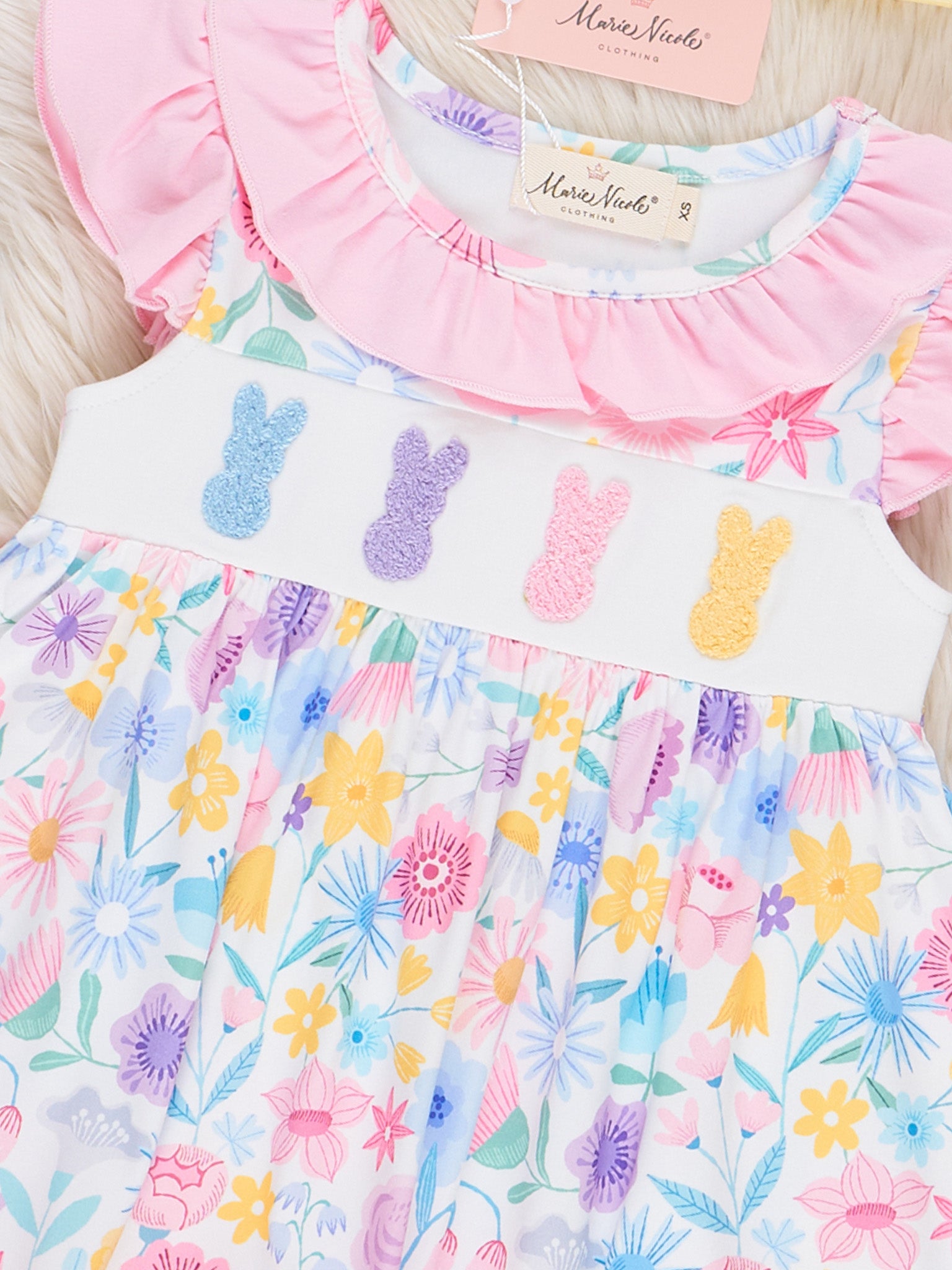 Hop into spring with this adorable Bunny Garden Embroidered Ruffle Dress! Made with a whimsical watercolor garden print and cute embroidered chenille bunnies, this dress is perfect for Easter or any springtime occasion.
