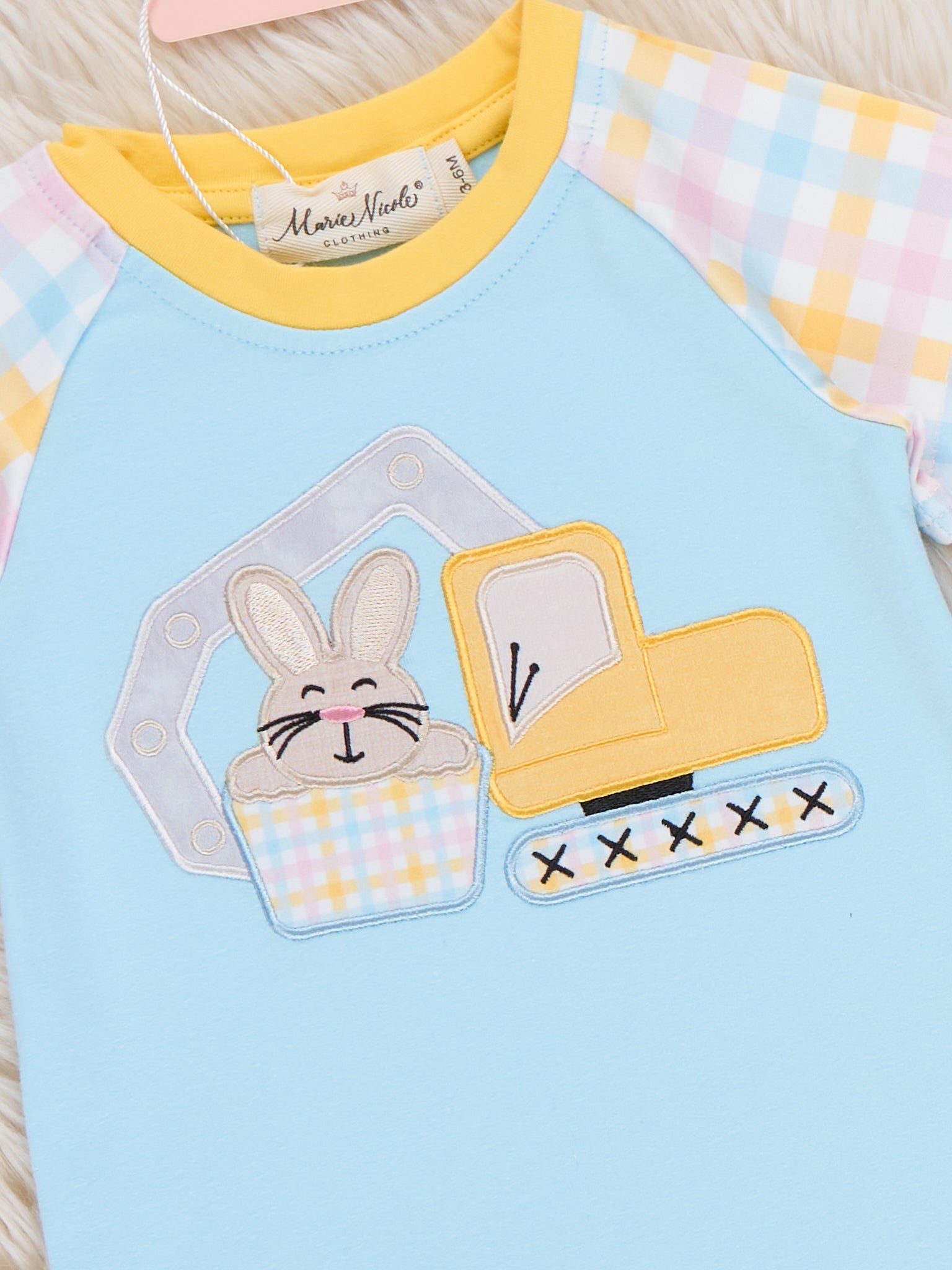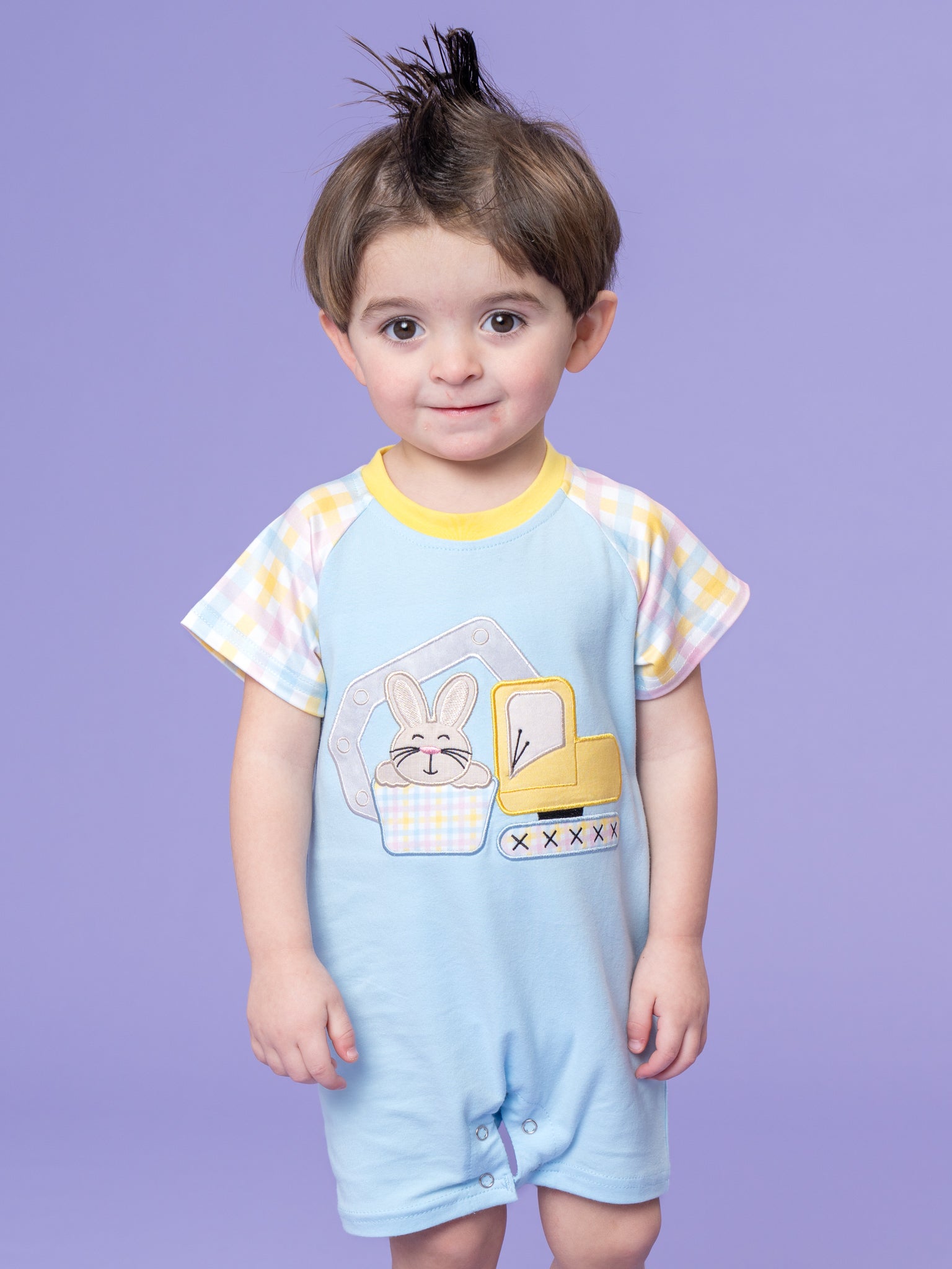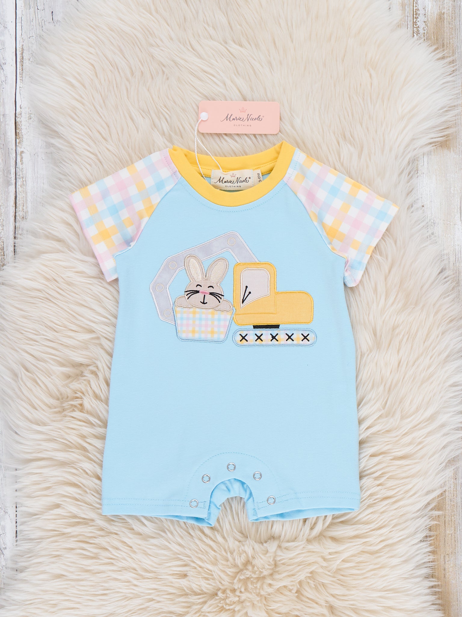 The Bunny Loader Embroidered Romper by Marie Nicole Clothing delights with its embroidered bunny loader graphic, raglan sleeves, and playful romper silhouette for bouncy charm. Snap closures and stretchy fabric ensure easy all-day comfort for wiggly adventures, while construction details add fun boutique flair. Perfect for family gatherings, photos, or festive play full of whimsy and joyful energy.