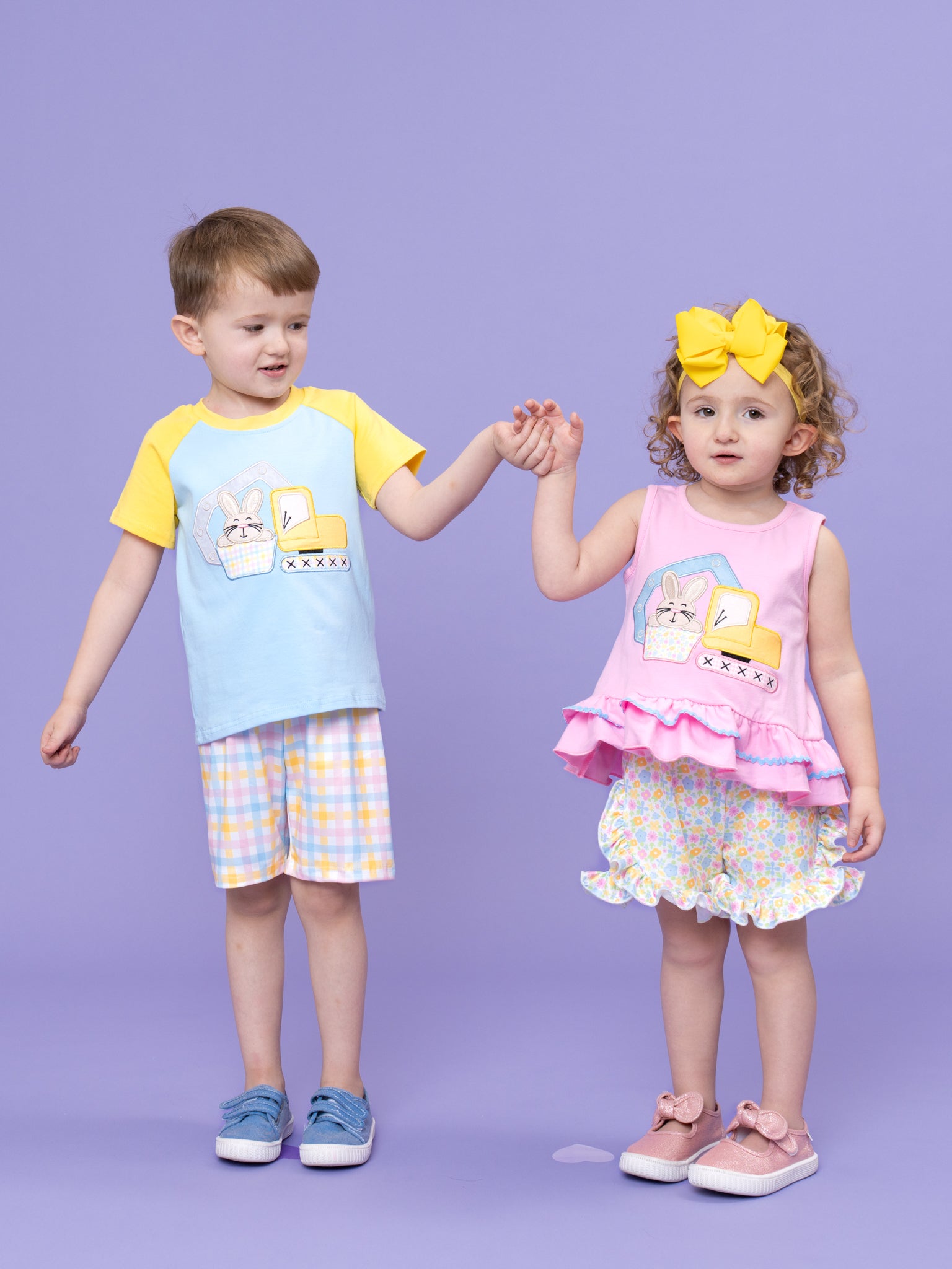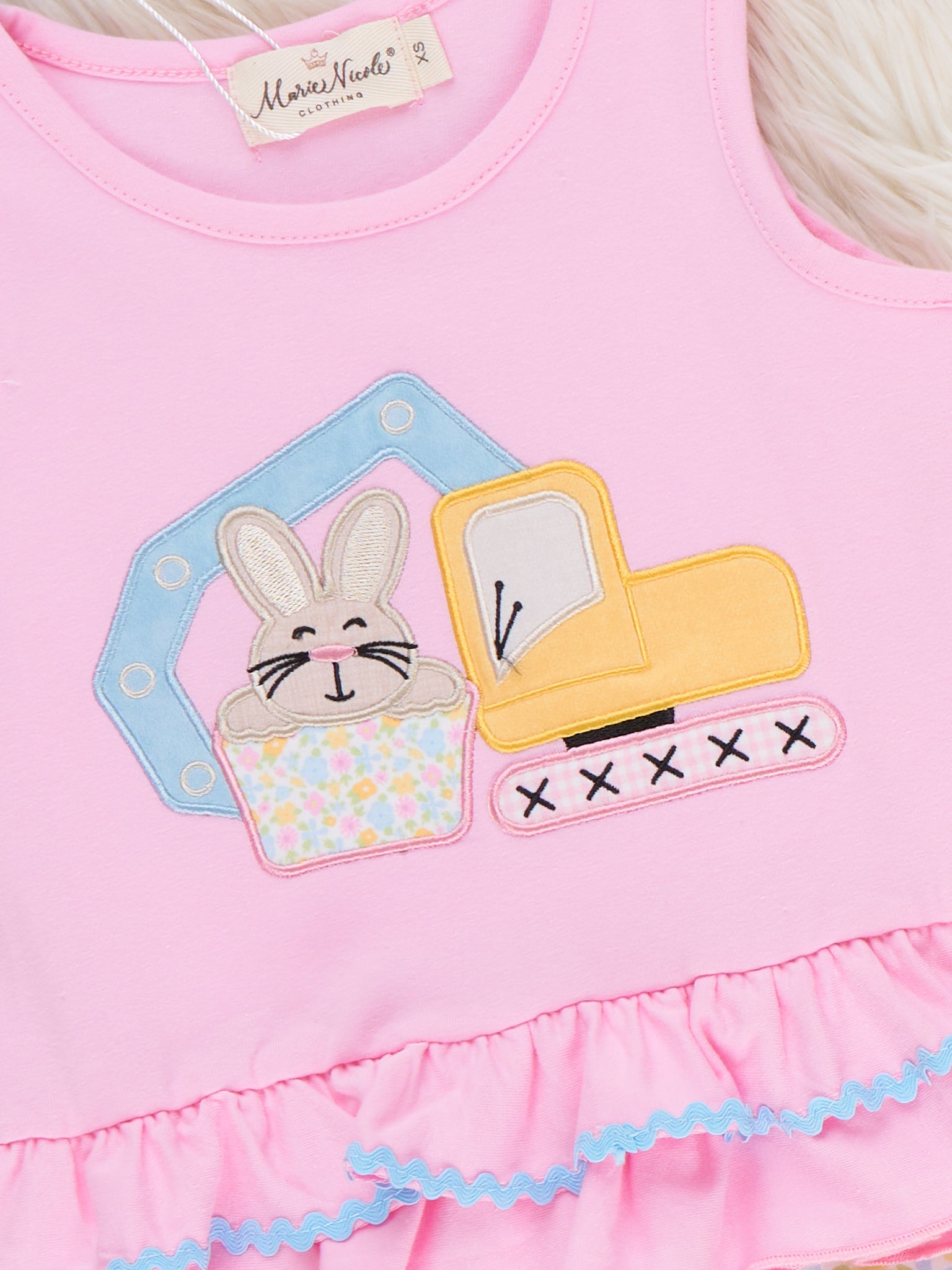 The Bunny Loader Embroidered Ruffle Outfit by Marie Nicole Clothing delights with its embroidered bunny loader graphic on the cotton tank top and matching floral shorts set for playful charm. Ruffle hems add bouncy movement for active adventures, while soft stretchy fabric ensures all-day comfort during play. Perfect for family gatherings, photos, or festive moments full of boutique whimsy and joyful energy.