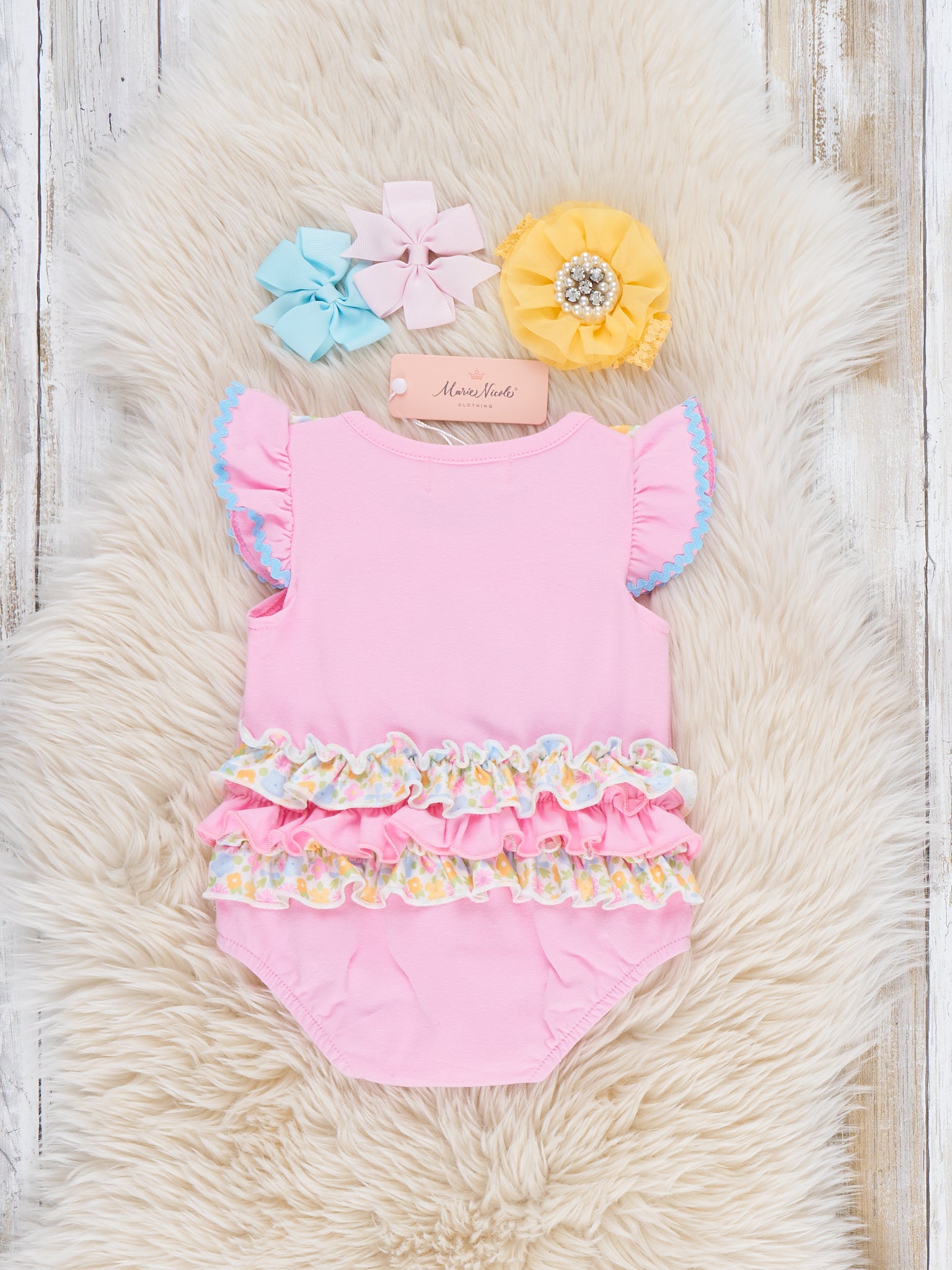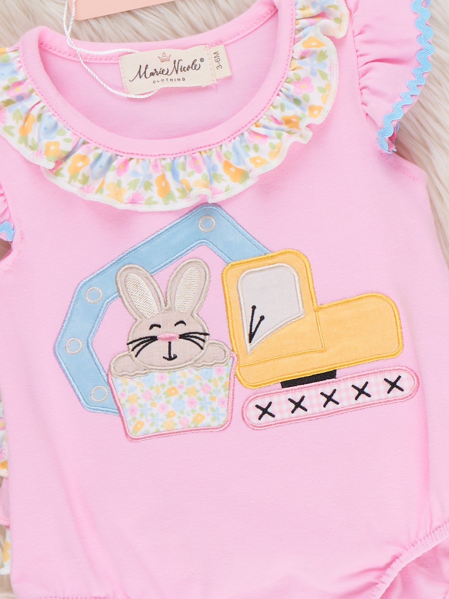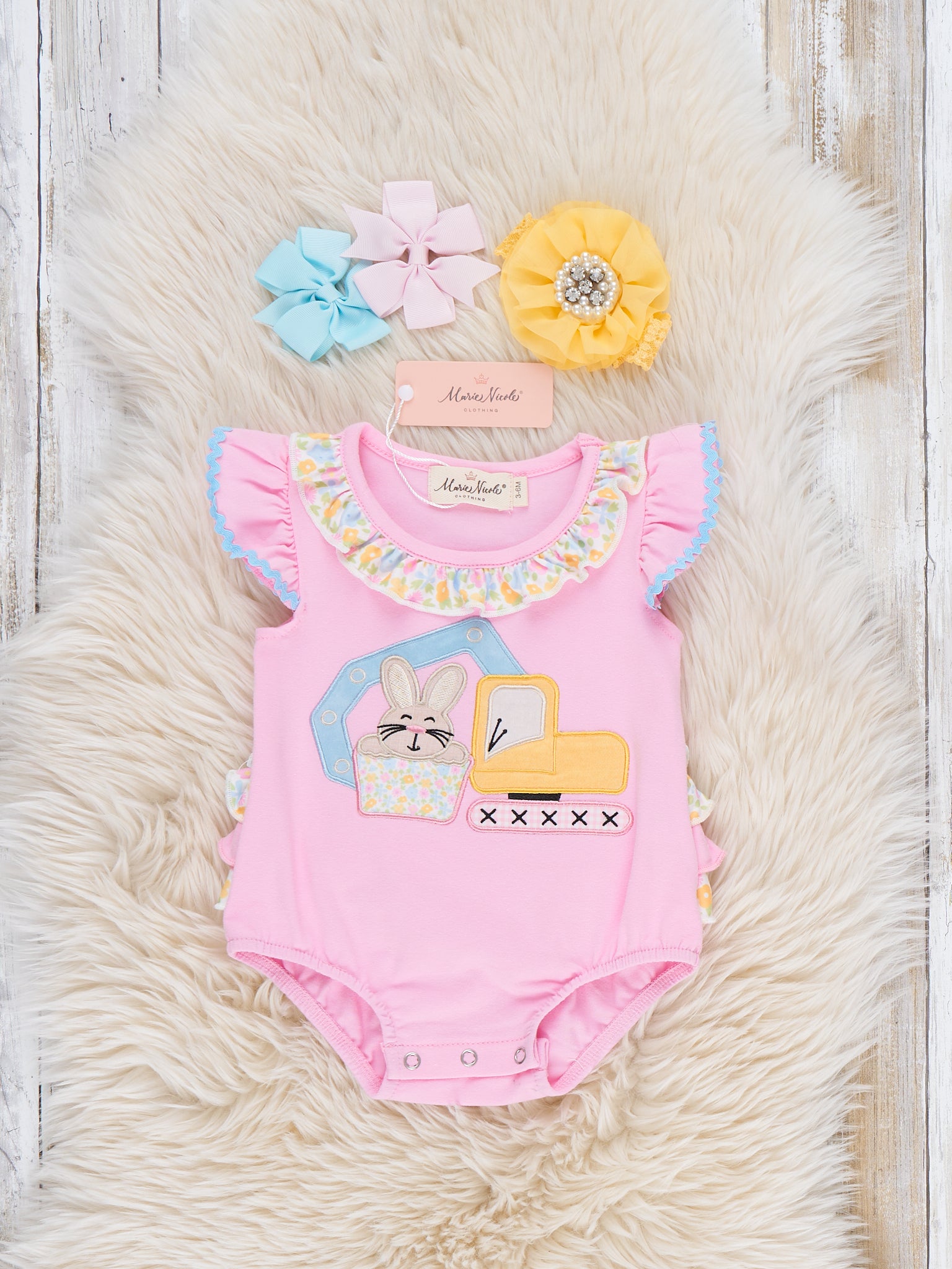 The Bunny Loader Embroidered Romper by Marie Nicole Clothing delights with its embroidered bunny loader graphic, flutter collar, and playful bubble silhouette for bouncy charm. Ruffle details add wiggly fun for active adventures, while soft stretchy fabric ensures snug all-day comfort during play. Perfect for family gatherings, photos, or festive moments full of boutique whimsy and joyful energy.