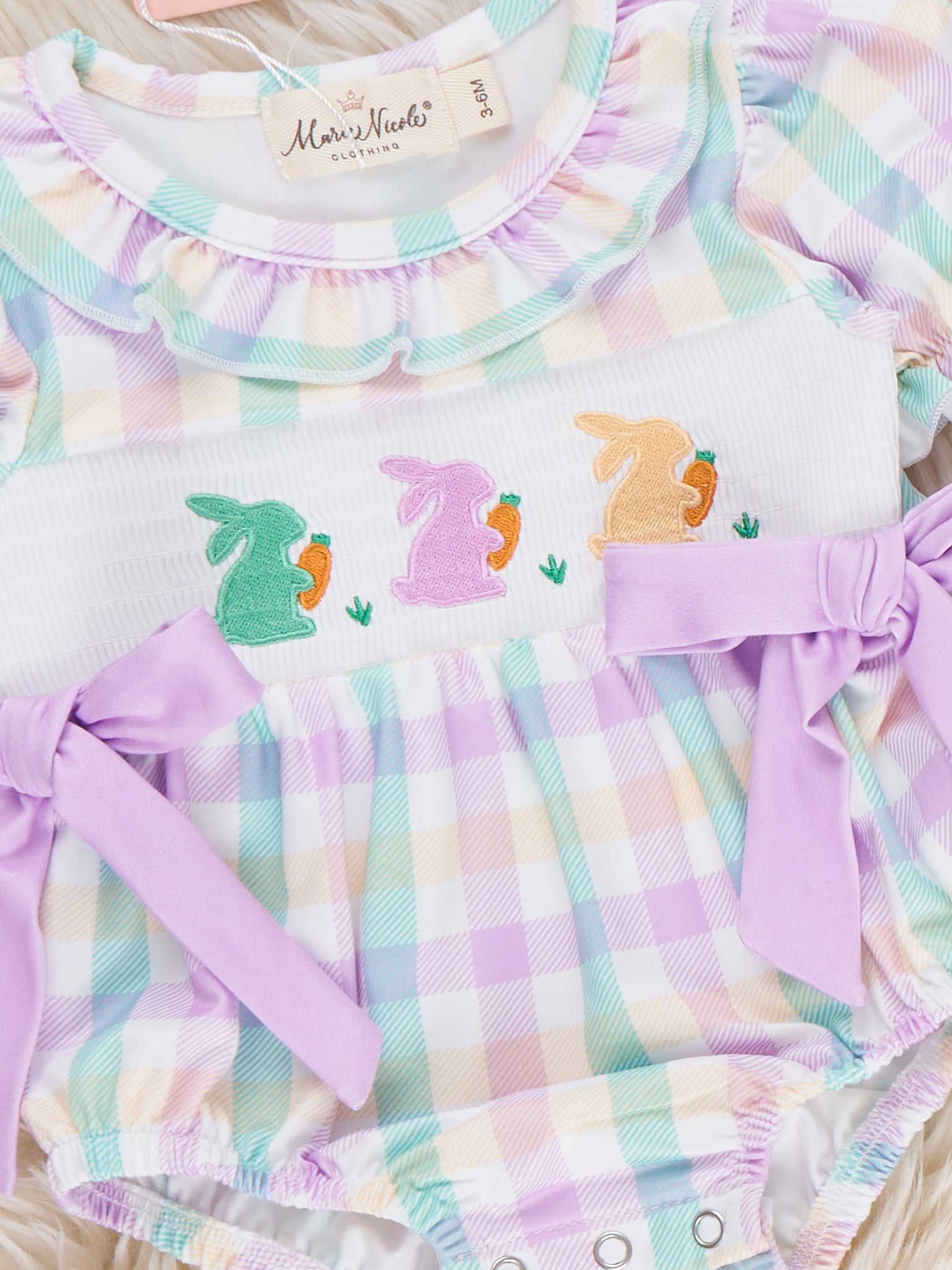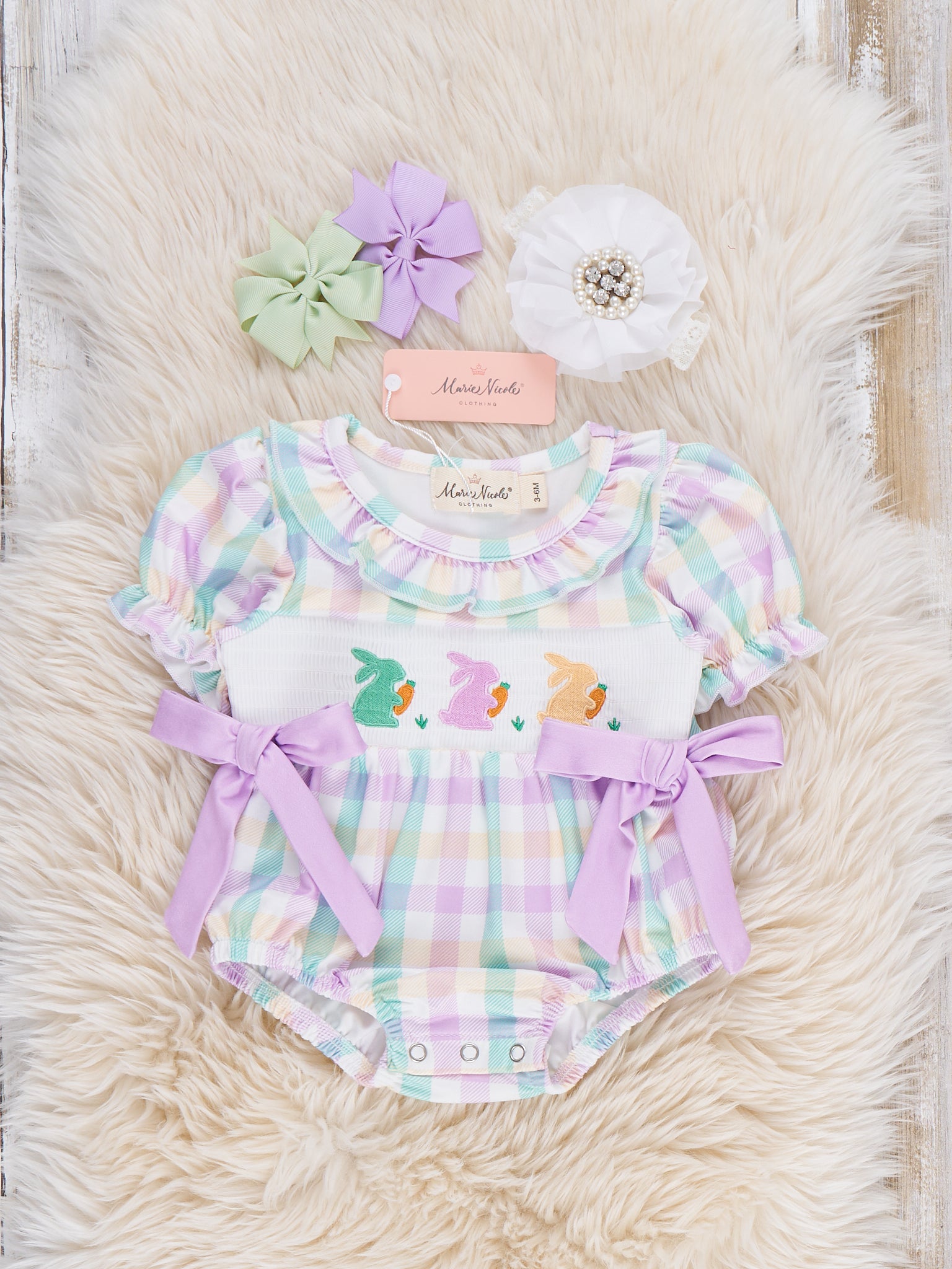 Bunny Snack Plaid Smocked Romper by Marie Nicole Clothing is a pastel plaid one-piece with a smocked panel featuring colorful bunny silhouettes and sweet puff sleeves. Side bows, elastic leg openings, and bottom snaps make it as practical as it is precious for Easter photos, egg hunts, and sunny spring outings.