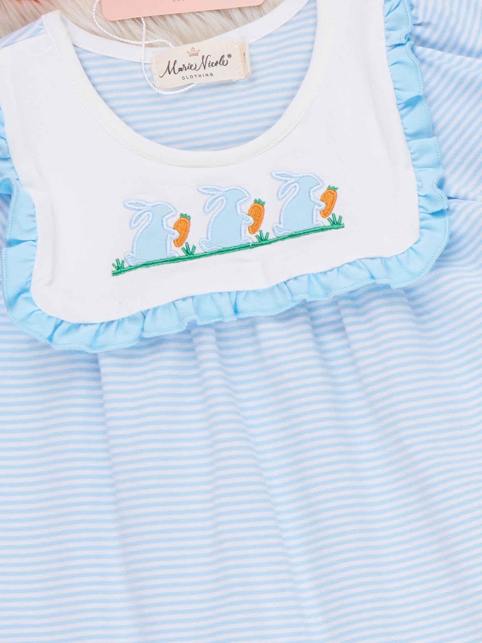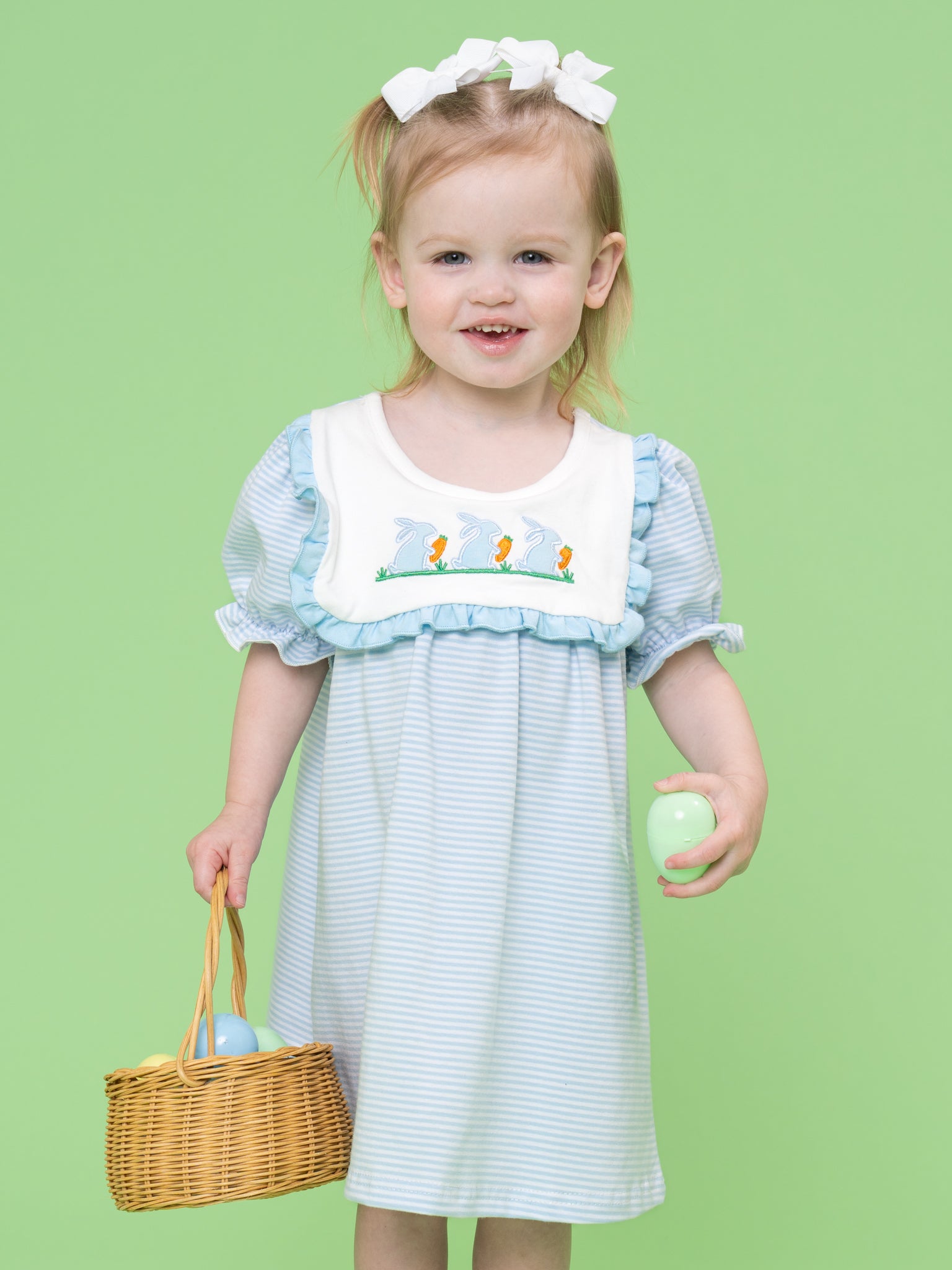 Bunny Snack Striped Embroidered Cotton Dress by Marie Nicole Clothing serves up sweet spring style with soft stripes, puff sleeves, and a smocked panel featuring busy little bunnies at snack time. From Marie Nicole, the easy A-line silhouette and comfy knit fabric make this dress perfect for church, egg hunts, and everyday twirls all season long.