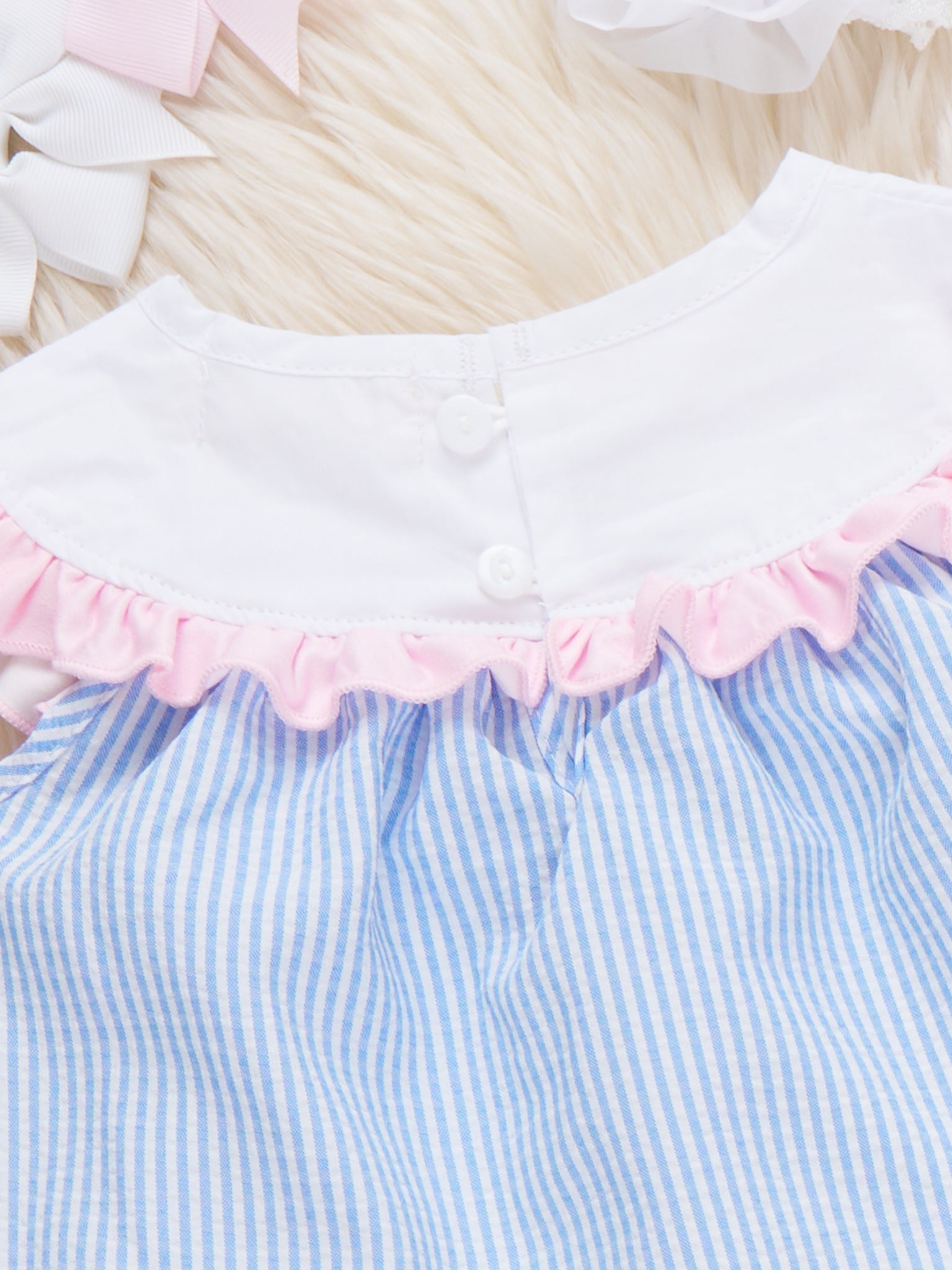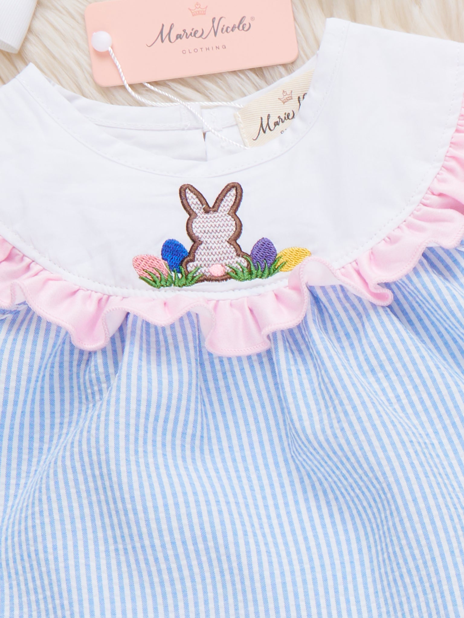 This Bunny Vintage Embroidered Poplin Bloomers Outfit is perfect for your dainty girls! This outfit by Marie Nicole Clothing features a striped top with a white round neckline, an embroidered bunny, ruffle trim, & matching bloomers with an elastic waistband.