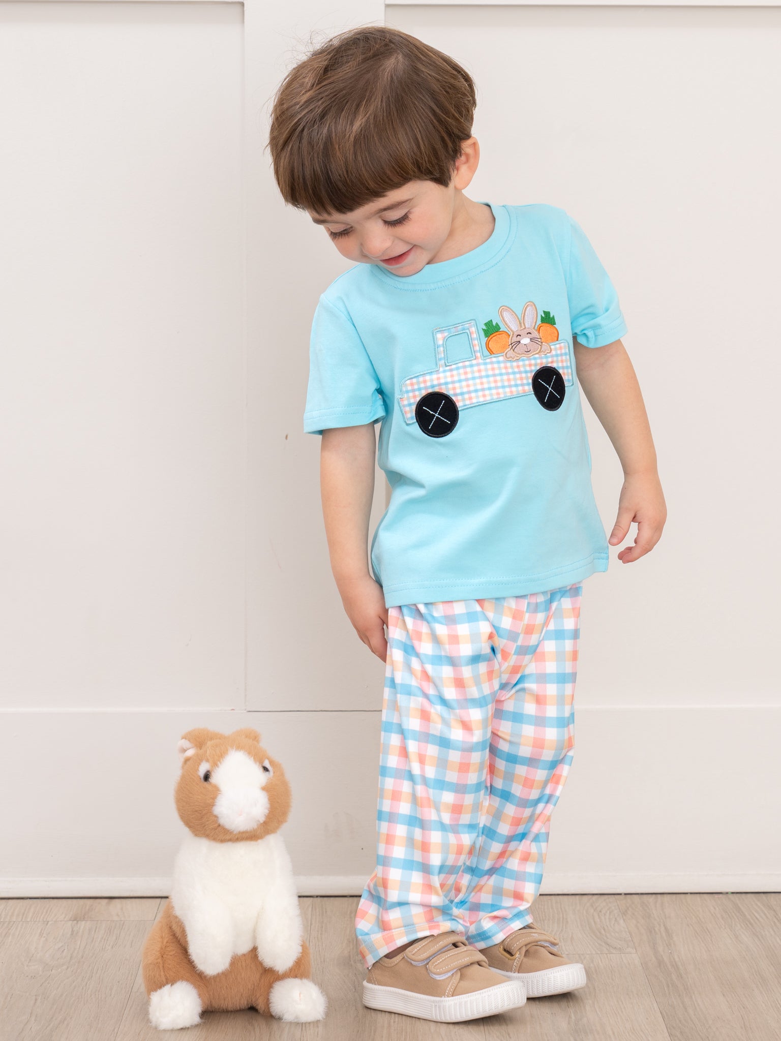Bunny’s Carrot Delivery Embroidered Outfit by Marie Nicole Clothing. This two-piece set features a short-sleeve top with an embroidered bunny-in-a-truck motif and playful button details, paired with coordinating pastel plaid pants for a cheerful spring or Easter look.