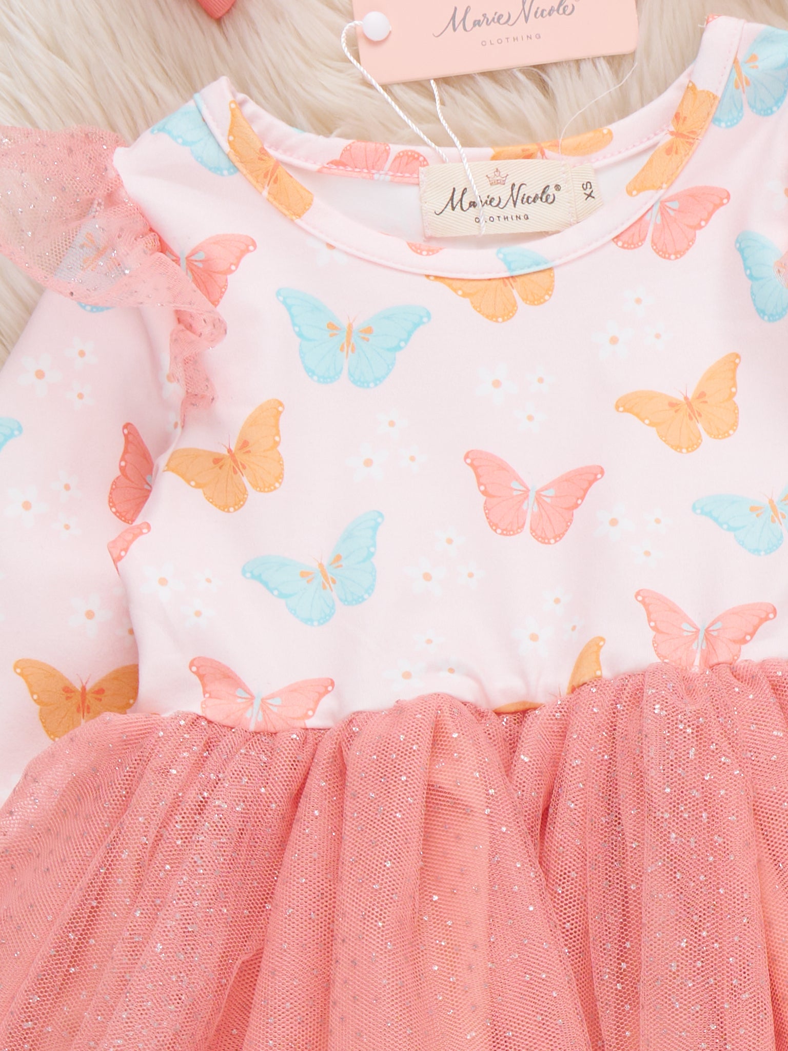 Butterfly Garden Whimsy Tulle Dress by Marie Nicole Clothing features a soft, long-sleeve bodice with charming butterfly prints and delicate tulle ruffles at the shoulders. The full, peach-toned tulle skirt brings playful elegance, making this dress perfect for spring outings, garden parties, or twirling celebrations.