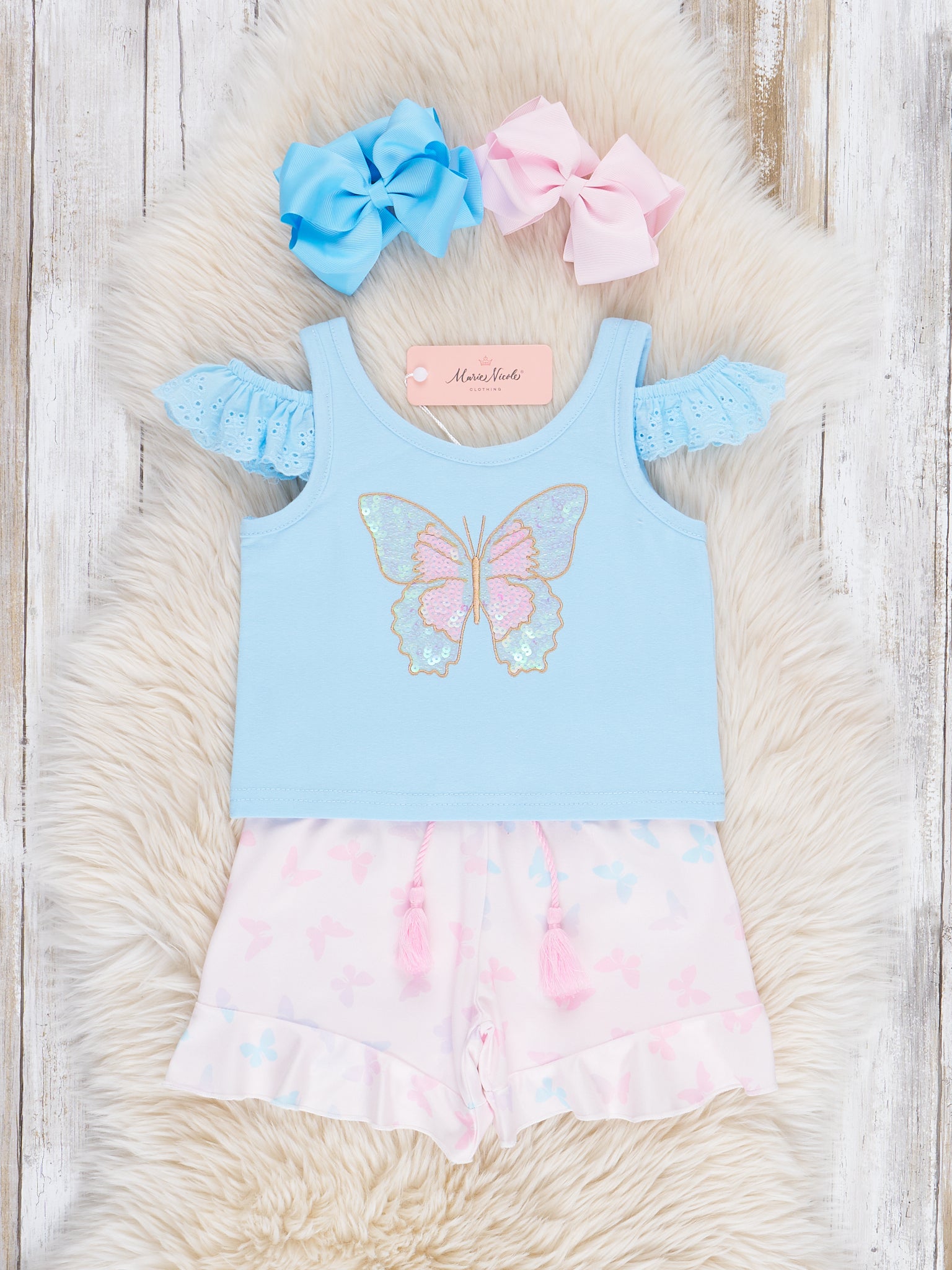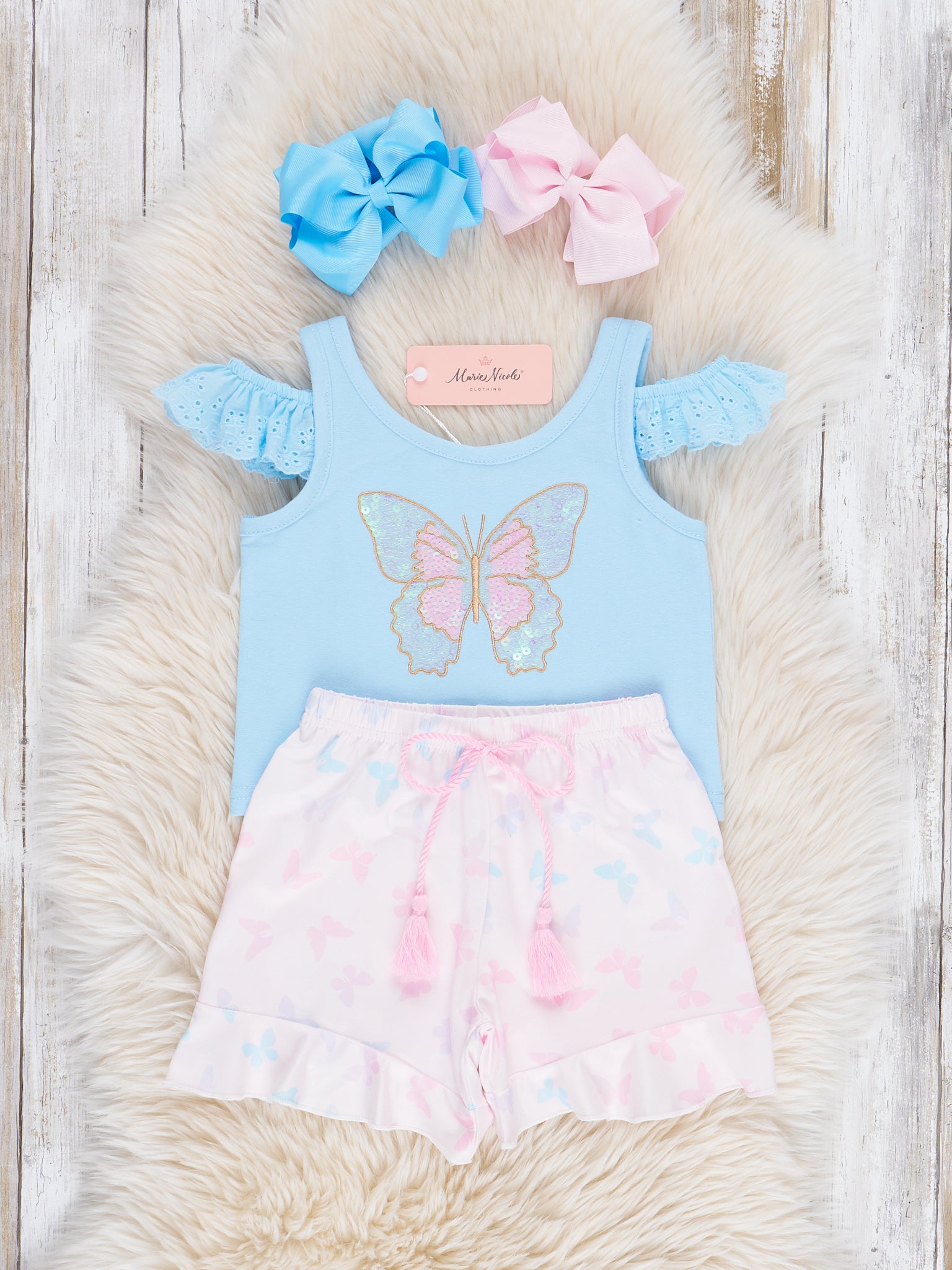 Get ready to flutter with delight in our Butterfly Wishes Ruffle Outfit! This adorable sister set features a blue cold shoulder top with a whimsical ruffle detail and sparkly sequin butterfly design. Paired with pink butterfly printed shorts that have a charming ruffle hem and tassel waist tie, this outfit is perfect for any little fashionista. By Marie Nicole Clothing.