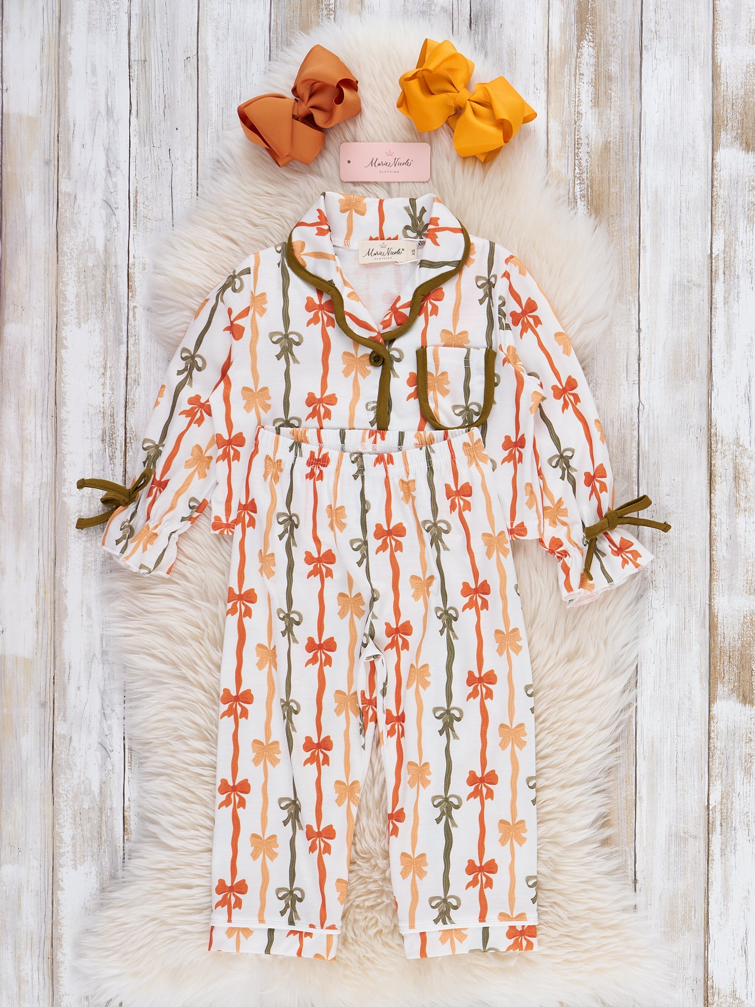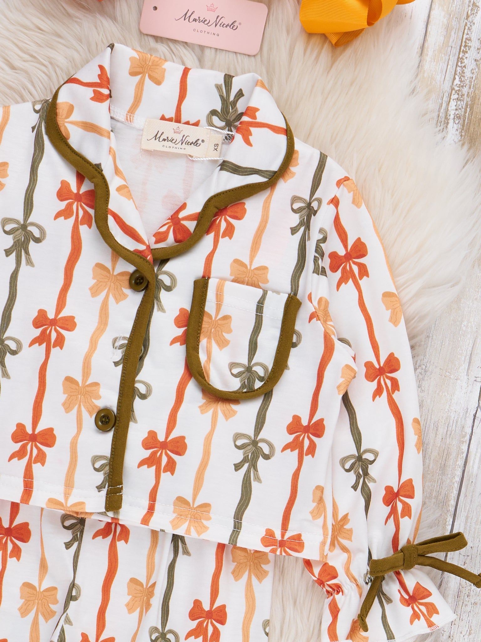 The Candlelight Bow Cropped Pajamas by Marie Nicole feature a button-up long sleeve top with a collar, bow accents, and a single chest pocket, alongside matching full-length pants. Decorated with an allover bow pattern, colored like the flames of a warm candle, this soft and cozy set makes bedtime stylish and comfortable